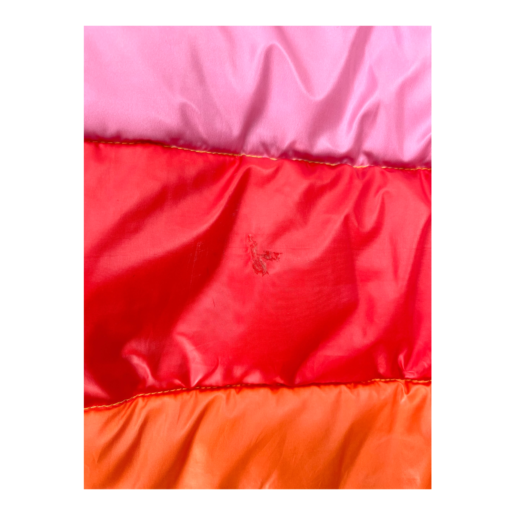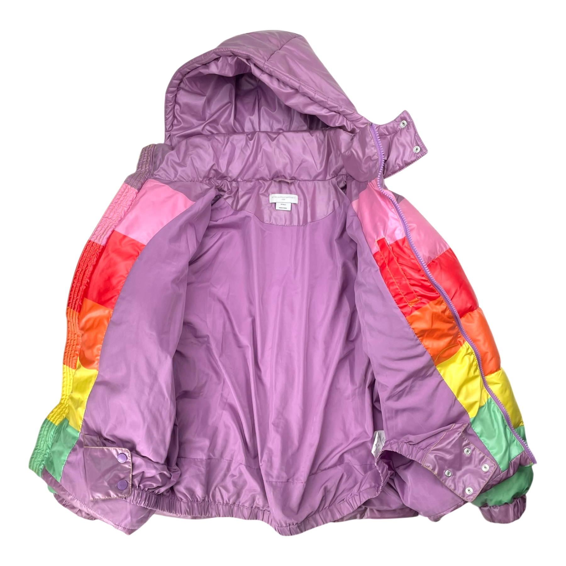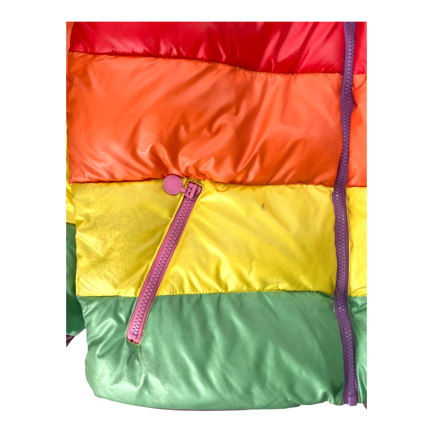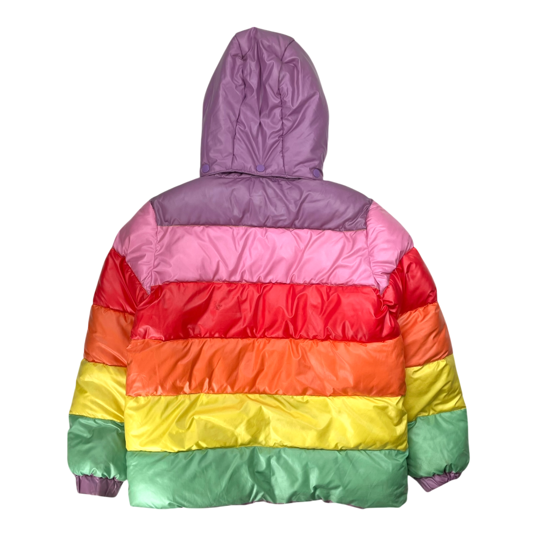 Stella McCartney puffer jacket in rainbow colors. The jacket features a snow lock, zippered pockets on the sides, a detachable hood and a small open pocket inside. The original size is 12 years old which corresponds to 150cm.