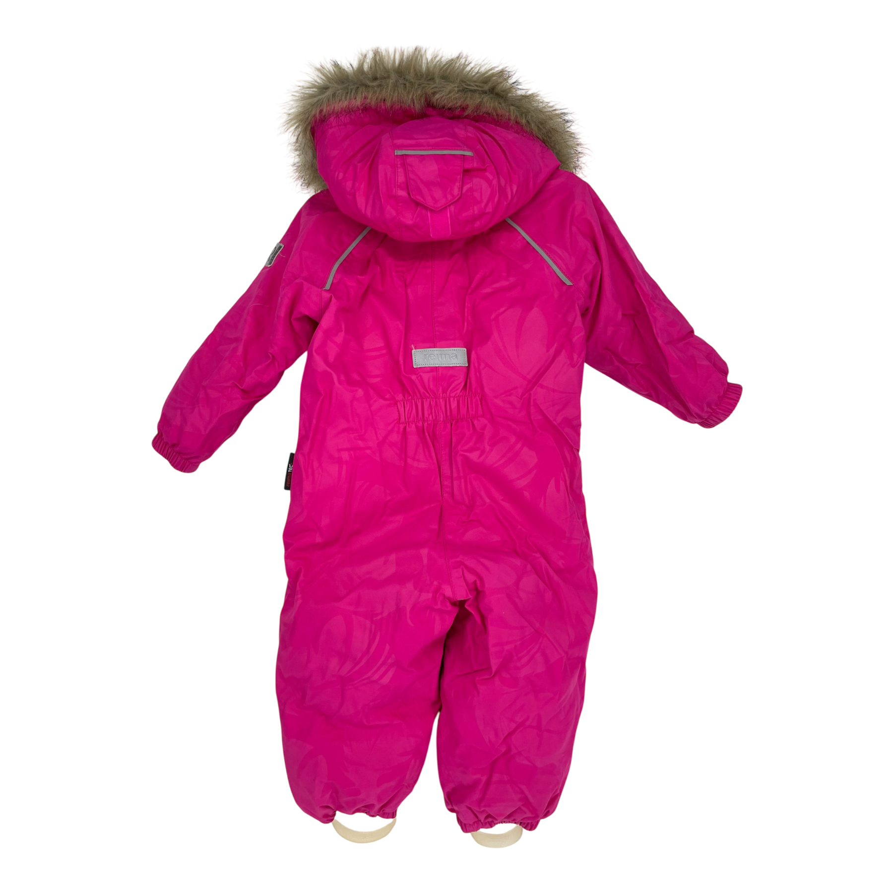 Reima Aaren winter overall with zip closure, detachable faux fur hood, one zip pocket, reflective details and durable foot loops. The fabric is strong, waterproof yet breathable material. The material is originally waterproof up to 10,000mm water column, and all the seams are sealed.