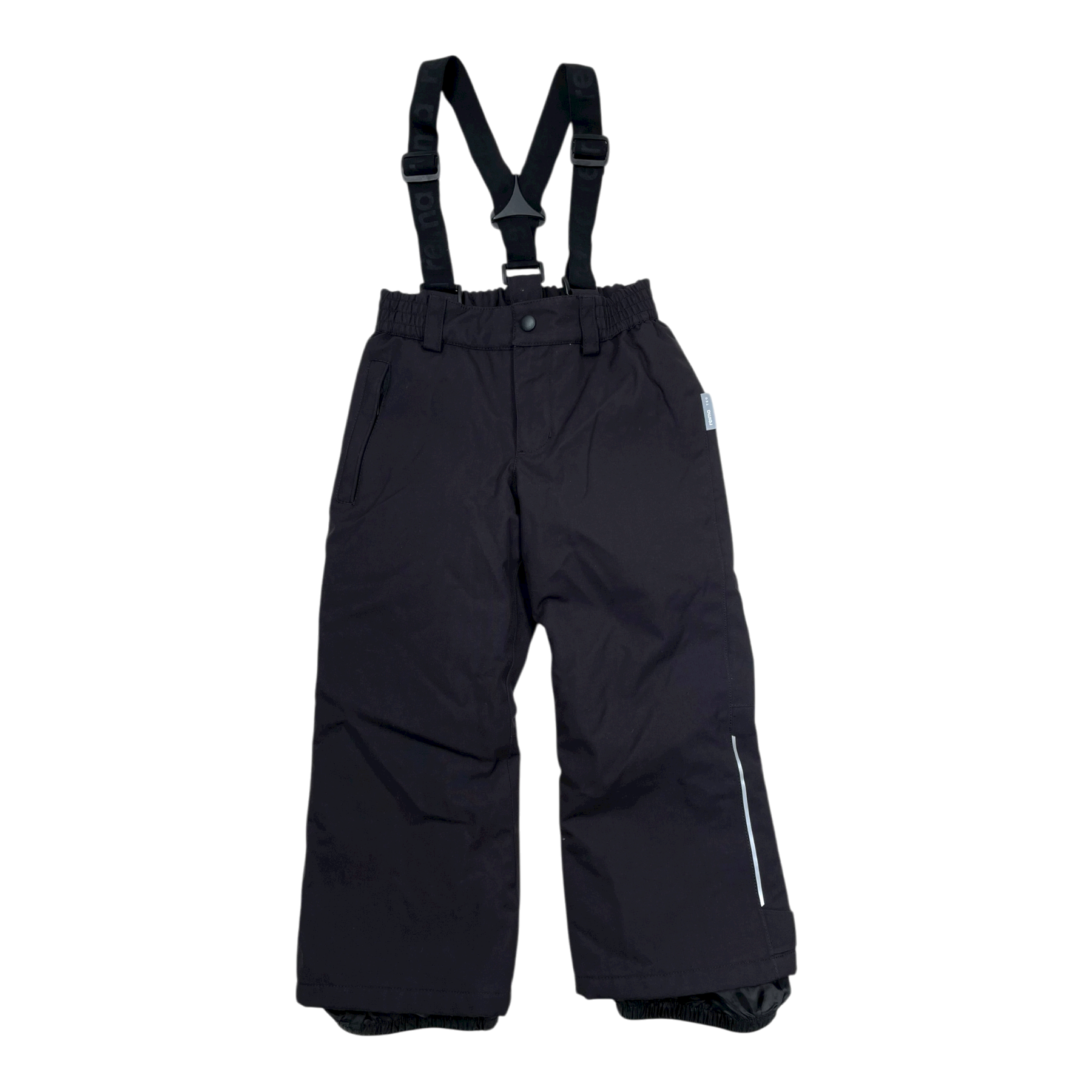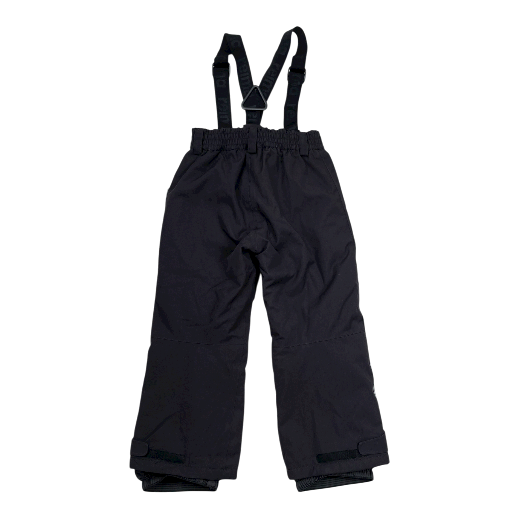 Reima Loikka outdoor pants with elastic and adjustable suspenders. Pants have a zip pocket, elastic waist, adjustable leg ends with snow locks.