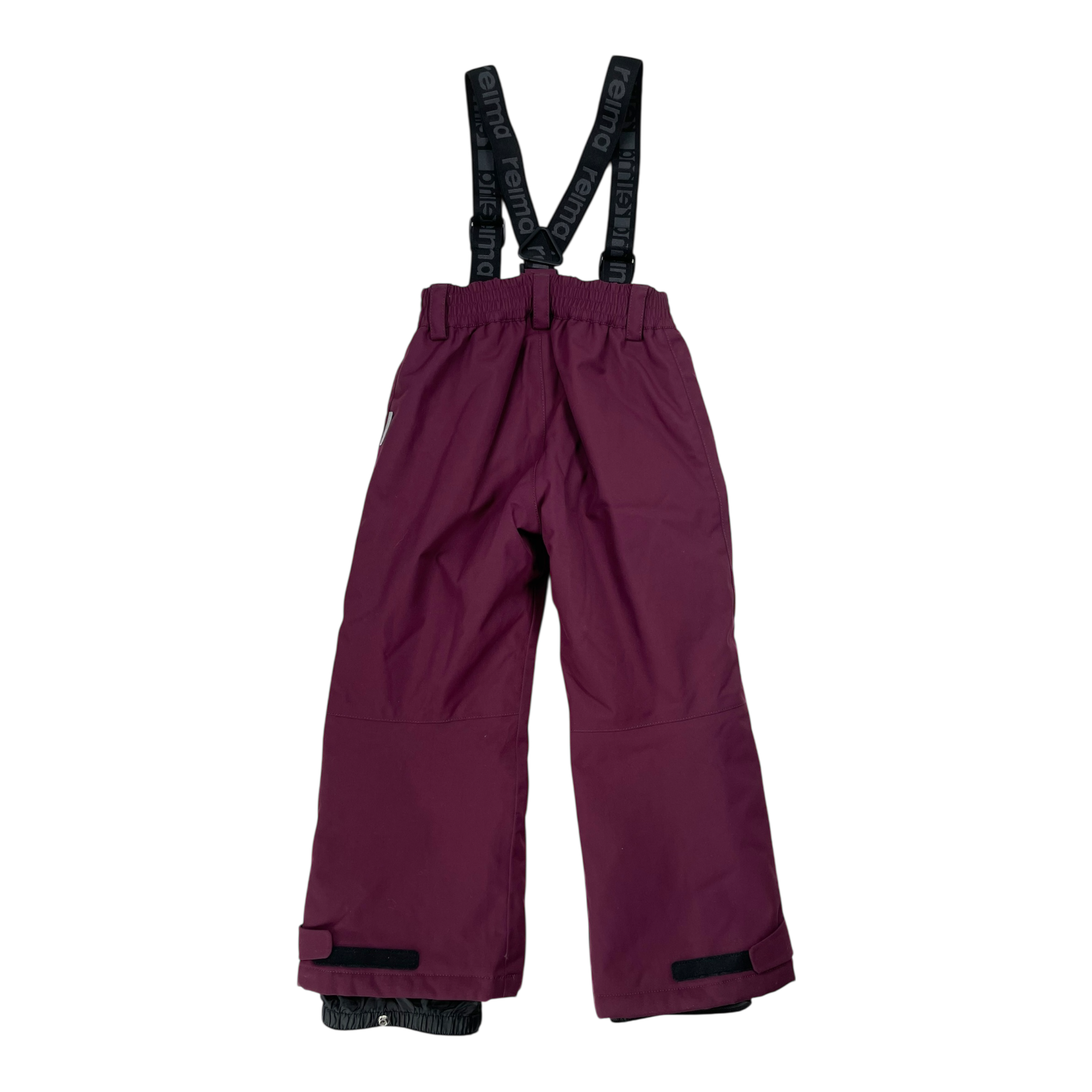 Reima Loikka outdoor pants with elastic and adjustable suspenders. Pants have a zip pocket, elastic waist, adjustable leg ends with snow locks.