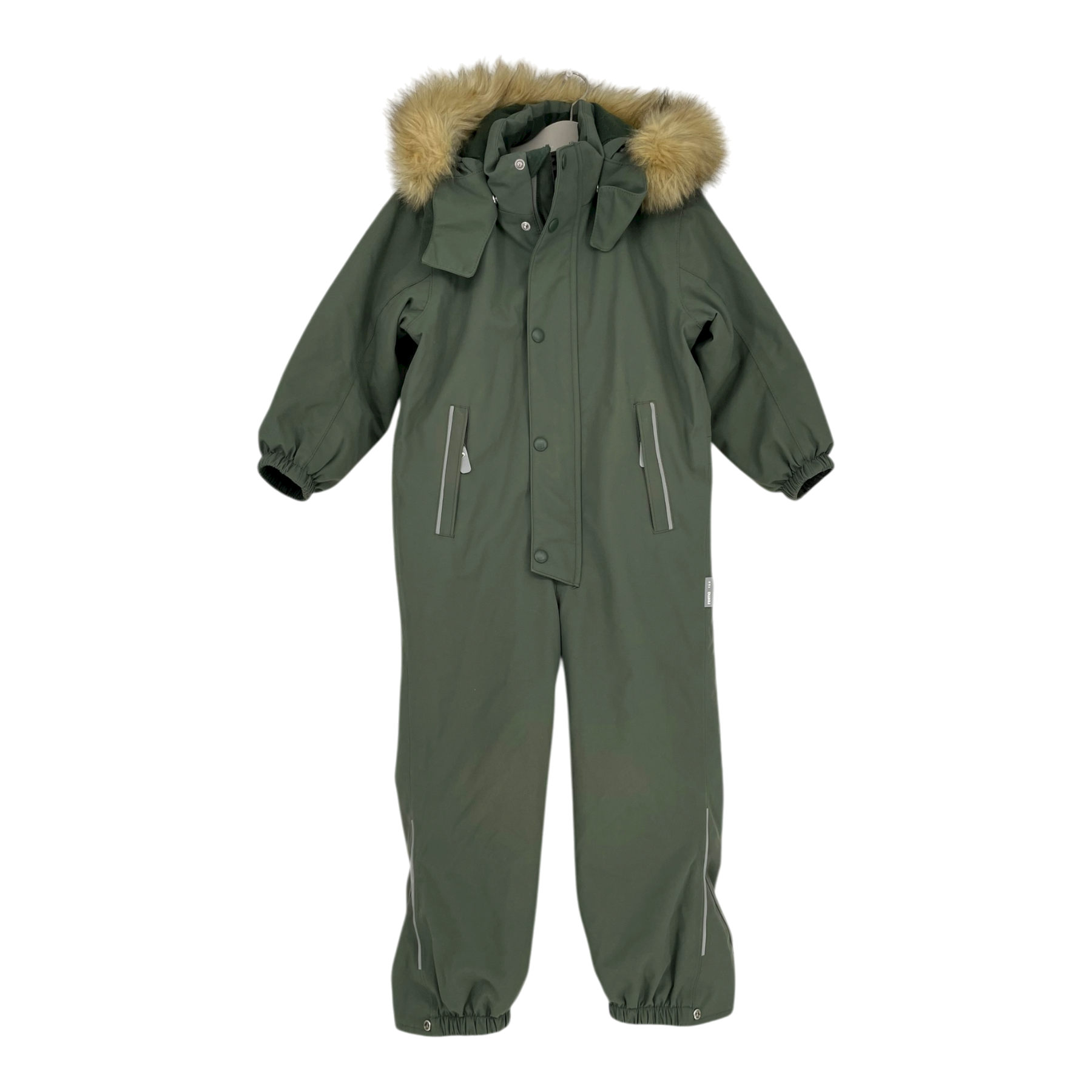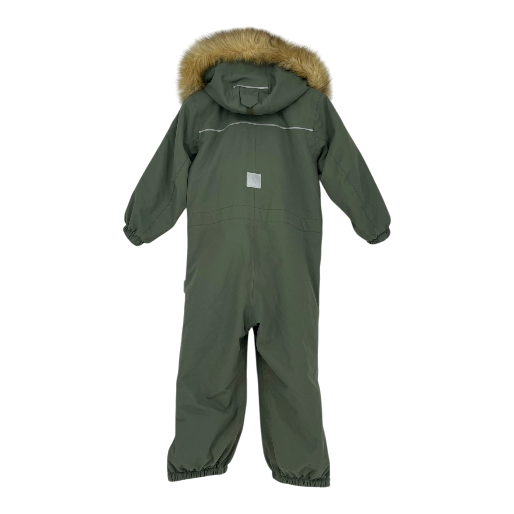 Reima Stavanger winter overall with zip closure, detachable faux fur hood, two zip pockets, reflective details, durable foot loops, and adjustable elastic on the waist. The fabric is strong, waterproof yet breathable material. The material is originally waterproof up to 10,000mm water column, and all the seams are sealed.