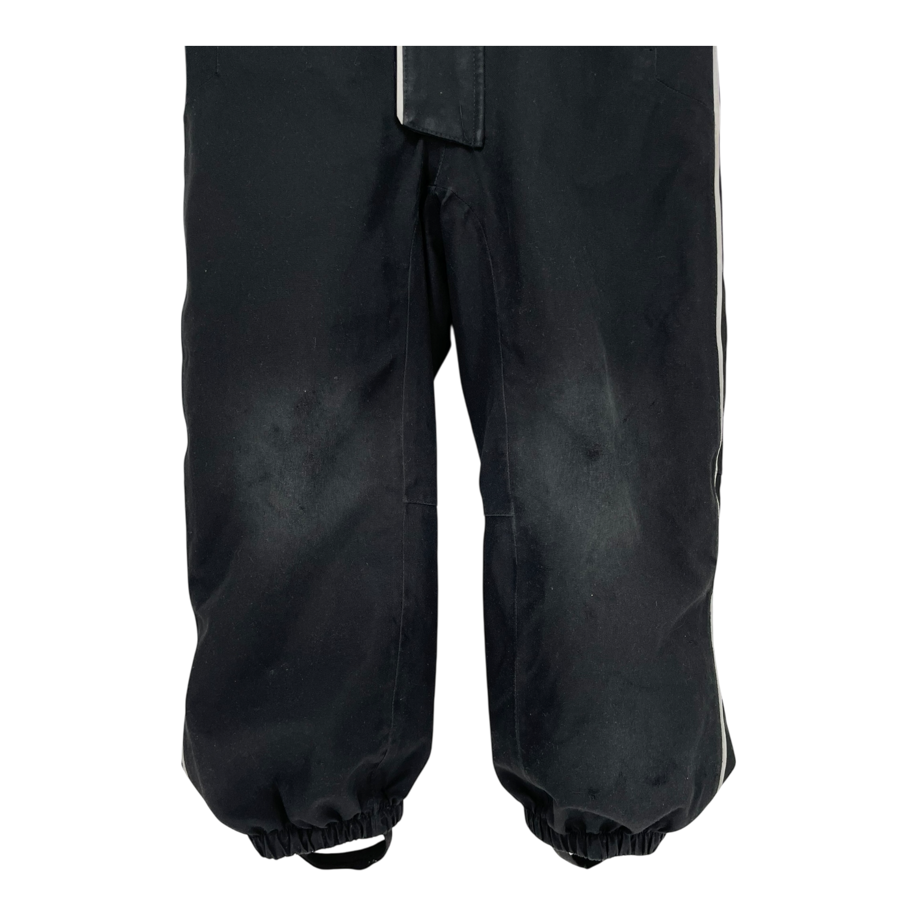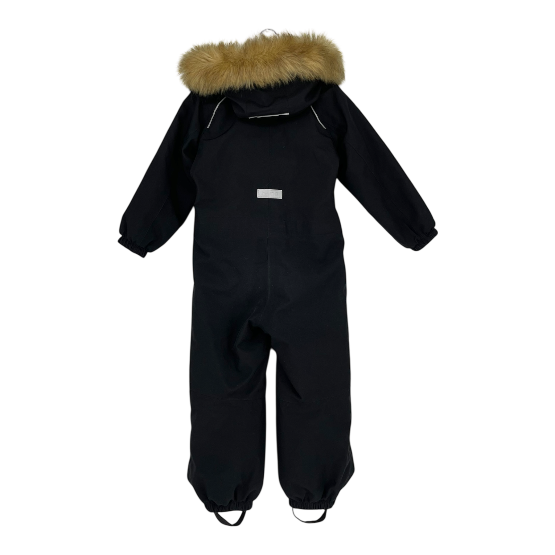 Reima Tromssa winter overall is waterproof and warm, yet breathable. Detachable hood, reflective details and adjustable waist. Foot loops in leg ends. The item has clear signs of use in the knee area.