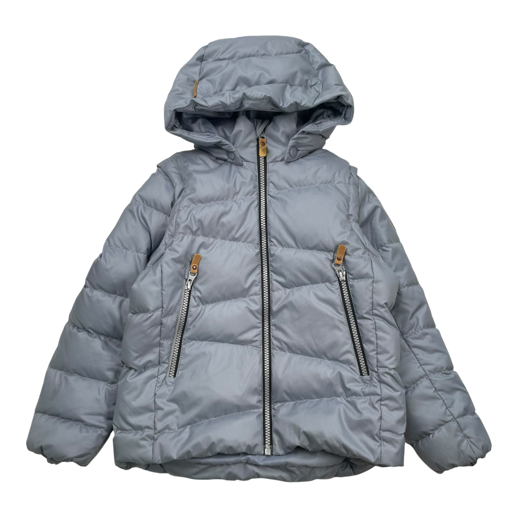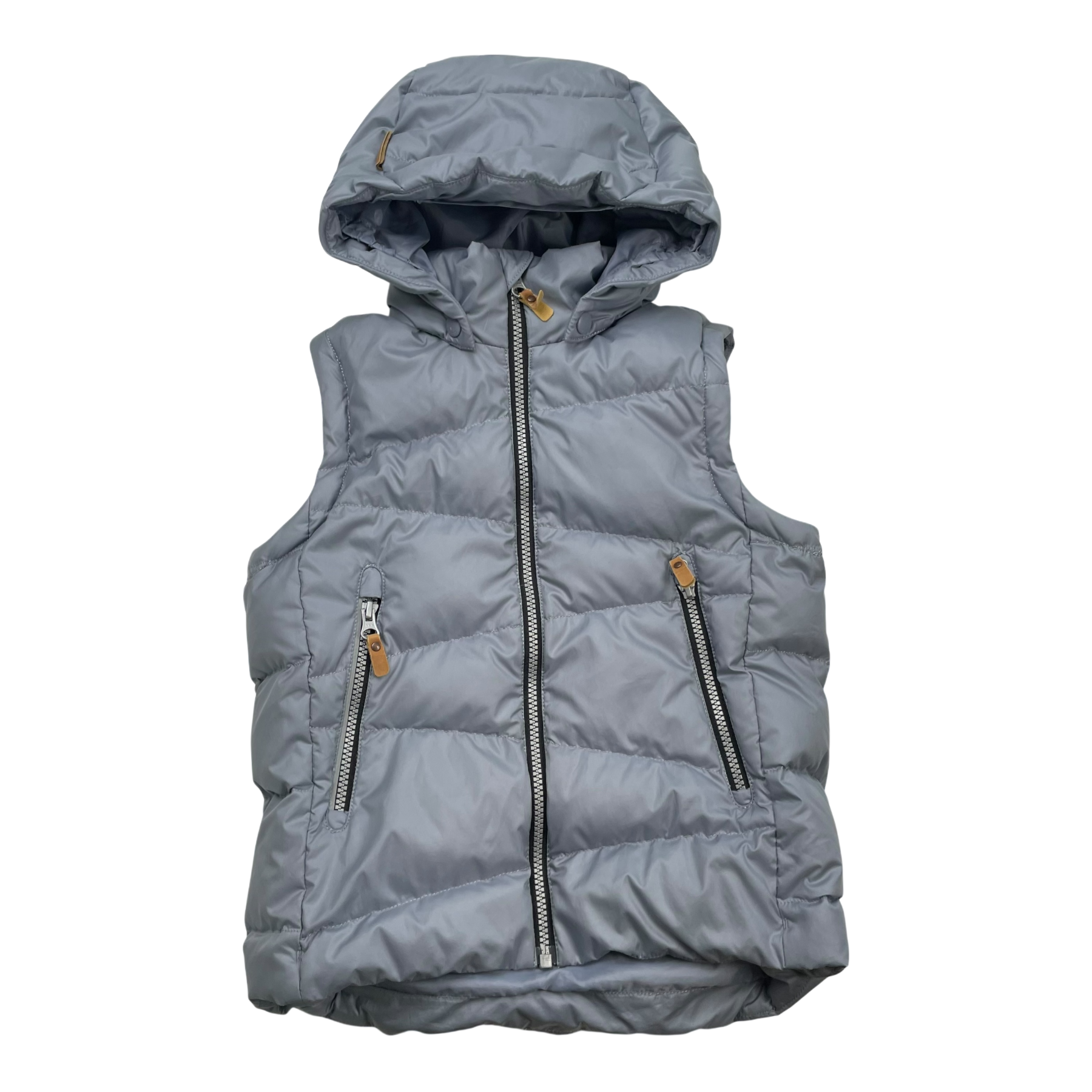 Reima Martti down jacket is super light yet warm and functional 2 in 1 down jacket that transforms into a vest by removing the sleeves. It has a detachable hood, zipper closure in the front and two side pockets.