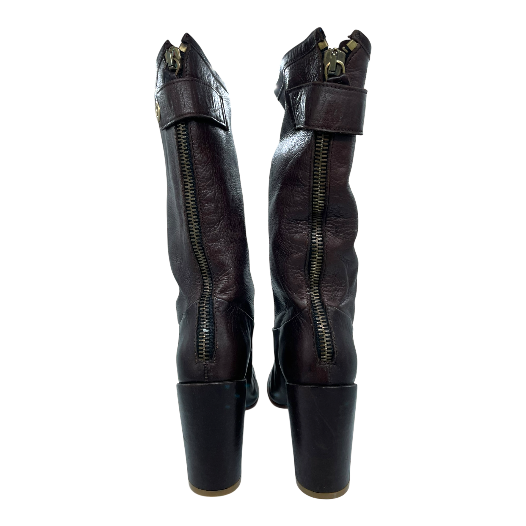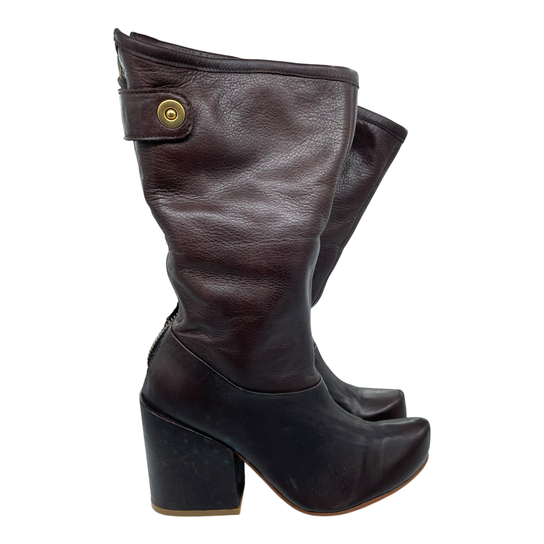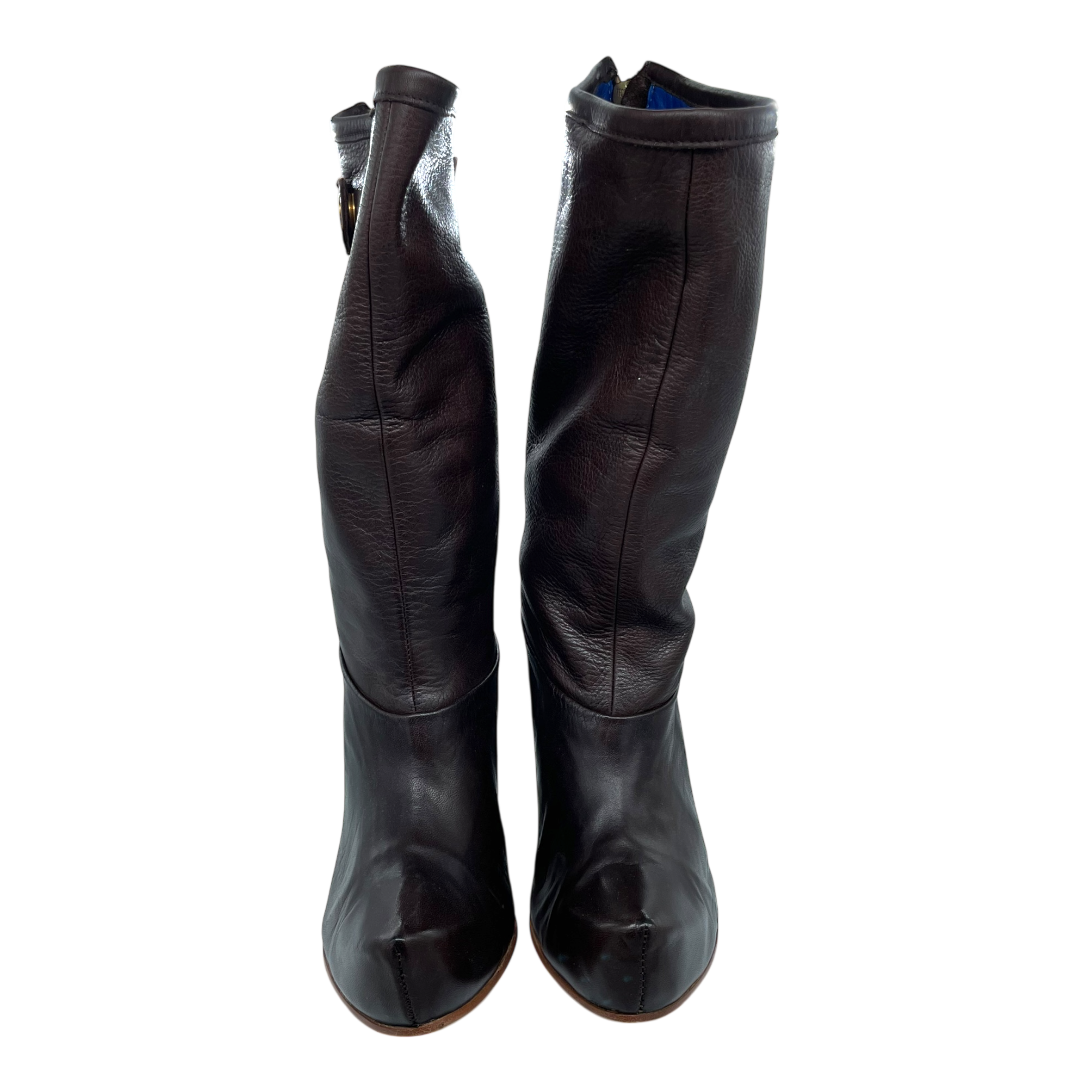 LUMI leather heeled boots with back zipper and buckle, featuring a pointed toe.