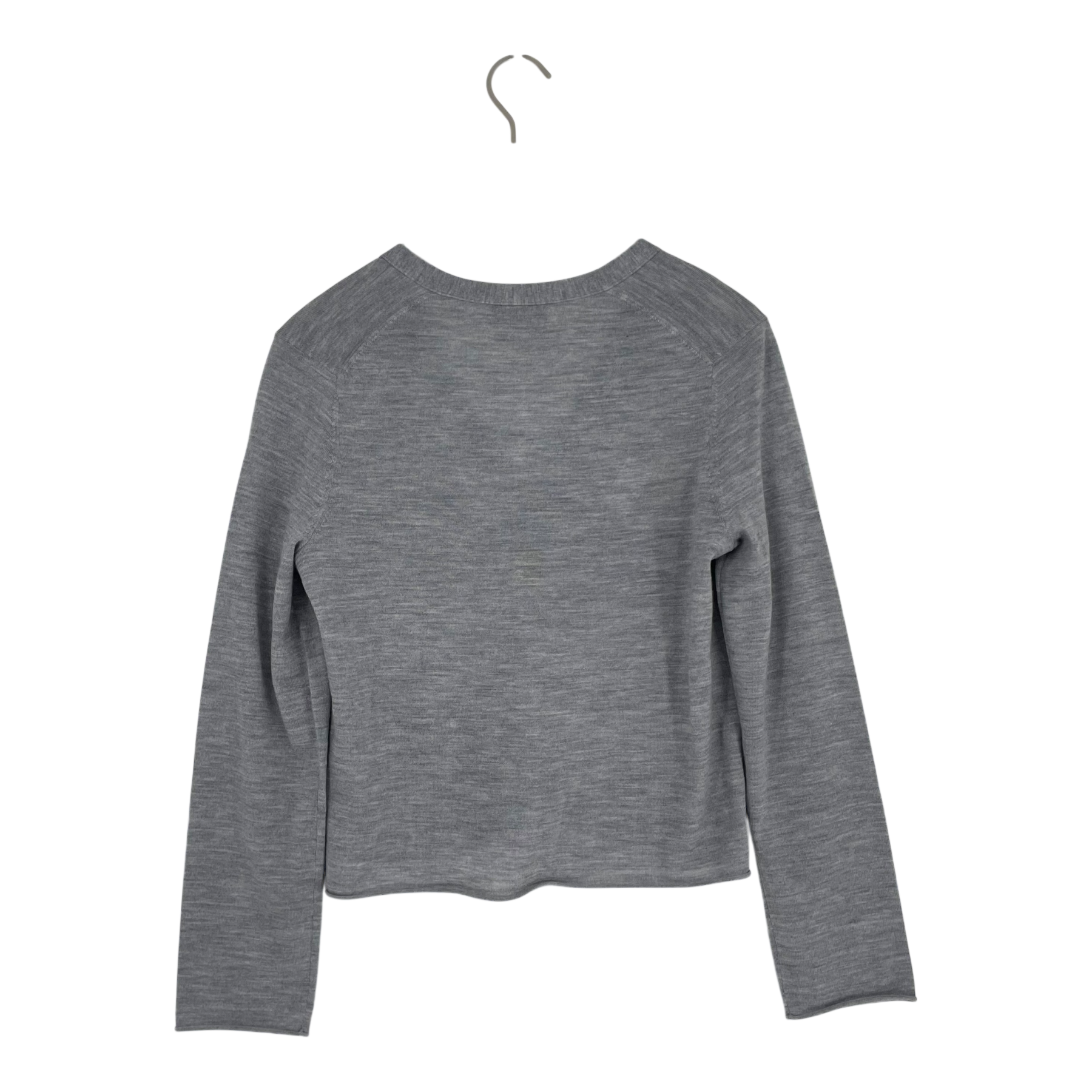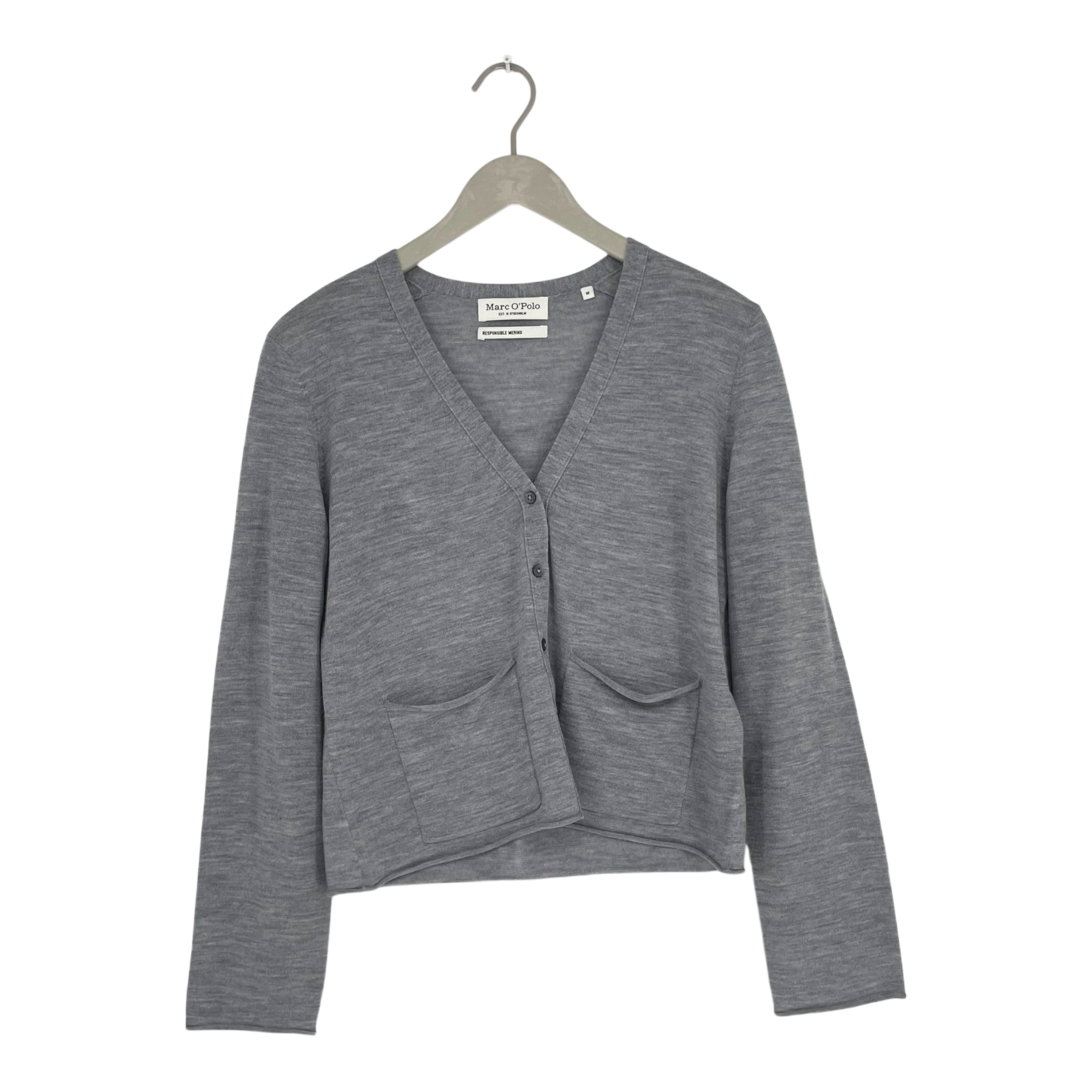 Marc O'Polo grey merino cardigan. This piece features a V-neck, button front closure, and two patch pockets at the front. It is crafted from responsible merino wool.