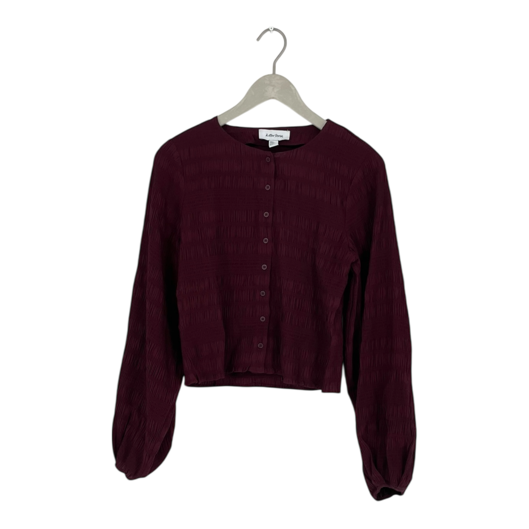 & Other Stories blouse with a button closure at the front. The material has a beautifully textured, crinkled finish, and the blouse features elegant flared sleeves. The cuffs are elasticated, creating a subtle puff-sleeve effect.