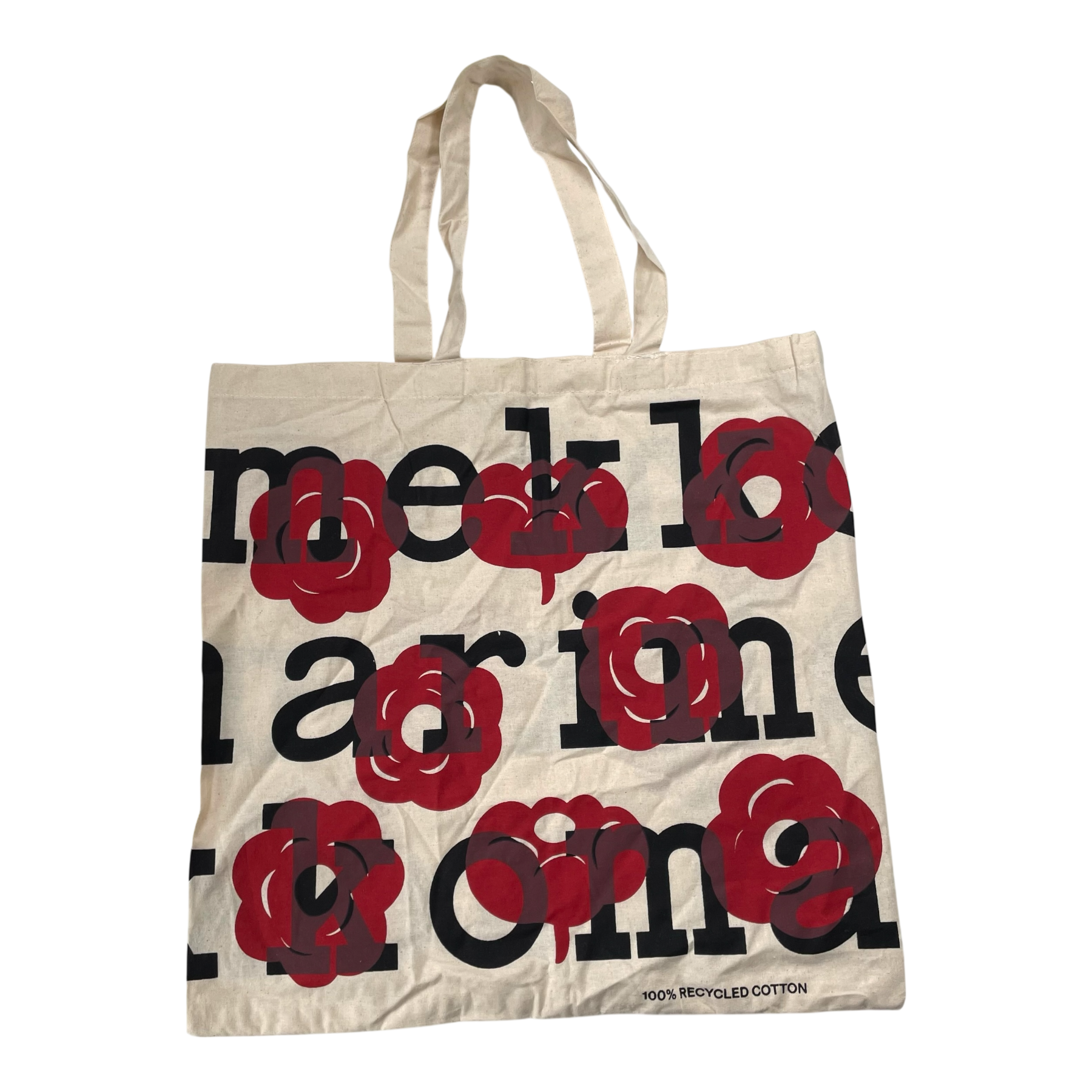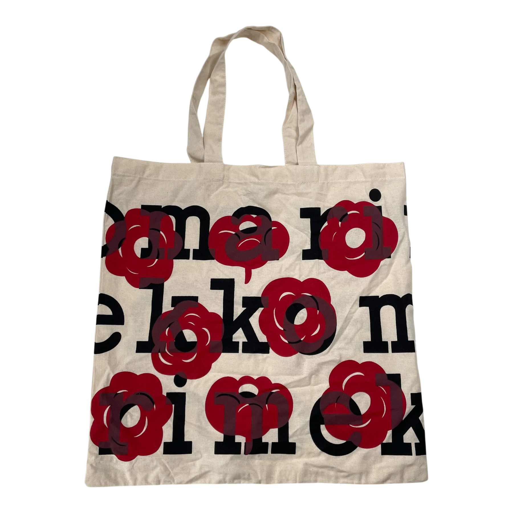 Marimekko tote shopping bag is made of lightweight cotton fabric, which features a logo pattern. The bag has two handles.