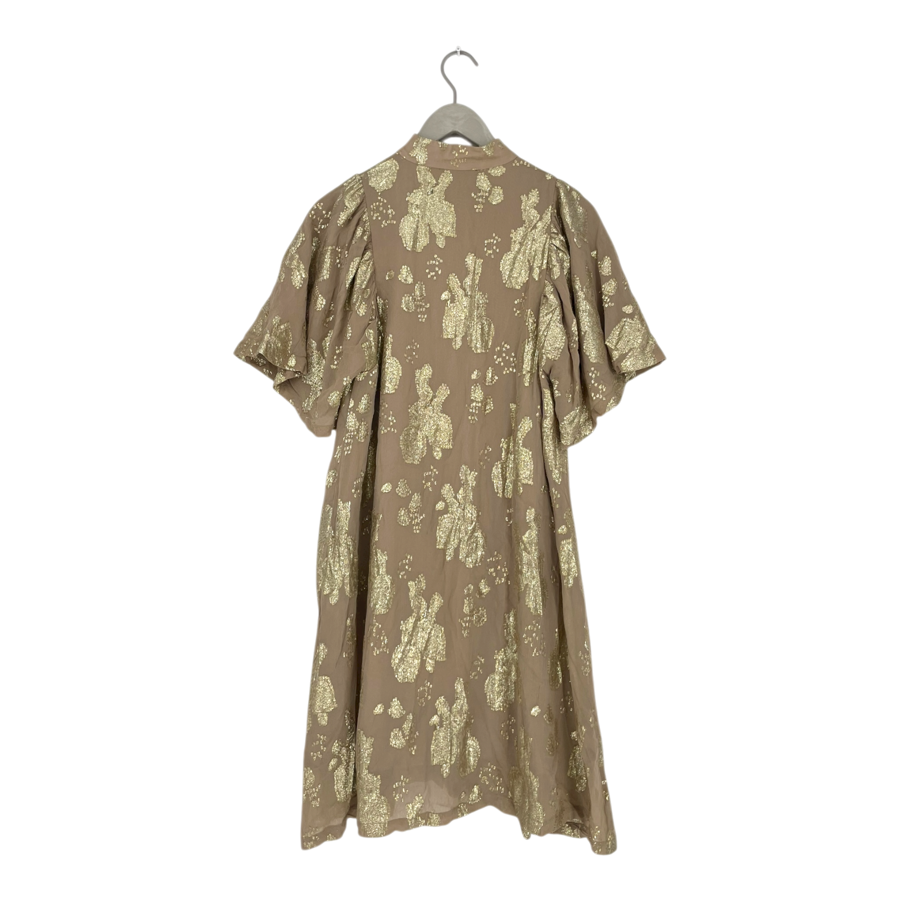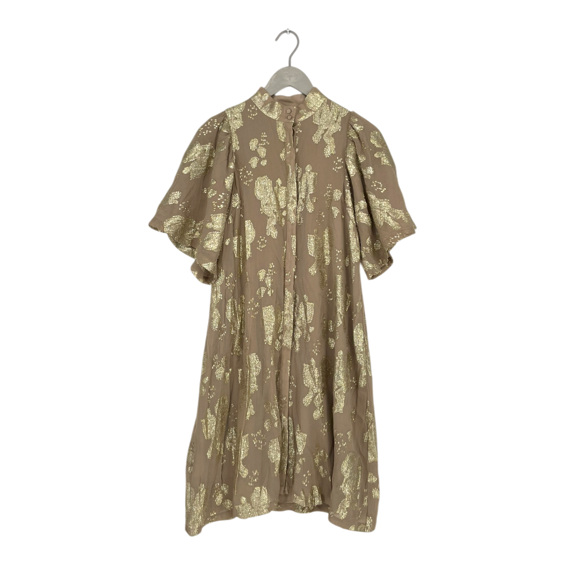 Bruuns Bazaar dress has buttons running from top to bottom. It comes with two spare buttons. The dress features beautiful, voluminous sleeves and is decorated with a metallic gold pattern.
