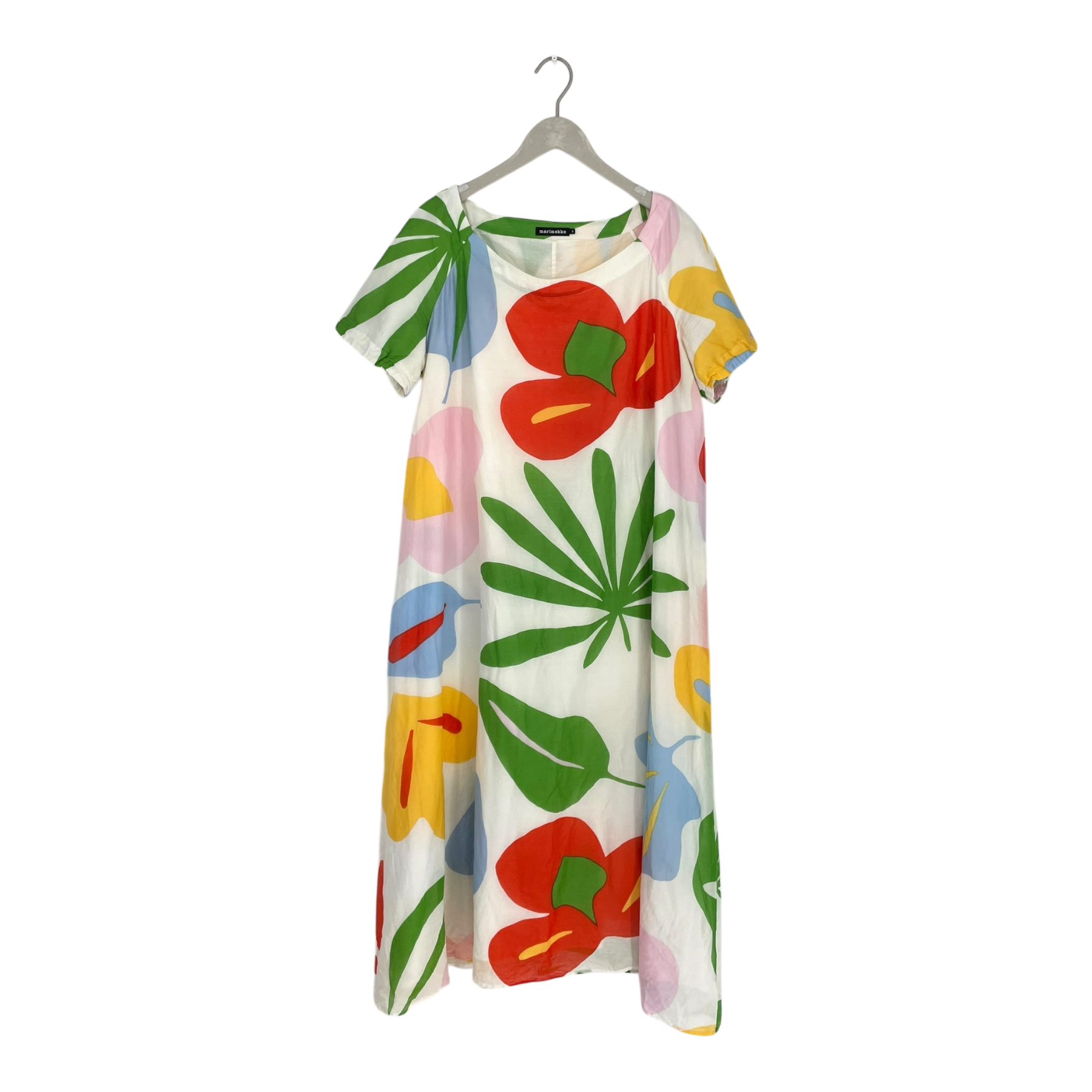 Marimekko Woven dress is crafted from lightweight cotton-silk and features the vibrant Väkevä viidakko print in natural white, red, and green tones. The dress has a lining, an open round neckline, and short raglan sleeves with elasticized cuffs. Its long A-line silhouette falls to mid-calf, creating a comfortable and elegant fit. The dress is in good overall condition, with only slight pilling under the arms.