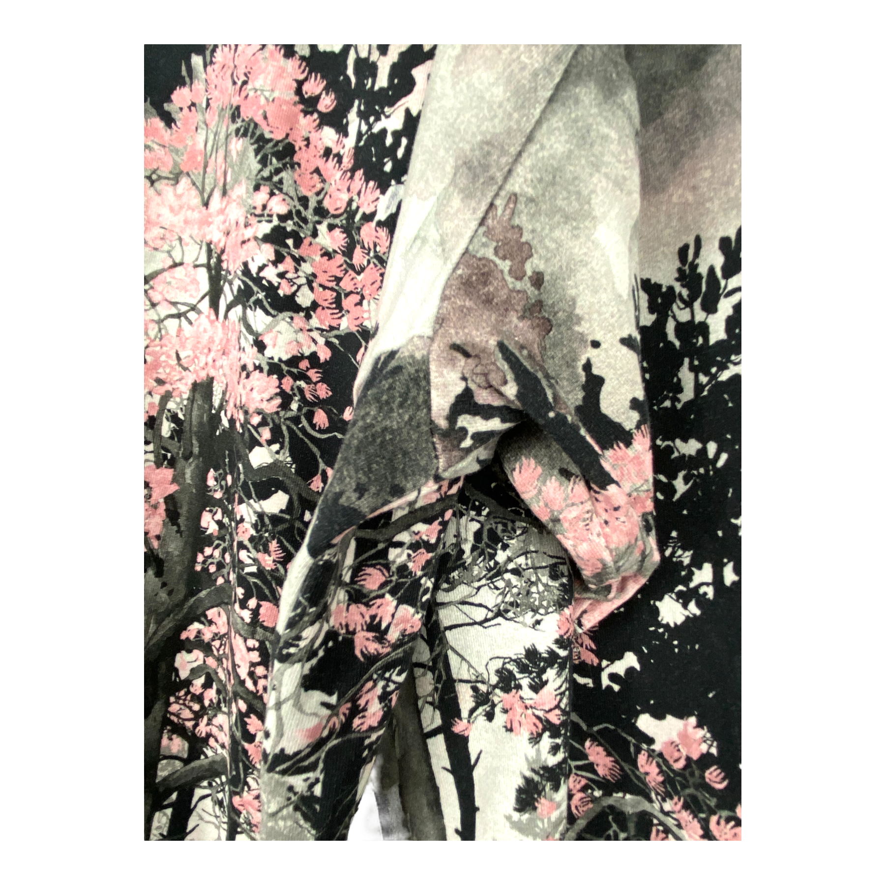 Ommellinen long sleeve dress in a flowering tree print with two front pockets.