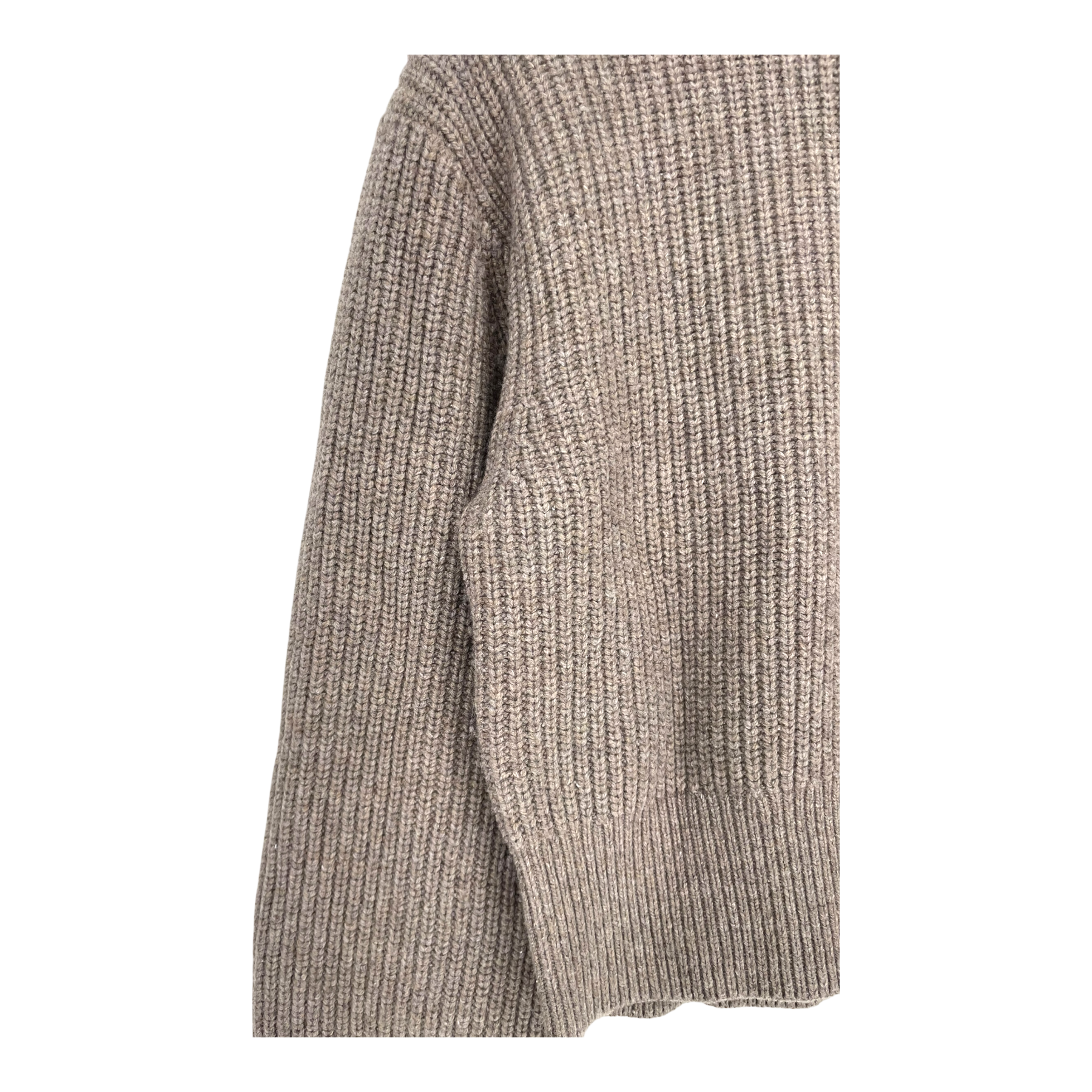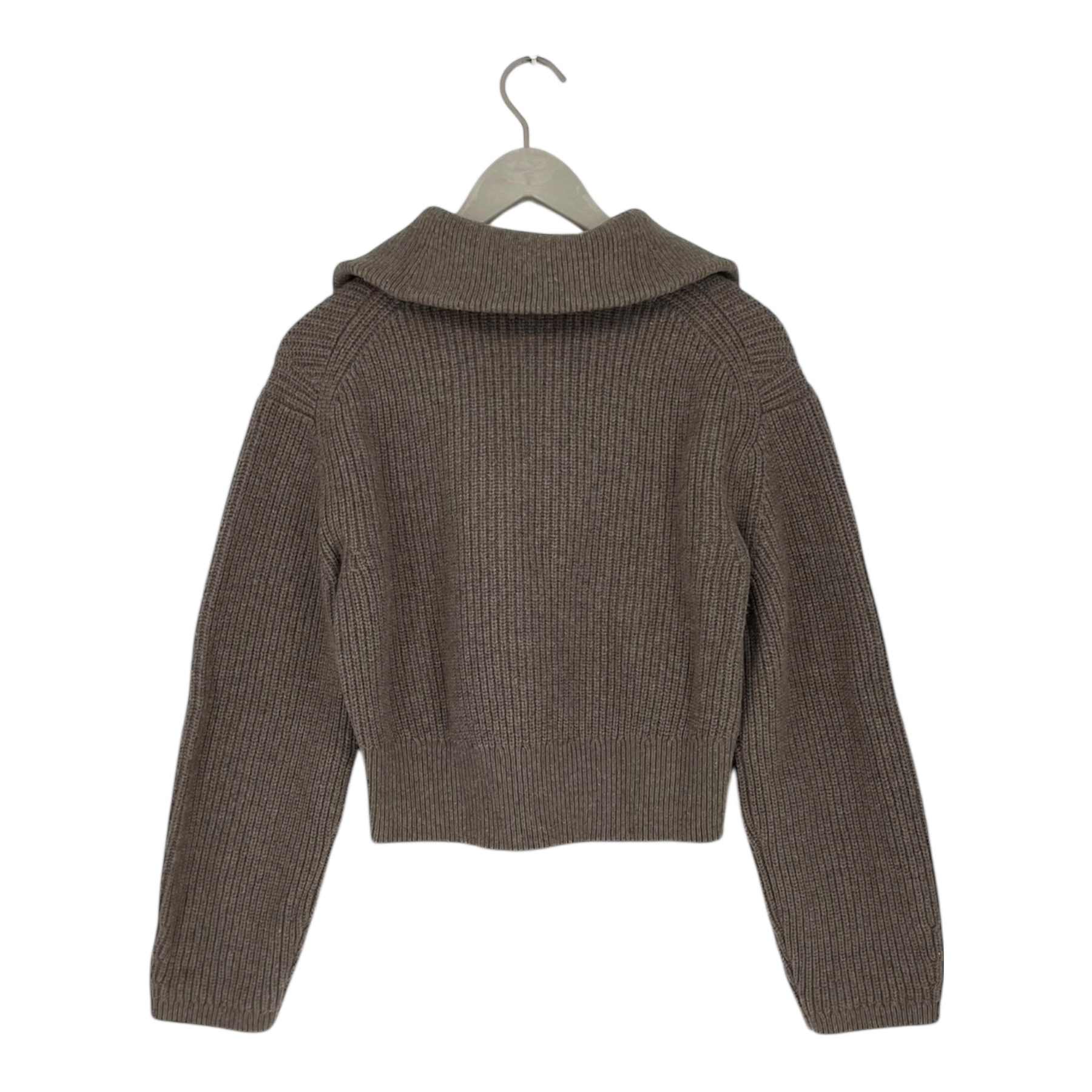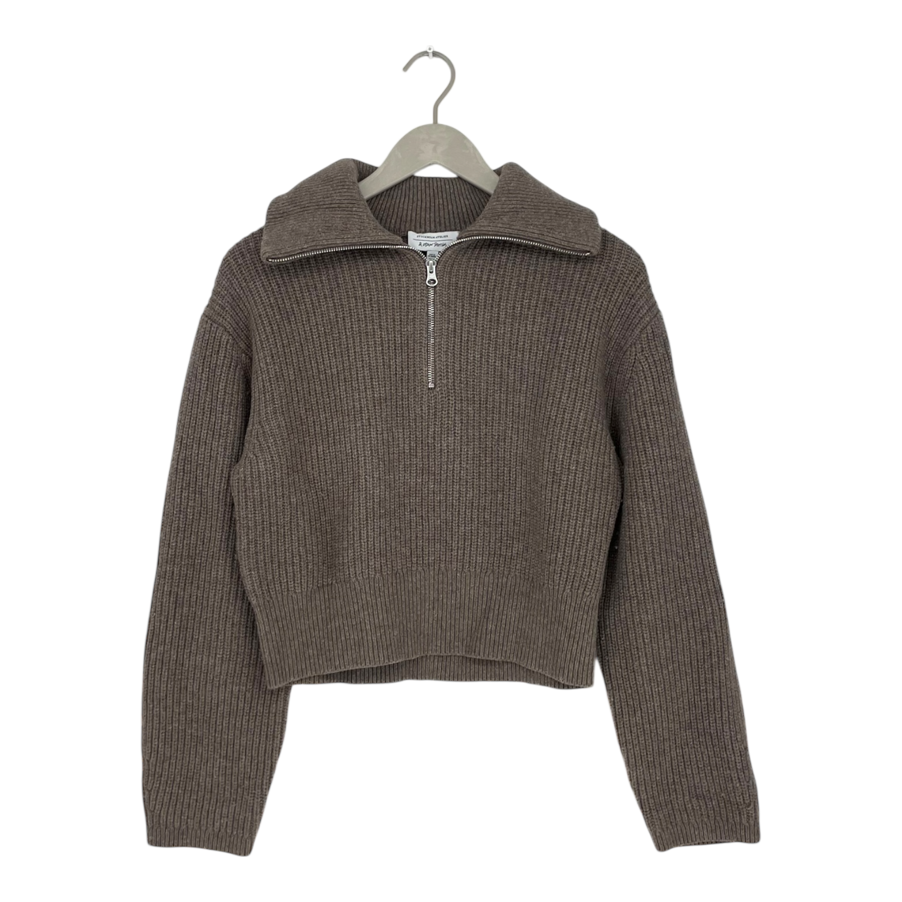 The & Other Stories brown knit sweater has a slightly cropped cut and features a high collar with a zipper. The knit is soft and stretchy, and the fit is relaxed.