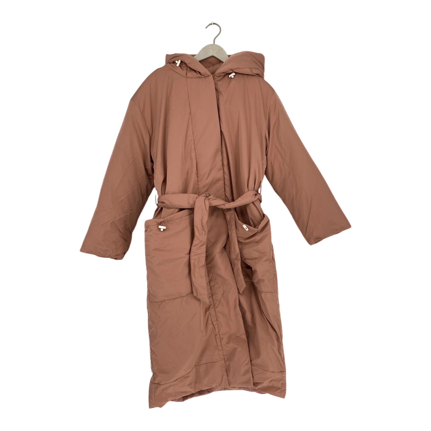 Inspired by those cold winter mornings when you just don’t want to get out of your bathrobe. Padded out with our super cosy no-down filler, sporting oversized pockets with adjustable draw-chords, and of course a large belt and adjustable hood for extra comfort.