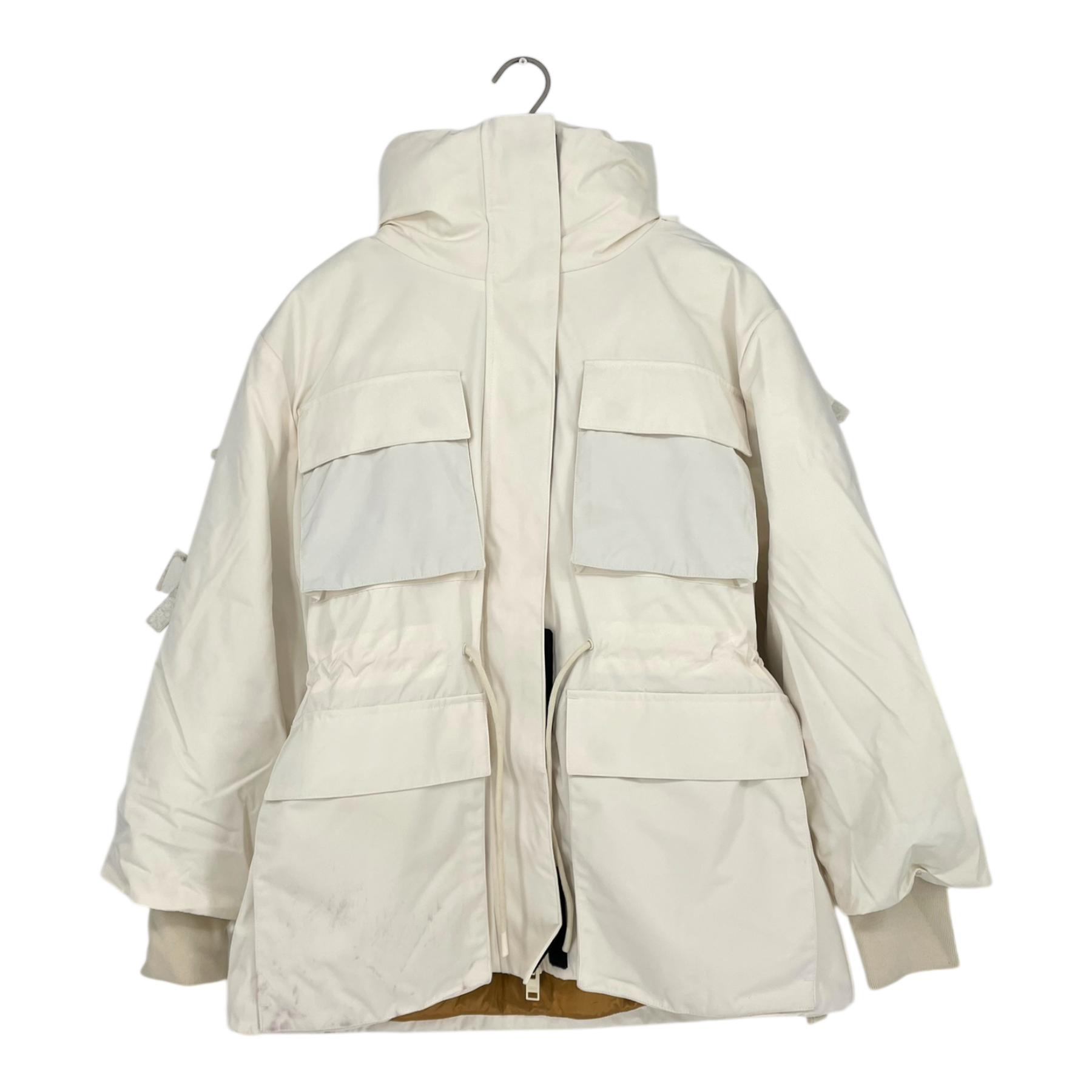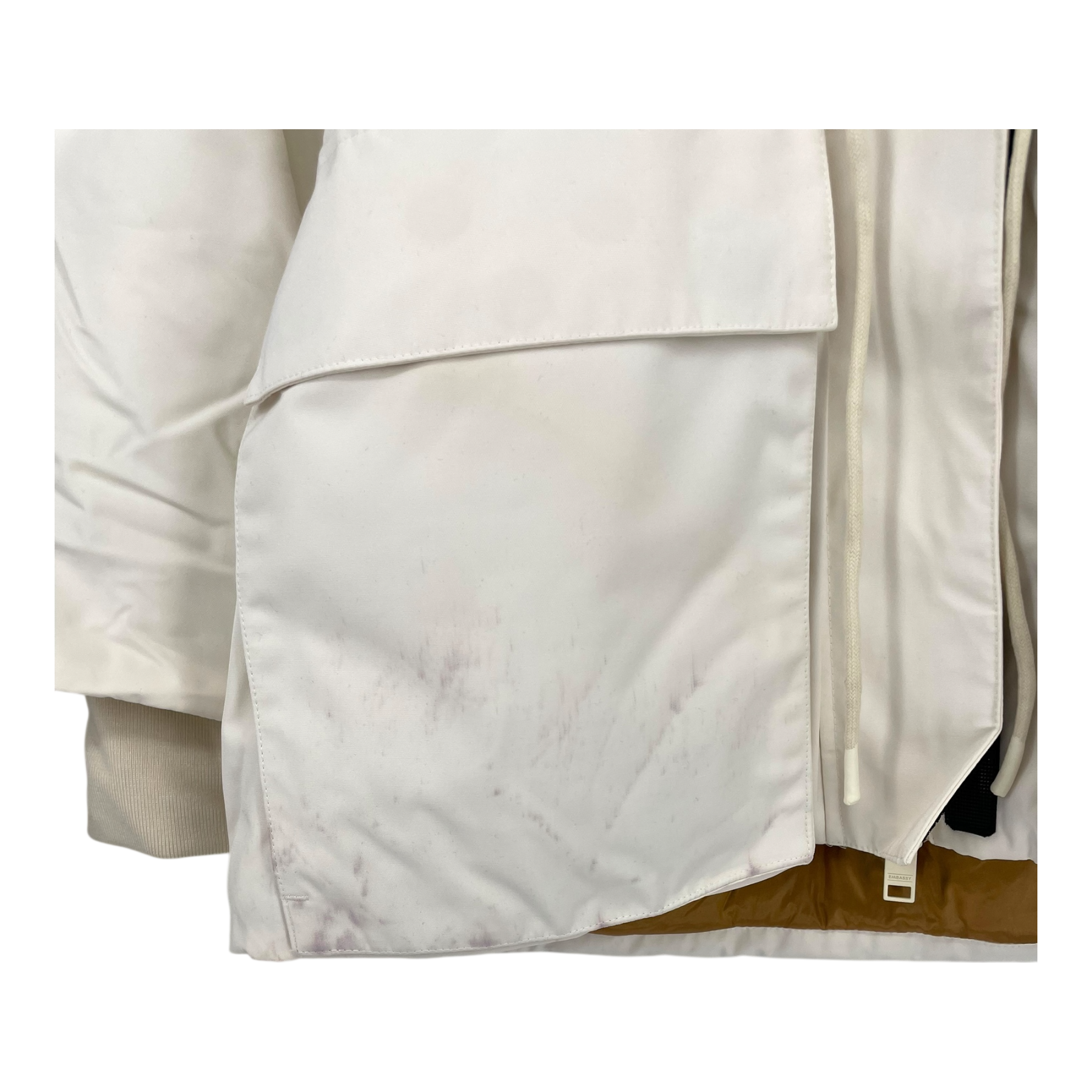 Embassy of Bricks and Logs Norfolk parka jacket. The ultimate parka to really sink into. Oversized and toughwearing, yet equally feminine with its adjustable drawstring waist. Made from premium waterproof fabric and a unique metal foil lining, the Norfolk also has large storage pockets, and an adjustable hemand hood. The item is a sample. Note there are some visible stains on the front pocket.