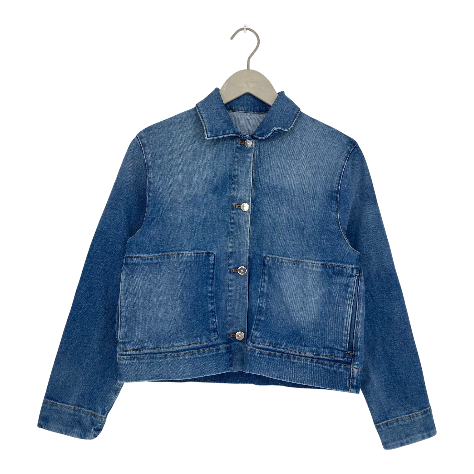 Mud Jeans Denim jacket has button closure in the front, two side pockets and a cropped fit.