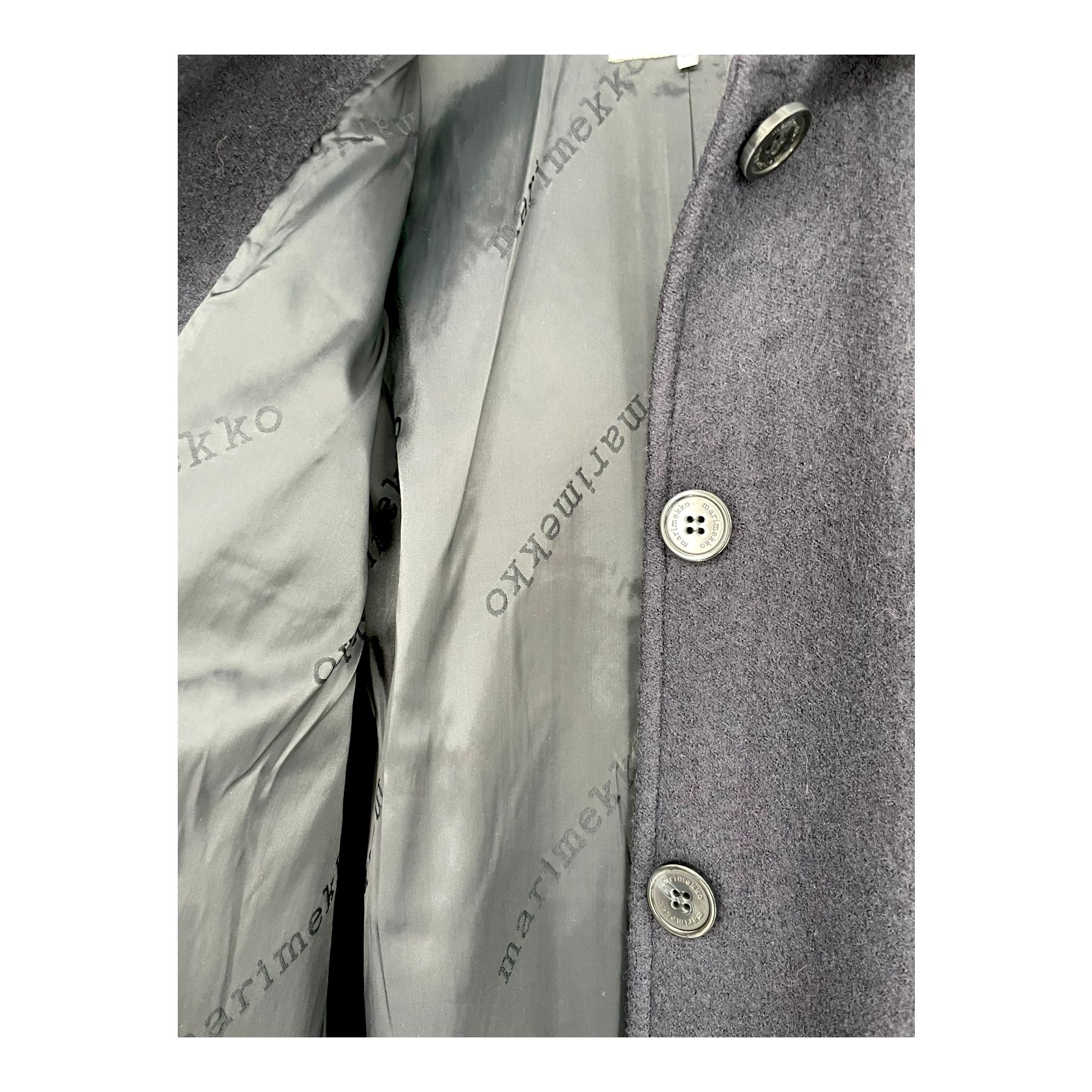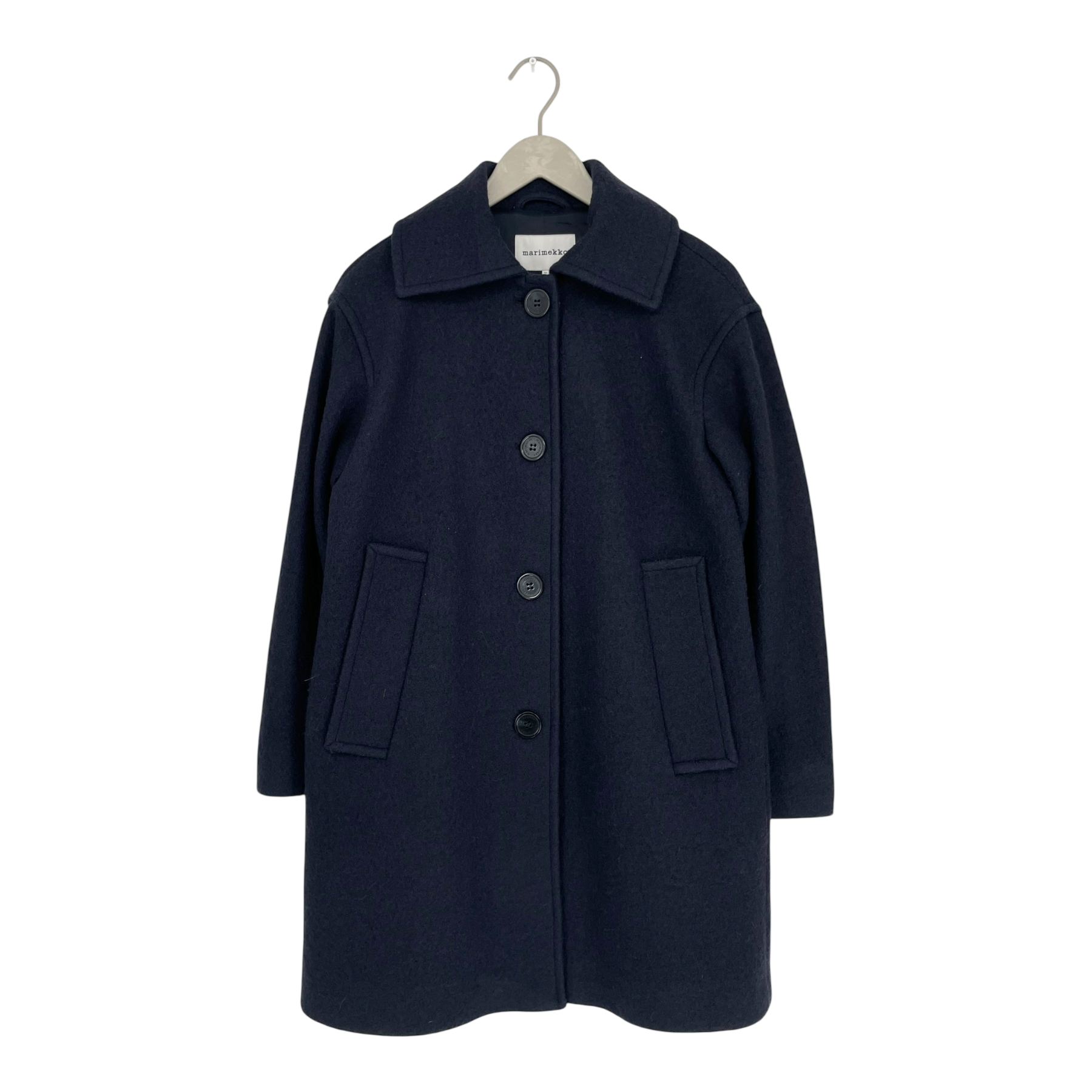 Marimekko Hedda coat is made of a boiled wool mix with stand-up collar, diagonal front pockets, button closure and mid thigh length. The Hedda coat gives a classic silhouette and warmth for winter weather.