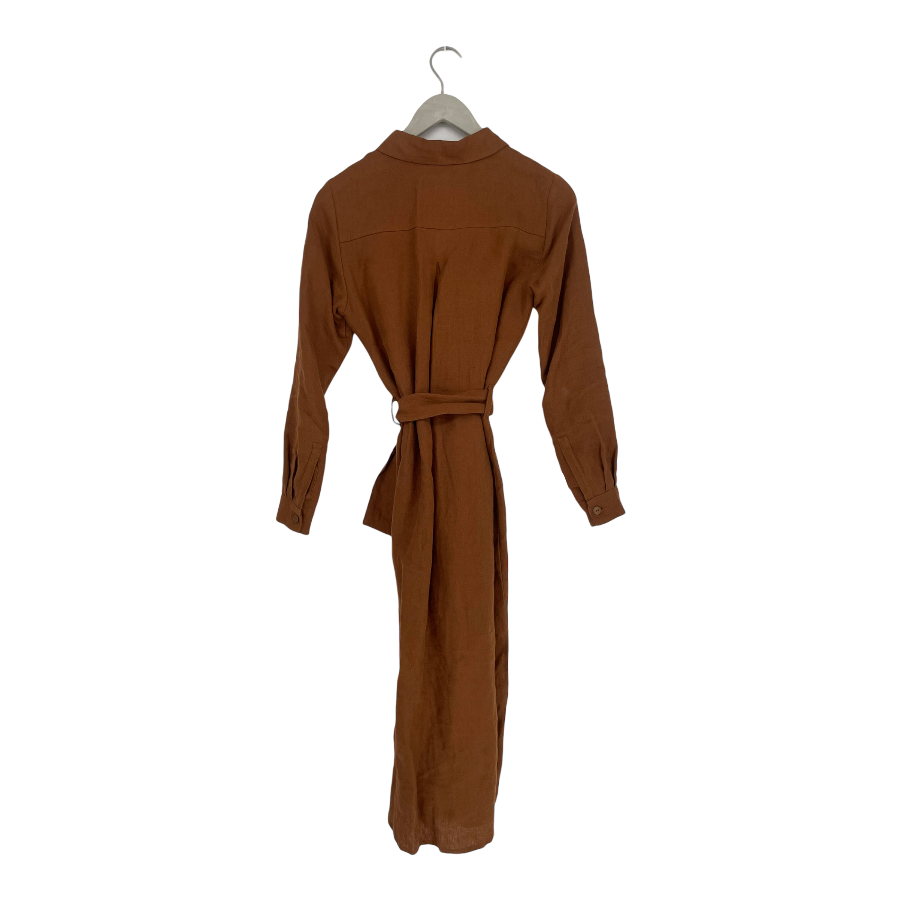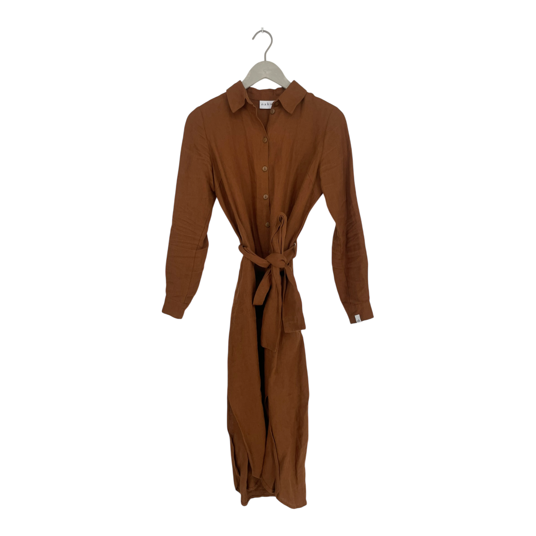 Nakoa fully buttoned linen dress with detachable fabric belt and slits on the sides. One very light stain and loosened threads, as shown in the pictures.