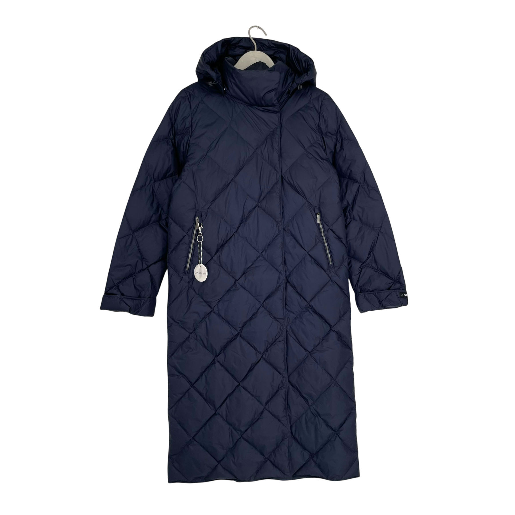 Joutsen lempi jacket is a light down jacket with a diagonal stitching. The two halves of the coat overlap in the front which adds to the feeling fo being wrapped in comfortable warmth. There is two vertical side pockets with zippers and a snap button closure in the front. The tightness of the hood can be adjusted with a drawstring and the hood can be unattached with buttons. Sleeves can be rolled up for a better fit.