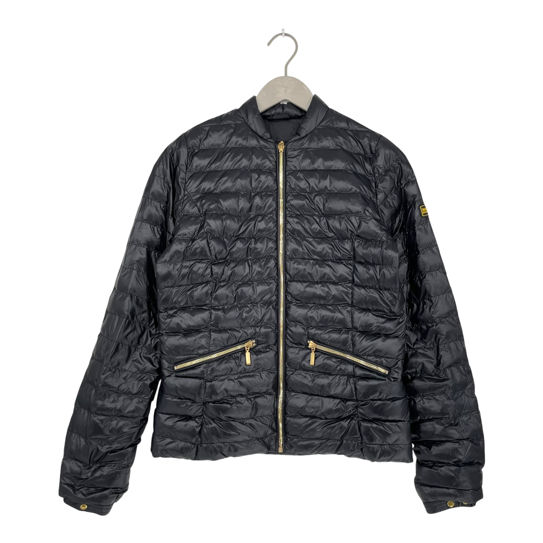 Barbour light padded jacket with golden zipper details.