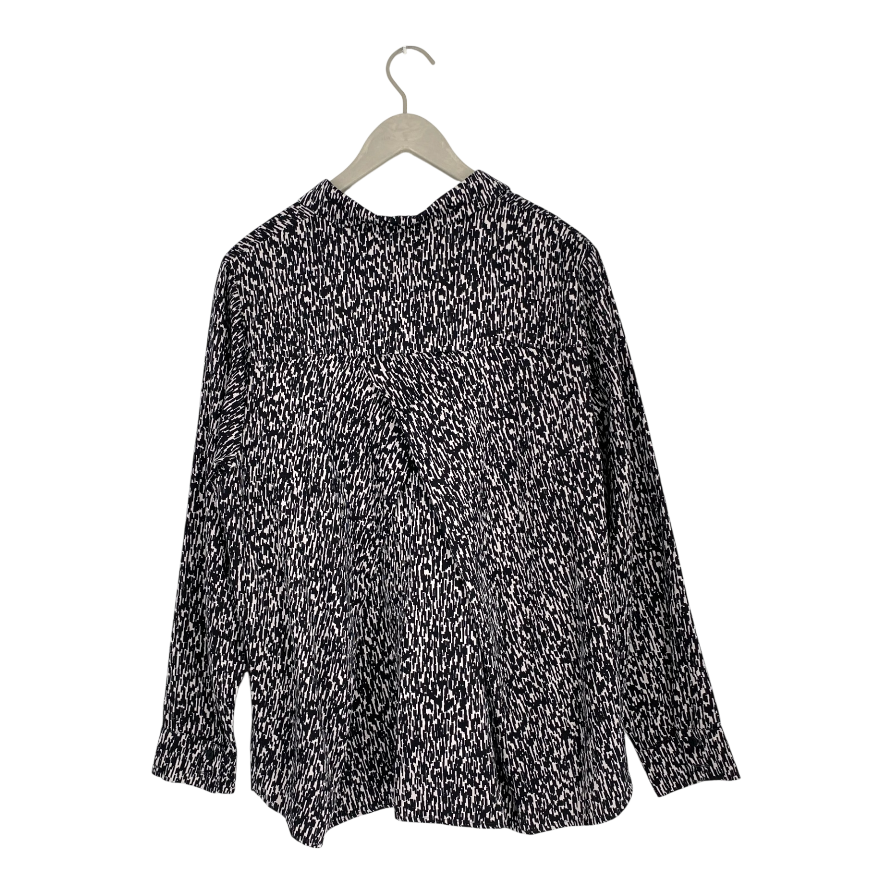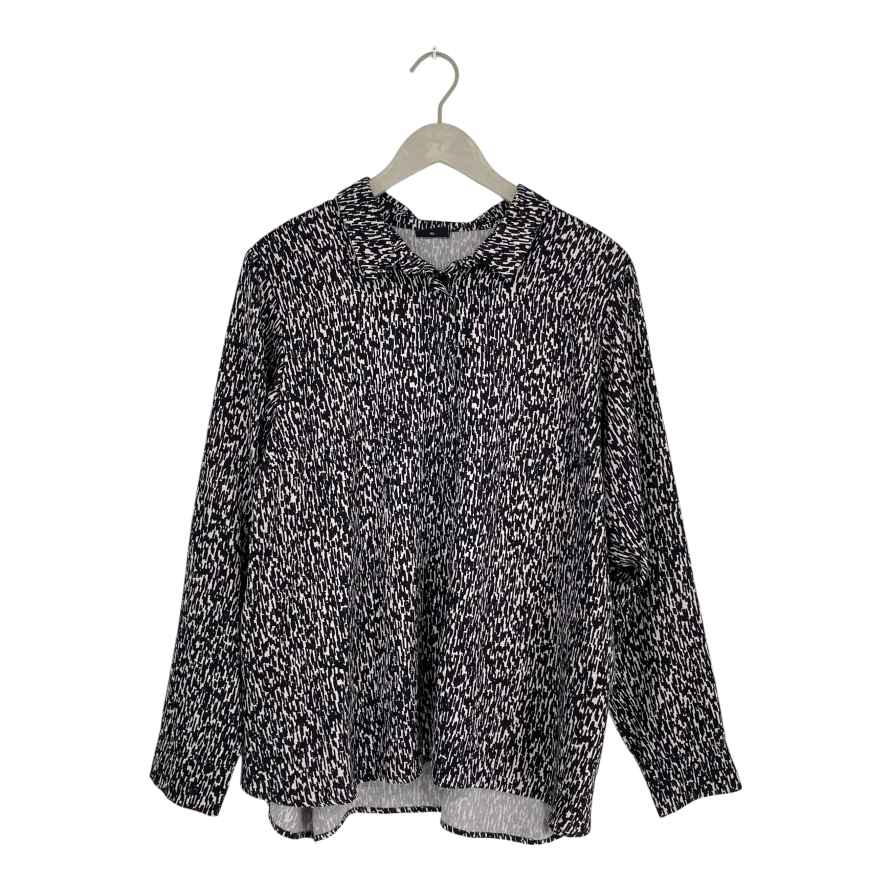 Papu women's button-up shirt with collar. Long sleeves with slits and buttons on wrist band. Round neckline and shirt collars. Pleats on the back.