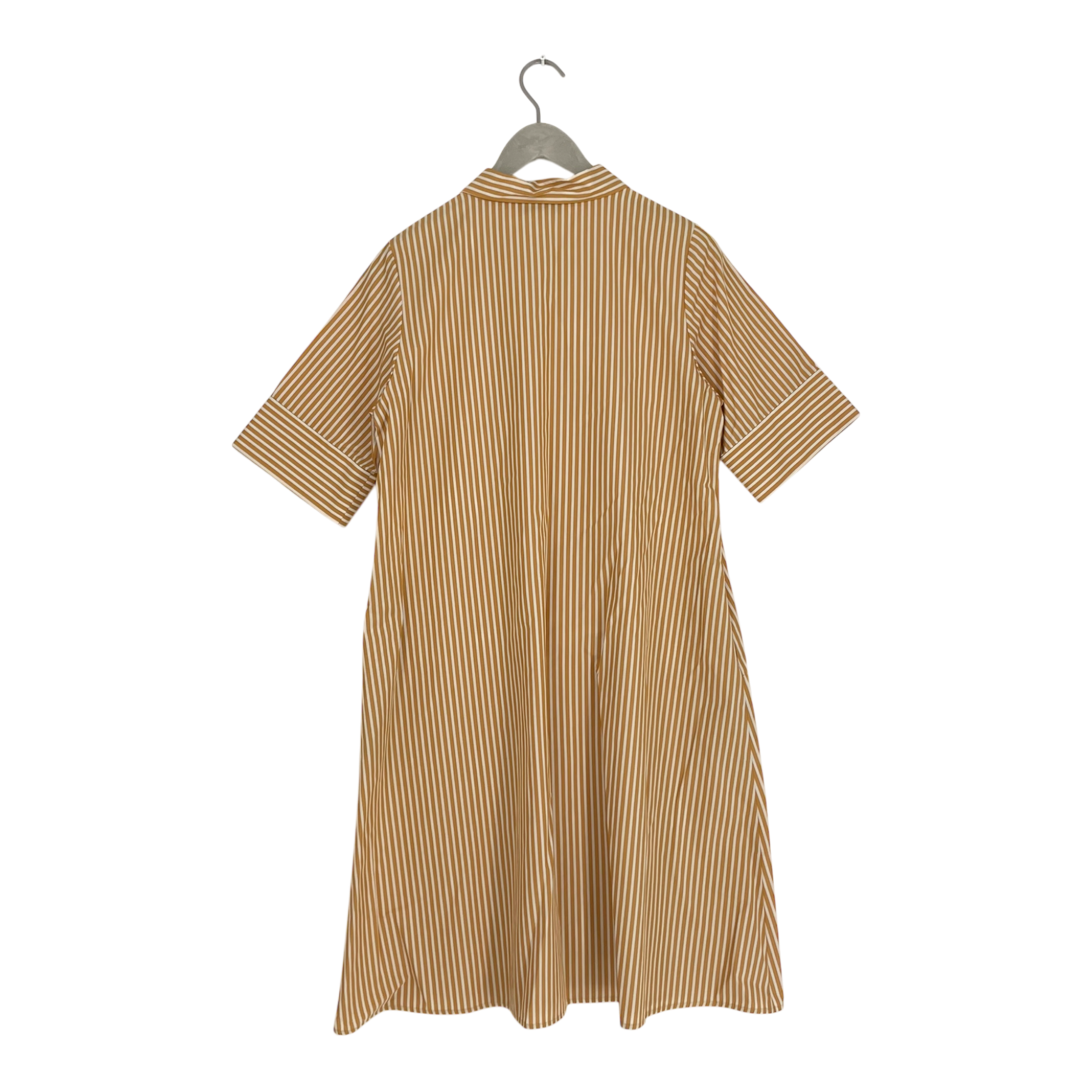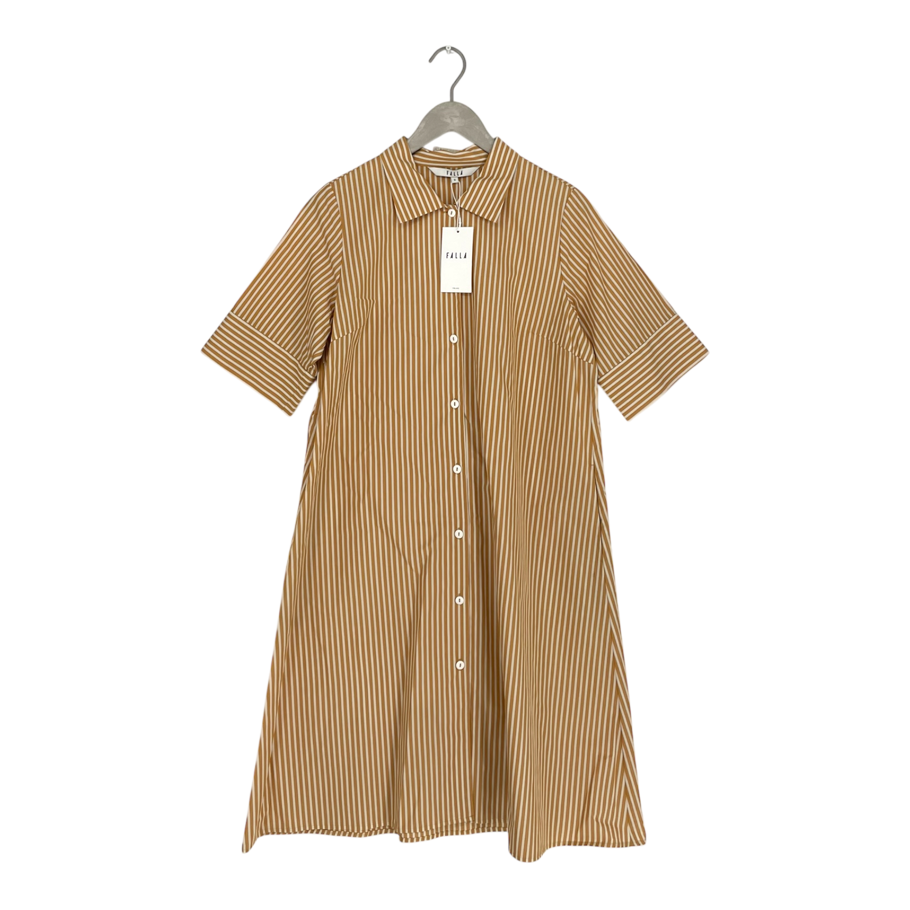 Falla Finland Sieppo Dress features a button-front closure, a collar, pockets on both sides, a slightly A-line silhouette, and short sleeves.
