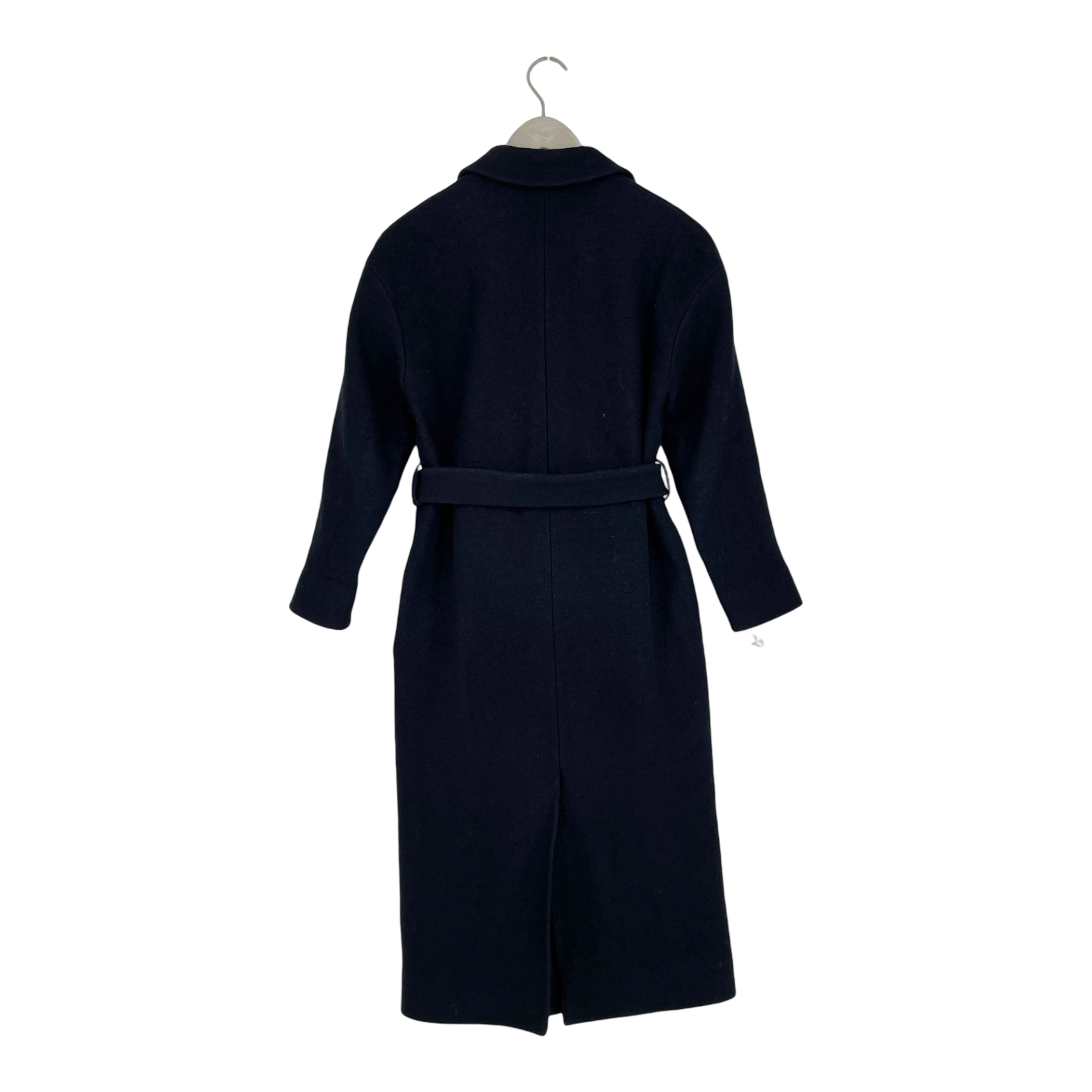 COS wool coat with pockets on the sides, button and belt closure. The size tag is missin, but looks like a XS.