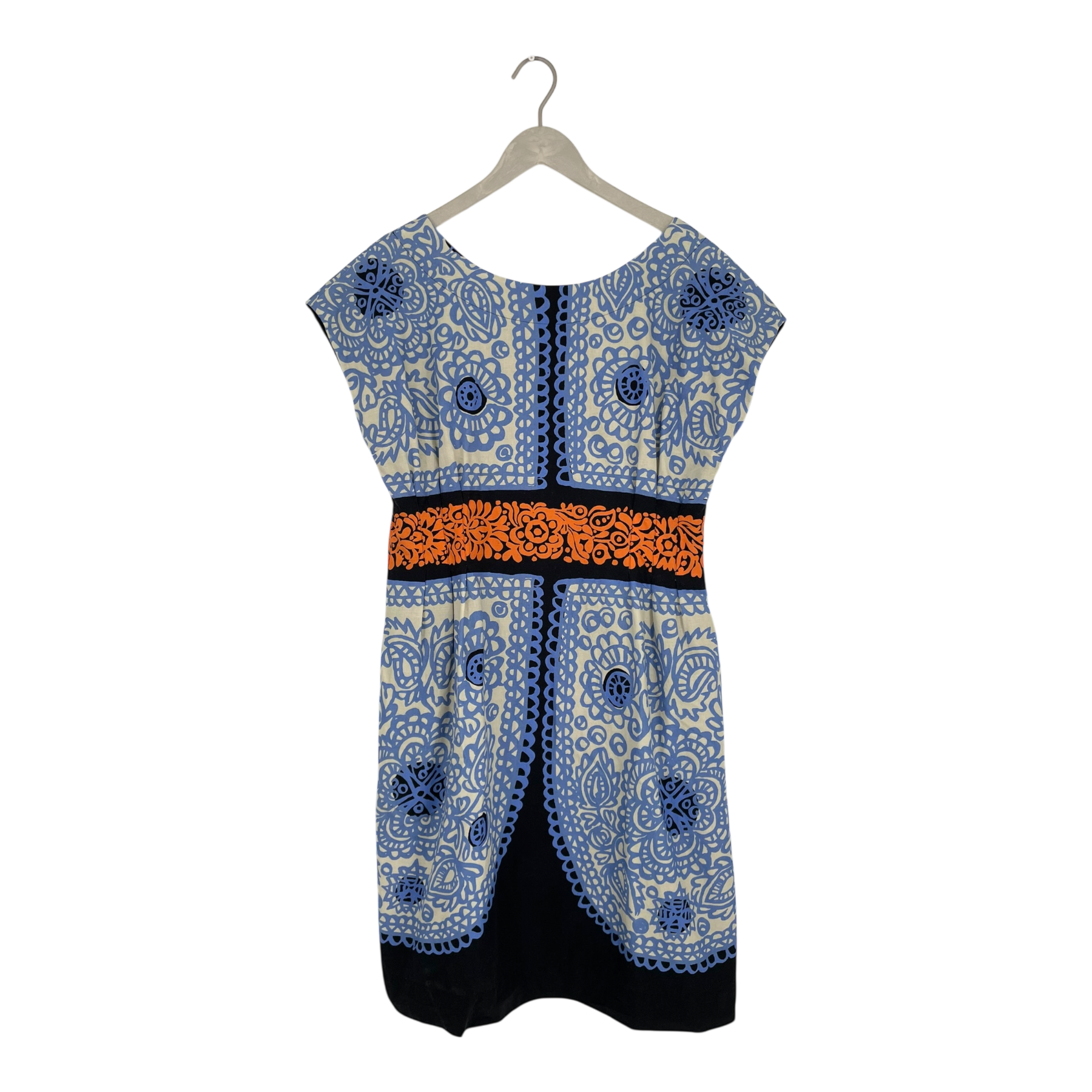 Marimekko short sleeve Trissa dress in the classic Satula pattern by Maija Isola. The Trissa dress is sleeveless and fully lined with a round neckline and pleat details on the waist.