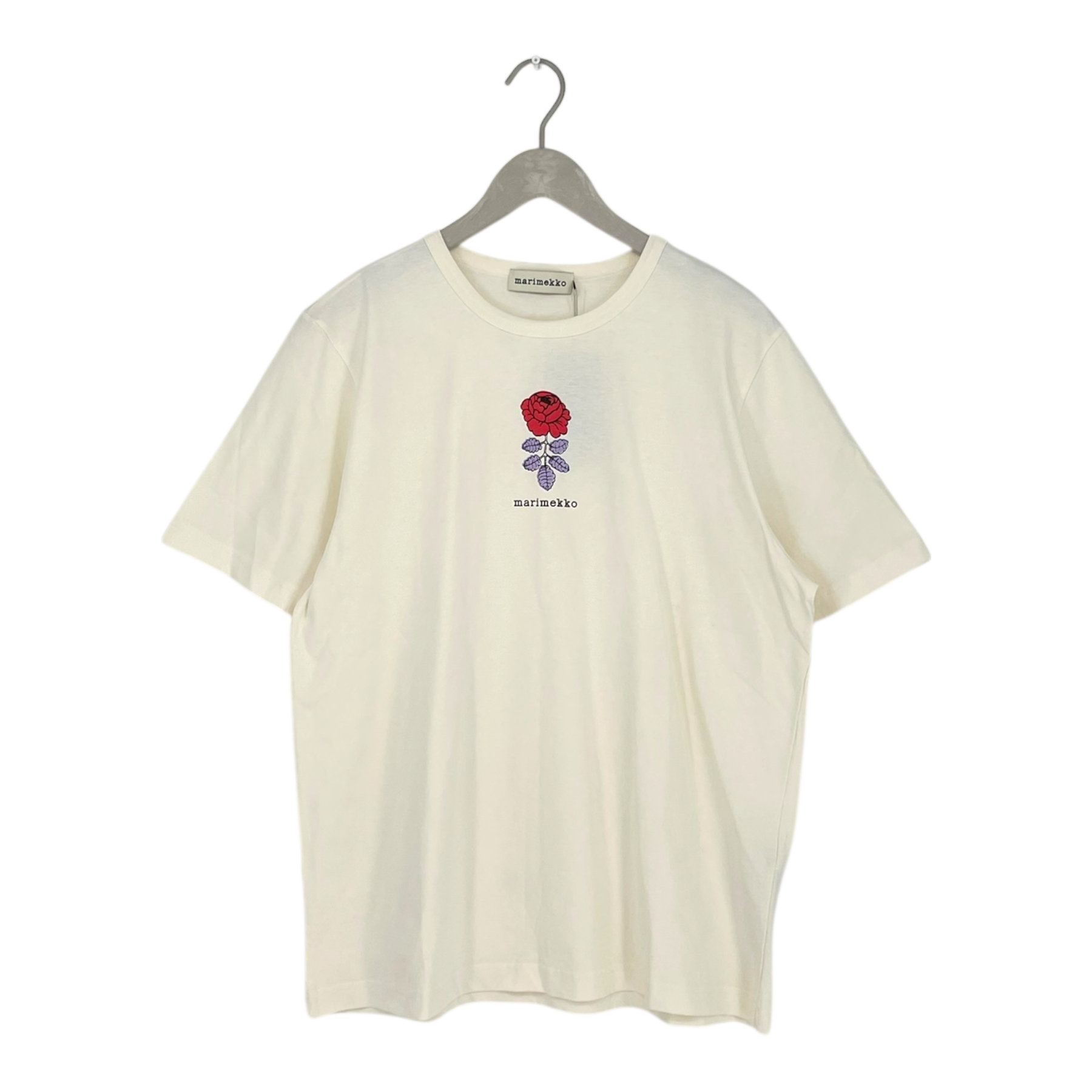 Marimekko Vihne relaxed T-shirt features a Vihkiruusu print on the front and a small Marimekko text logo.