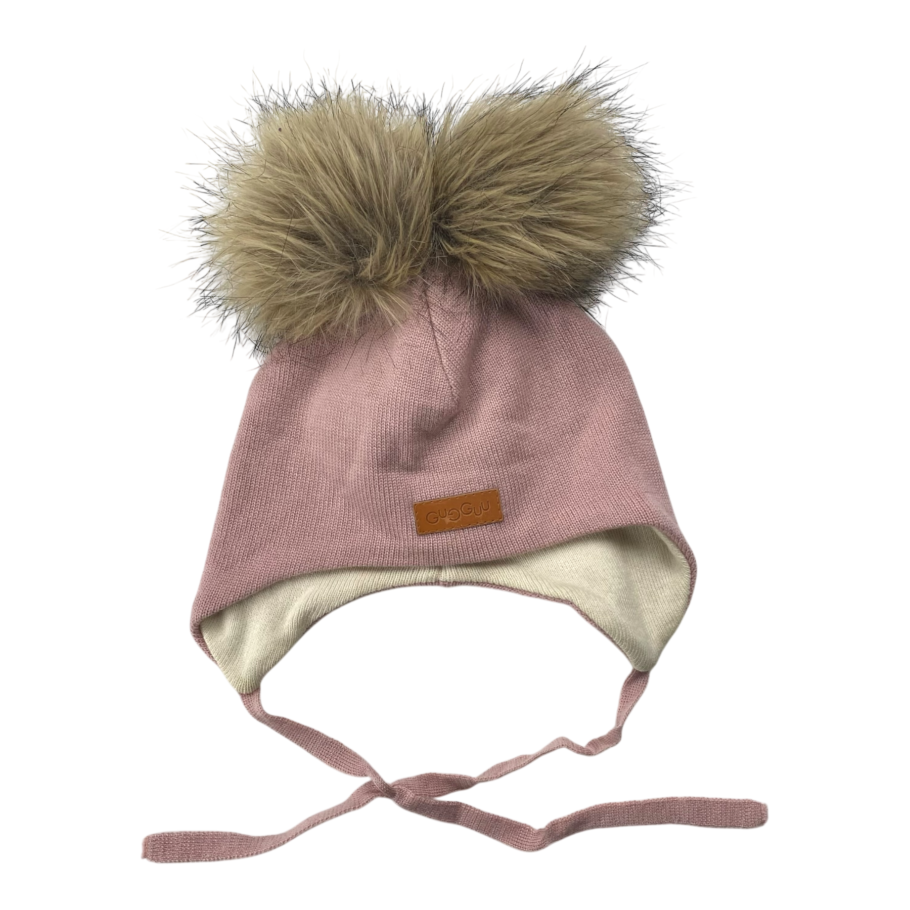Metsola beanie with two fake fur poms and strings to tie with. Original size is XL.