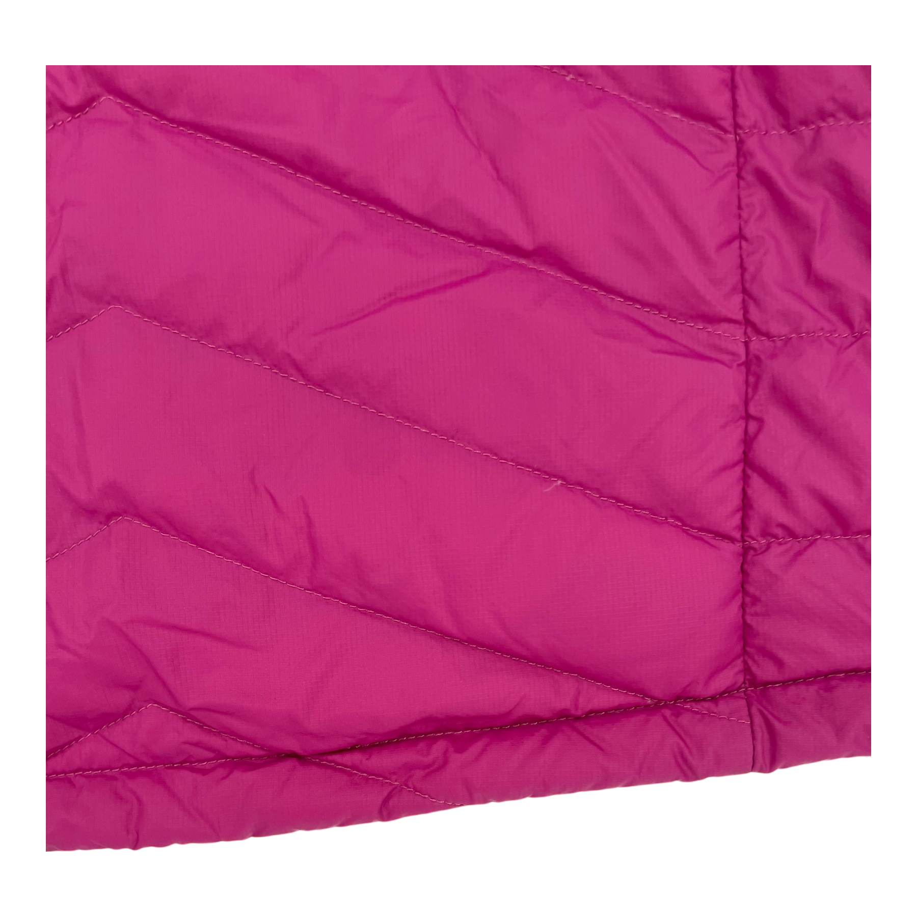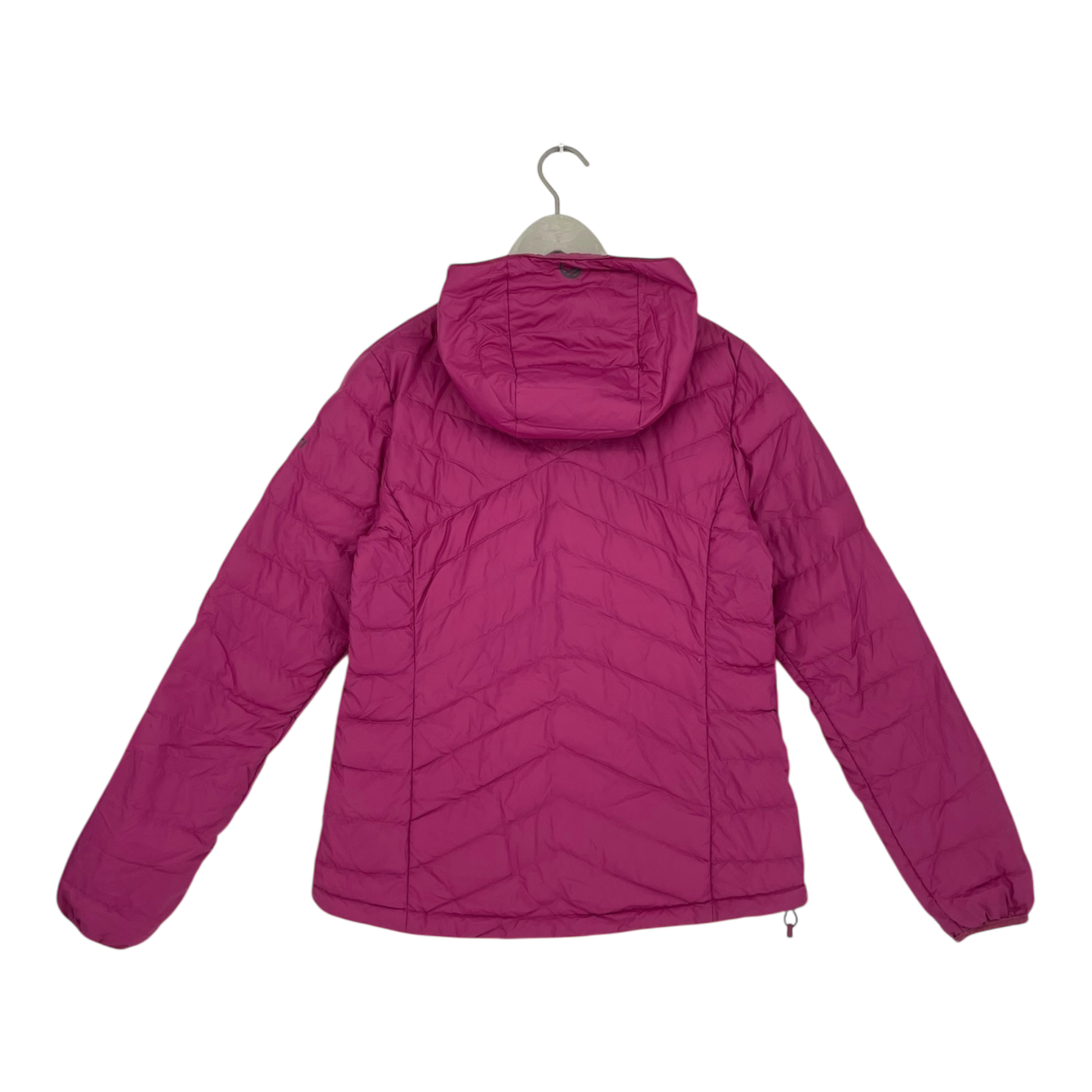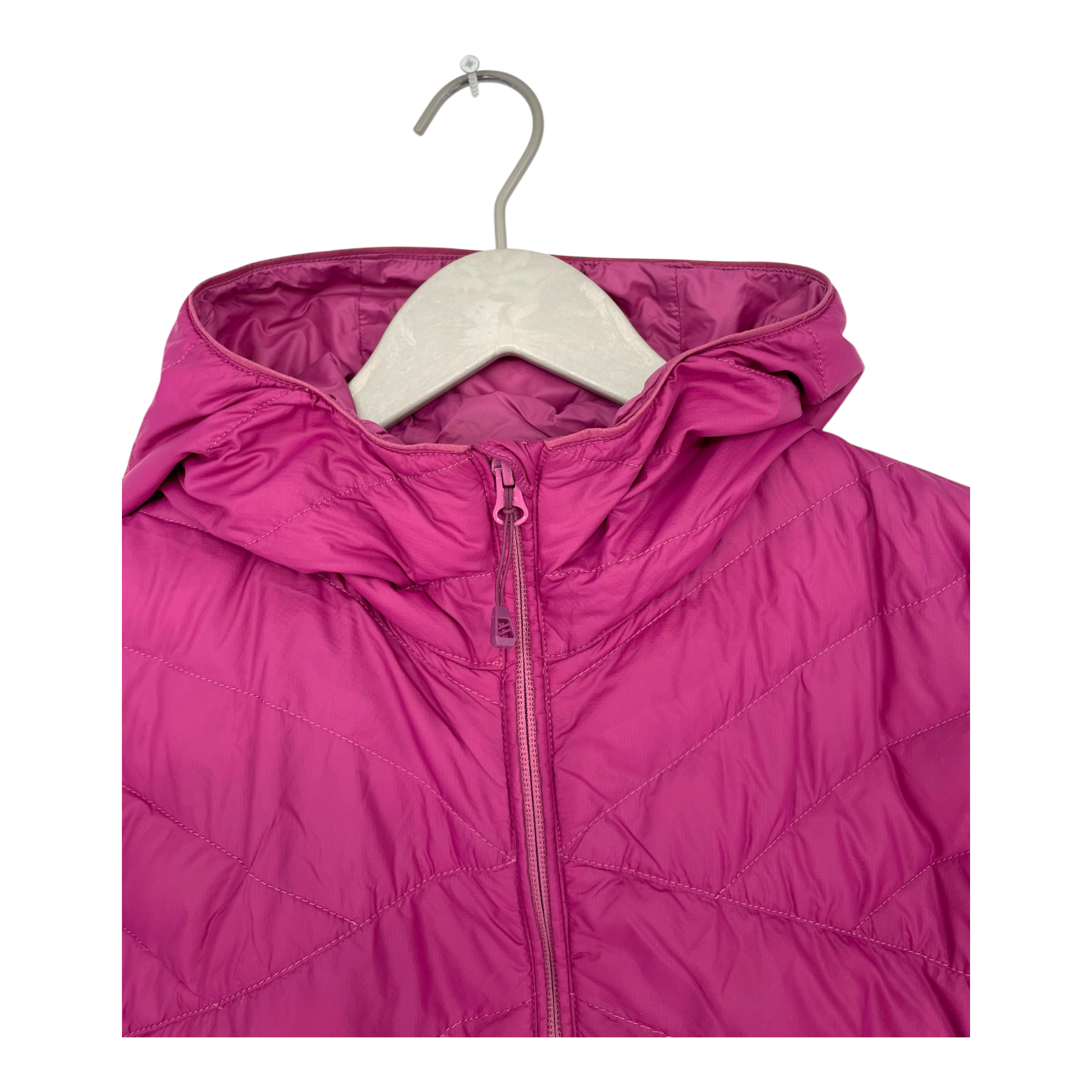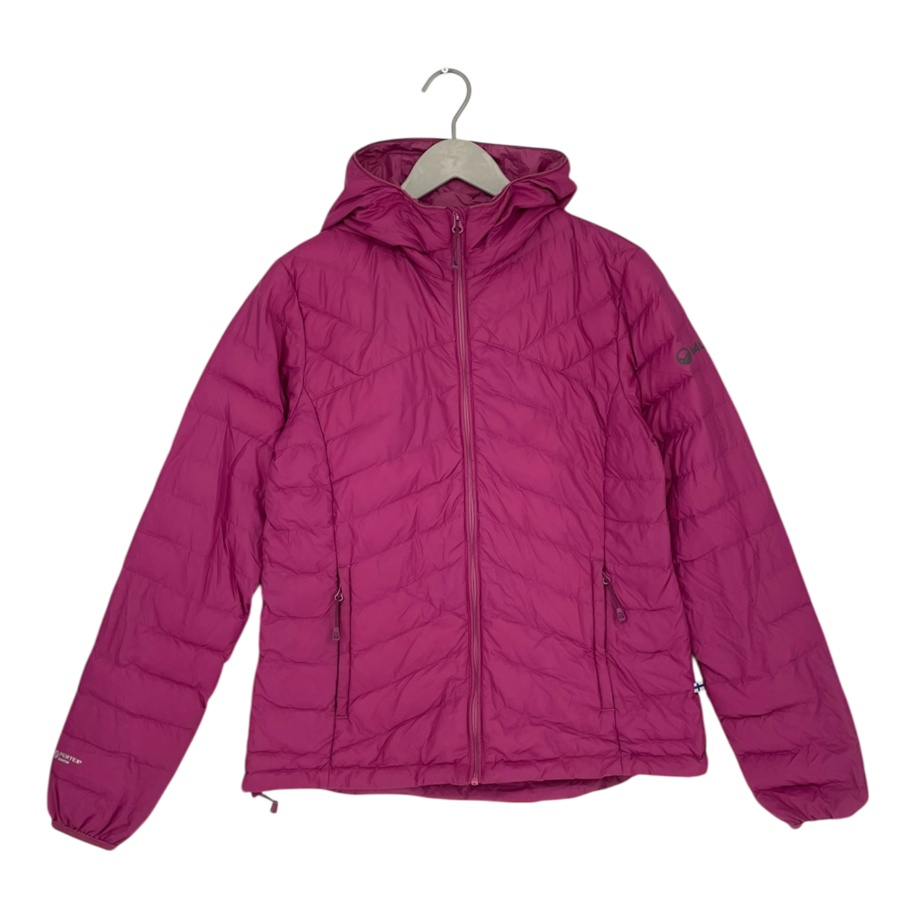 Halti women's Aalto jacket with down-like padding. The lightweight jacket is suitable for the colder days of autumn and early winter. This jacket has a zipper closure, side pockets and a hood. The jacket is otherwise in good condition, but some down is coming out through a few seams, and there are a couple of skipped stitches in the quilting.