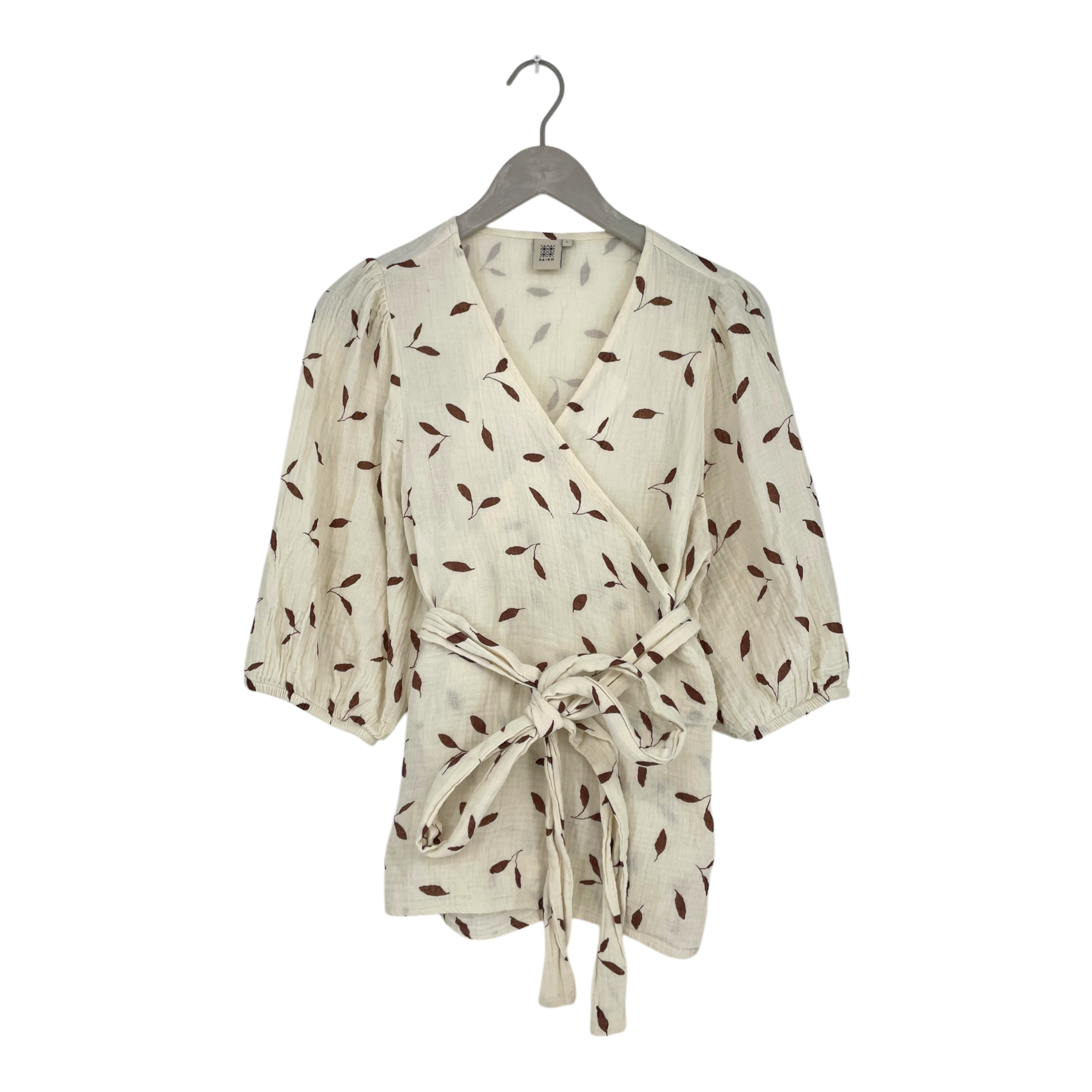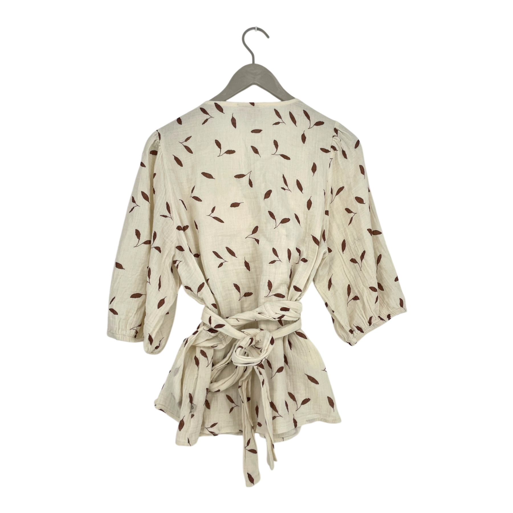 Kaiko wrap blouse has loose half-length balloon-sleeves and ties at the waist with long straps. The cuffs are elasticated, and gathering at the shoulders creates additional volume to the sleeves. Kaiko wrap blouse is made from woven organic cotton muslin with a lively texture.