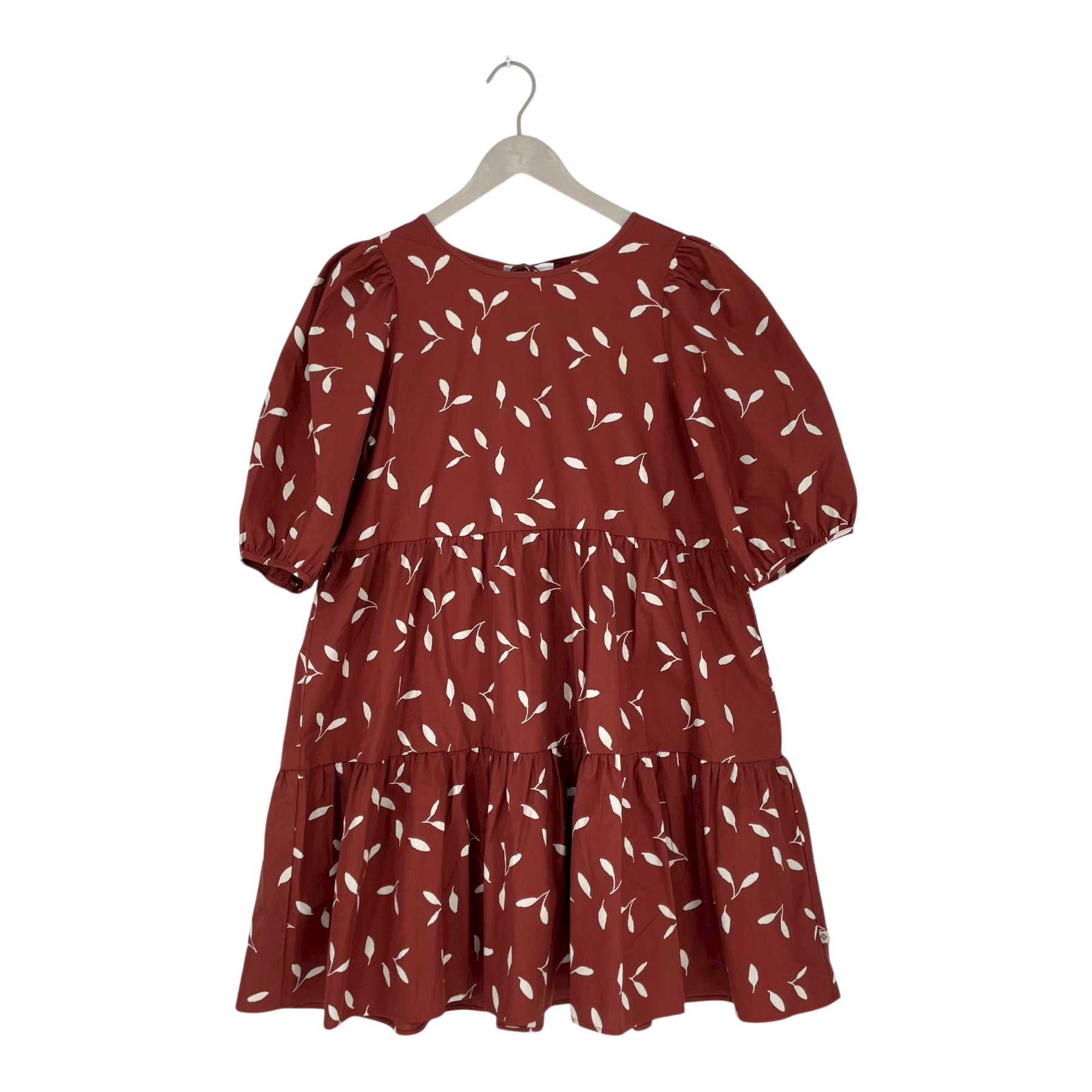 Kaiko women's Tiered Mini Dress is made from high-quality organic cotton poplin. The loose-fitting dress features three-quarter puffed sleeves and a voluminous tiered mini-length hem. It has a neck tie closure and a deep slit at the center back that extends to the waist seam.  Unlined.