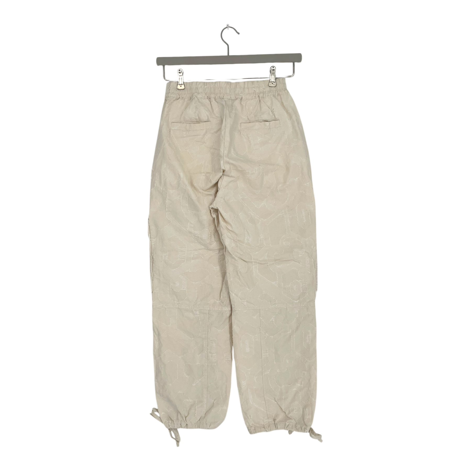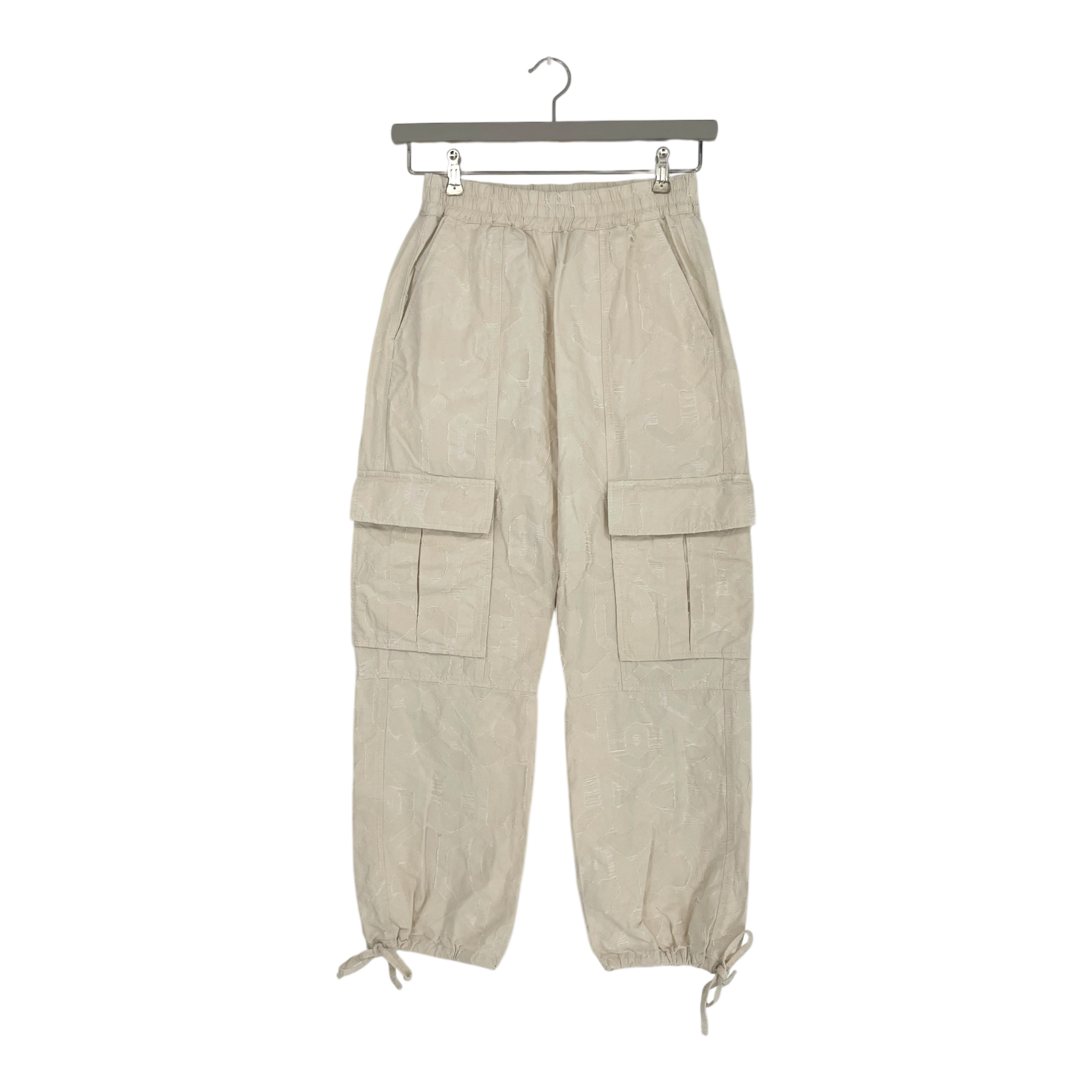 Rodjeber cargo pants with a contrasting textured woven fabric are a perfect marriage of rough utilitarianism and delicate patterns. The pants have an elastic waistband, six pockets and string tightening on the legs. No laundry tag.