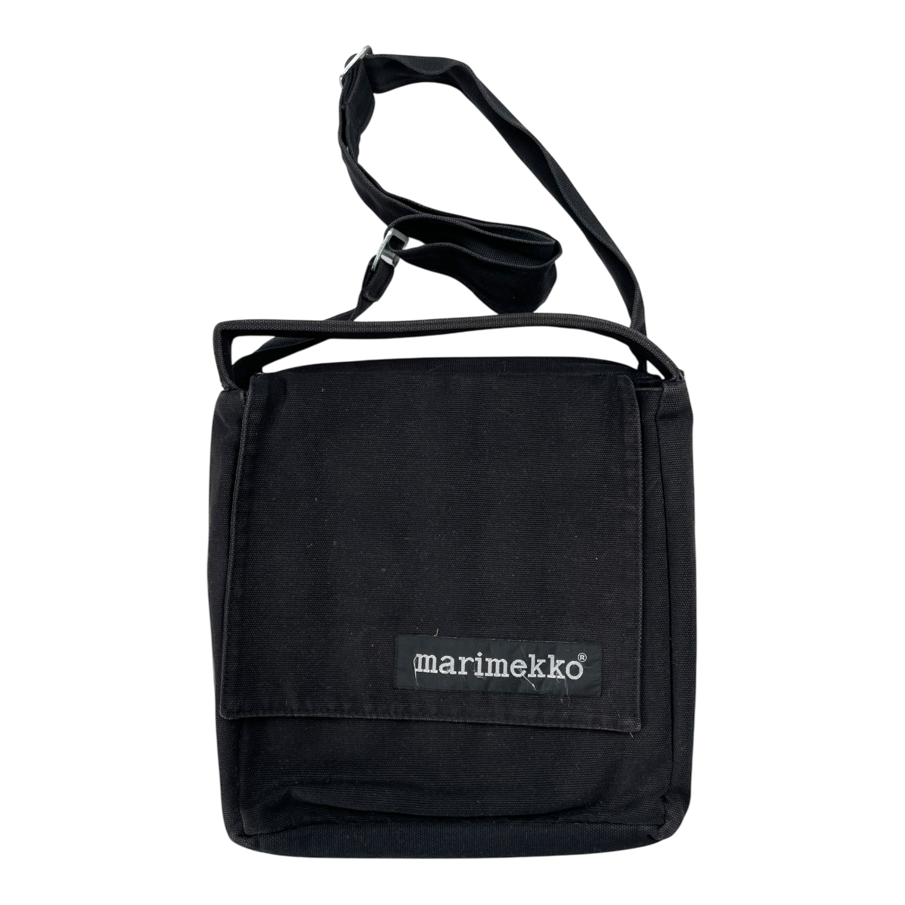 Marimekko Container shoulder bag with one flap covered outside compartment with smaller zippered pocket on the inside, one large main compartment with zippered pocket. Handle and strap. Strap wearable length approximately 60cm when extended. The Container bag design is by Björn Dahlström.