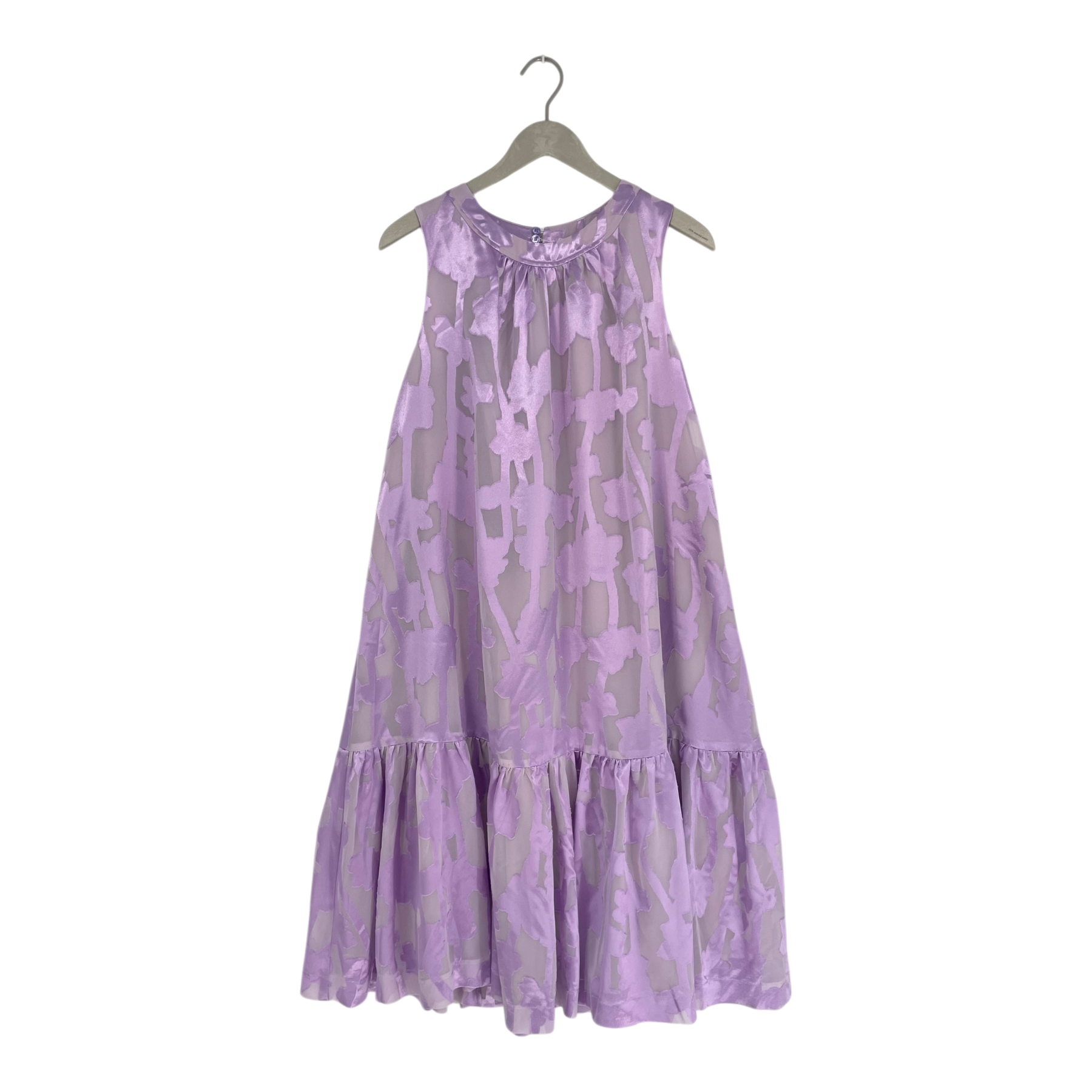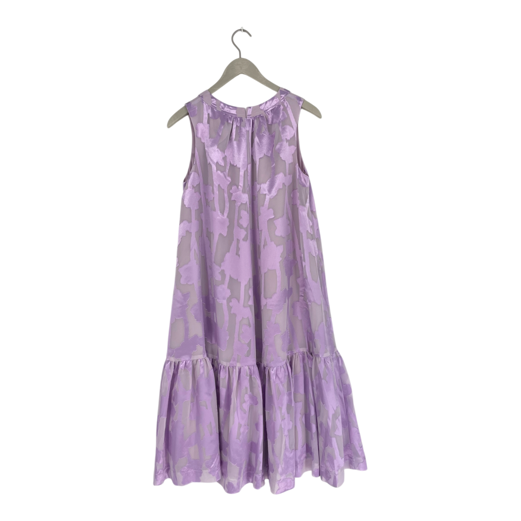 Aarikka sleeveless Välke dress has a fitted top and a beautiful A line cut. The dress is fully lined, and it has lovely frills at the neckline. There is a button and slit closure at the neck. The wide, frilly hem is a true eye-catcher and elevates the dress. The long dress has a beautifully draping hem, and the material, glossy and slightly transparent, brings the print alive.