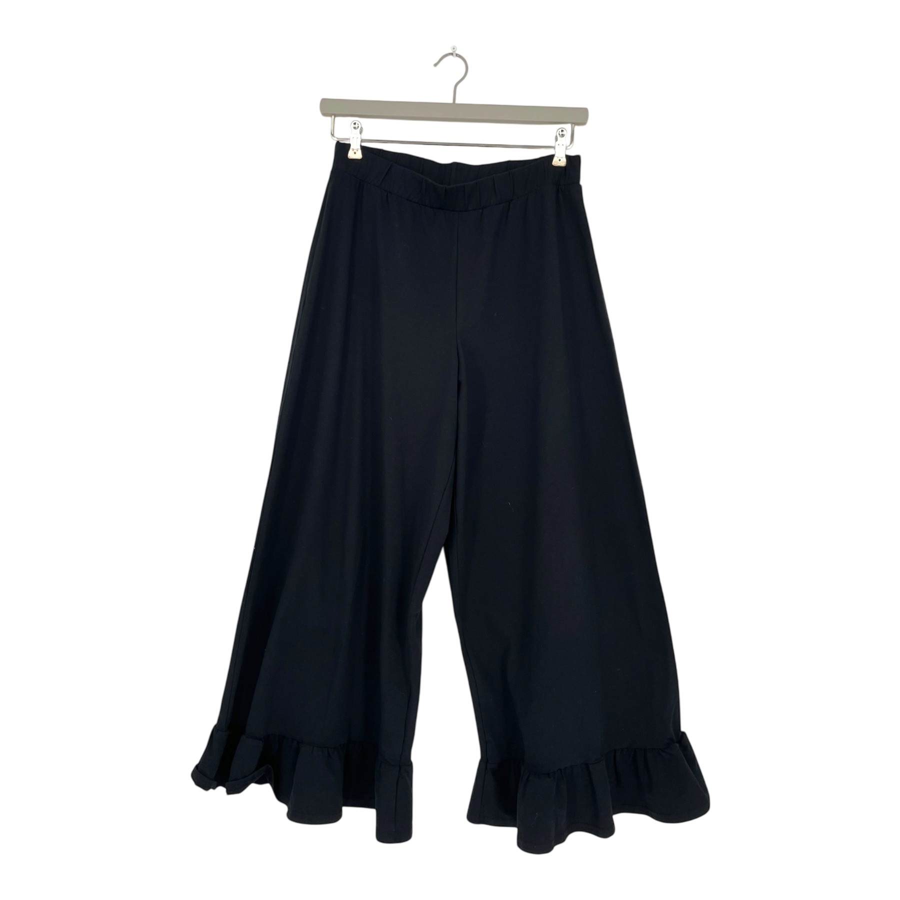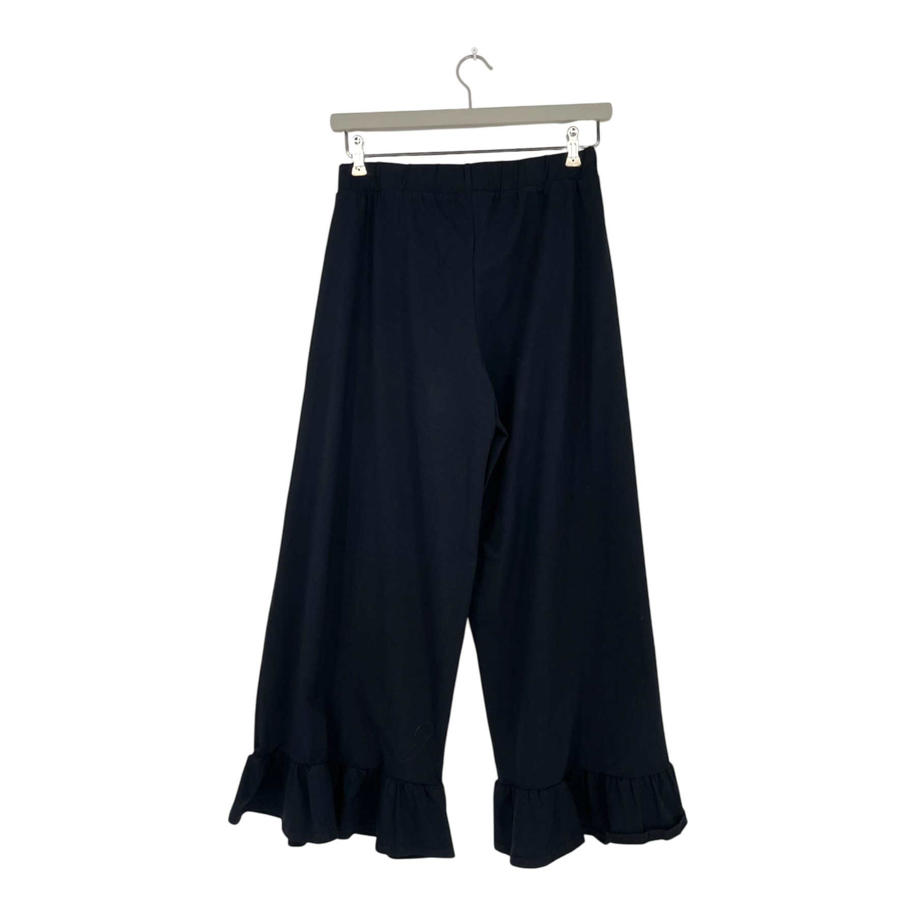 Aarre Thalia pants with frills on leg ends. These high-waist pants are fit at the waist, but the legs are wide. Ankle-length legs, wide elastic band at the waist.