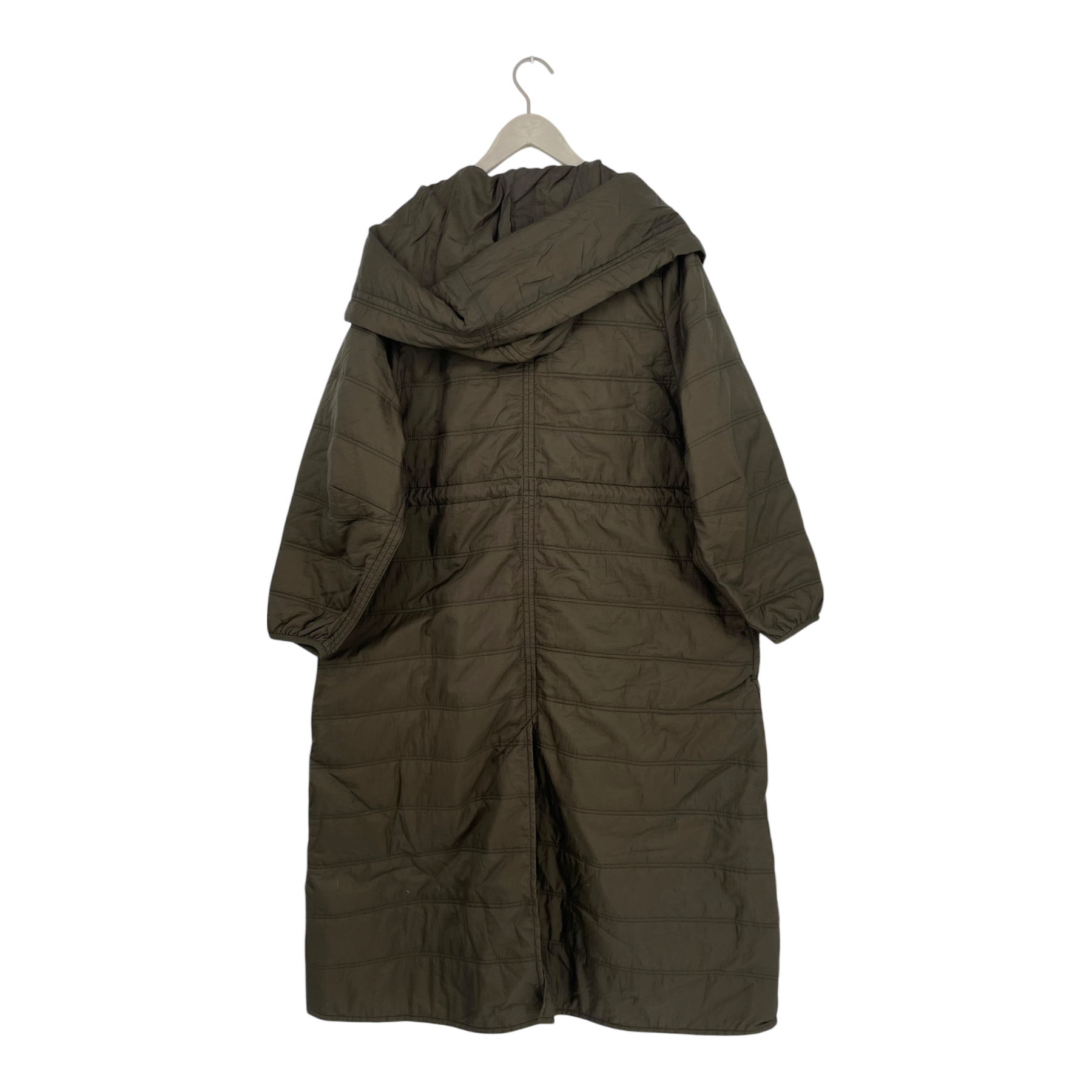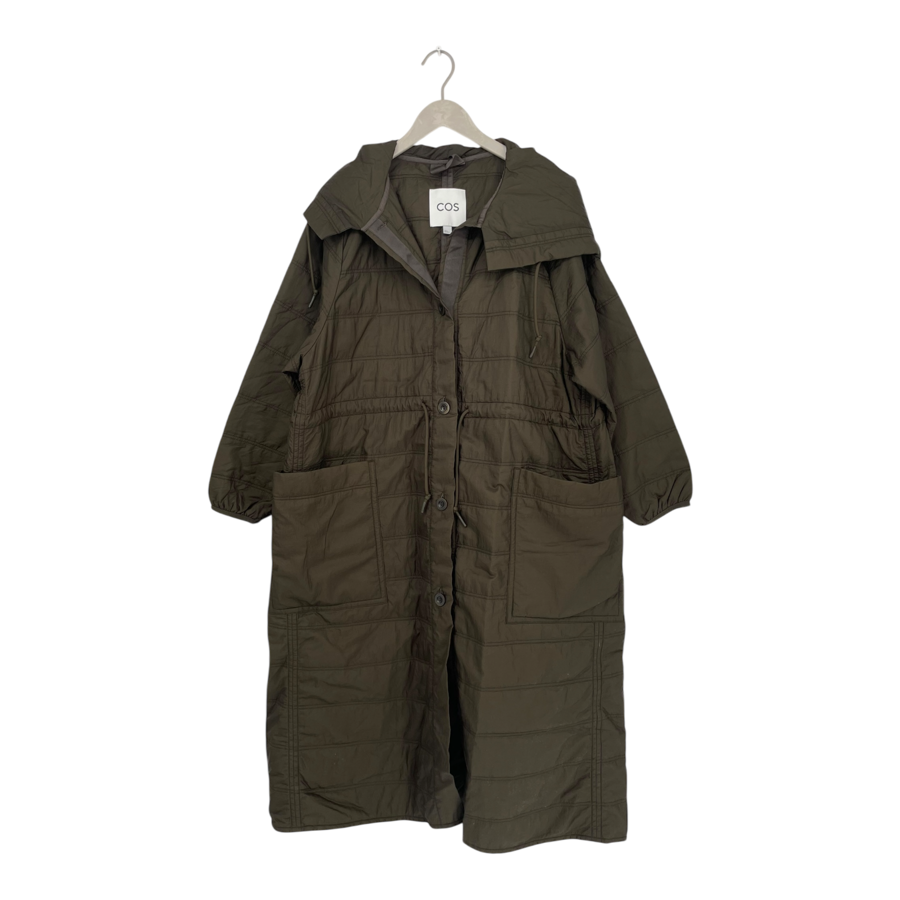 The COS lightweight quilted winter coat has a large hood, button closure on the front, drawstrings on the waist and around the hood and two open front pockets. Ideal as an overcoat.