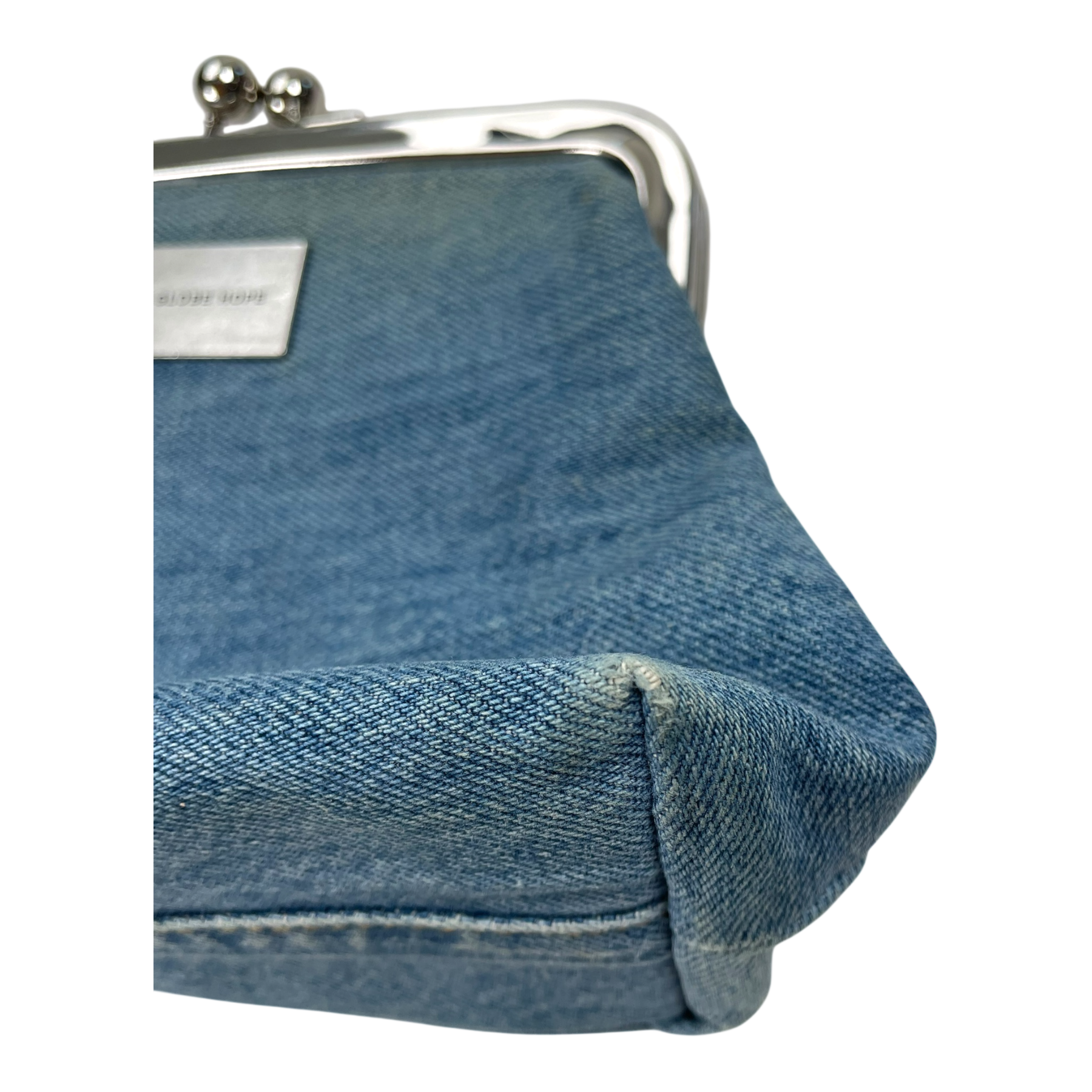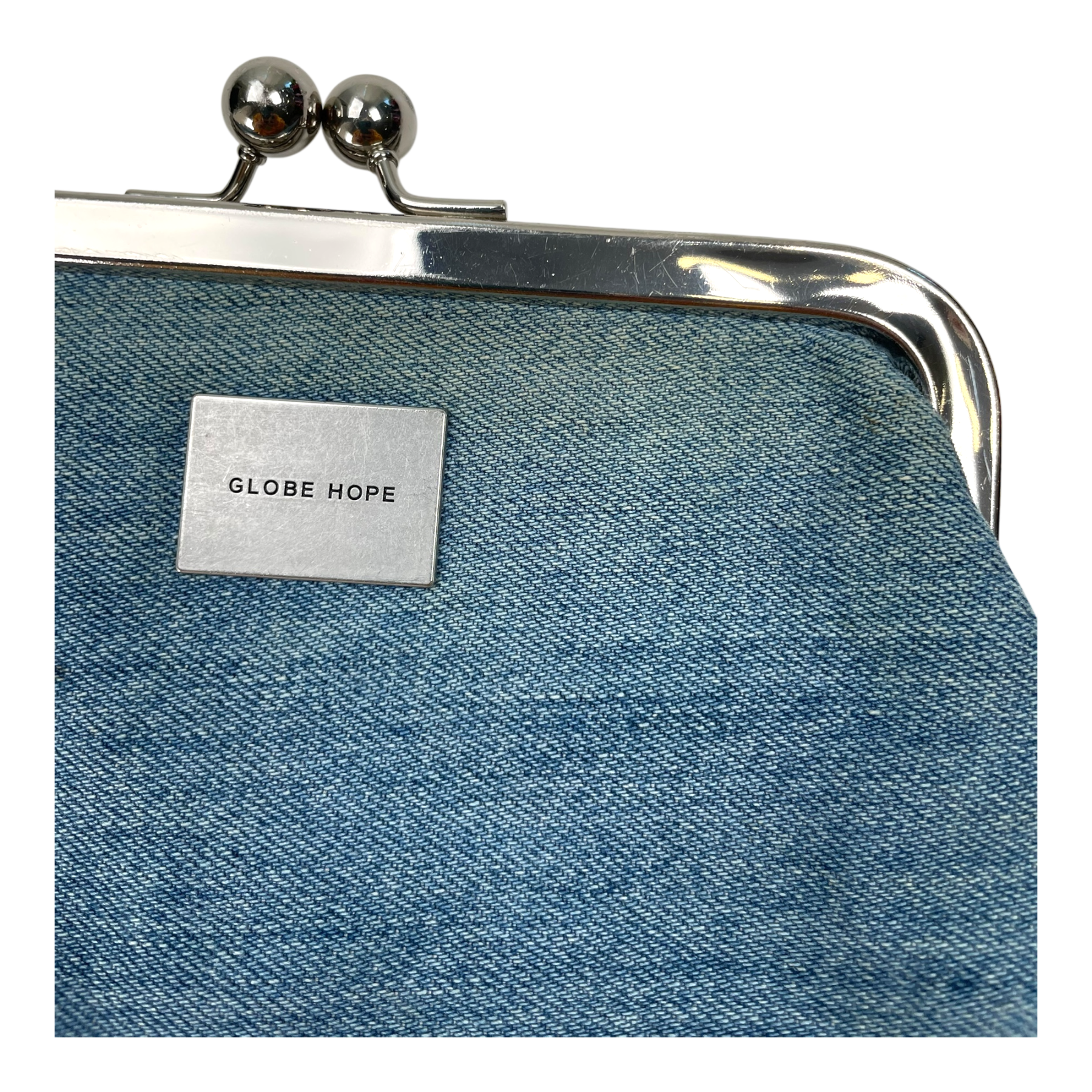 Globe Hope small clasp clutch bag with ball closure. The denim shows signs of wear, but it might be a feature of the fabric.
