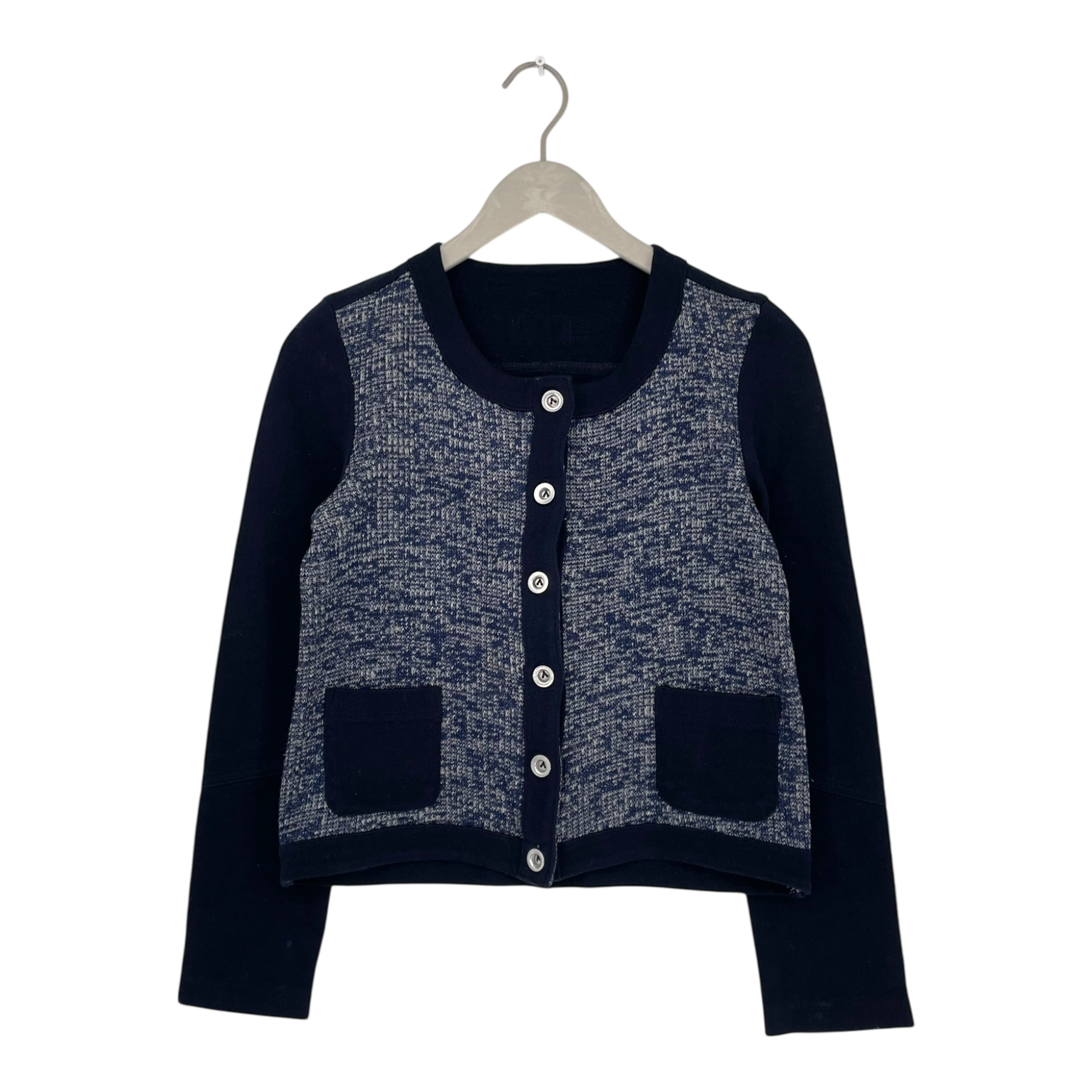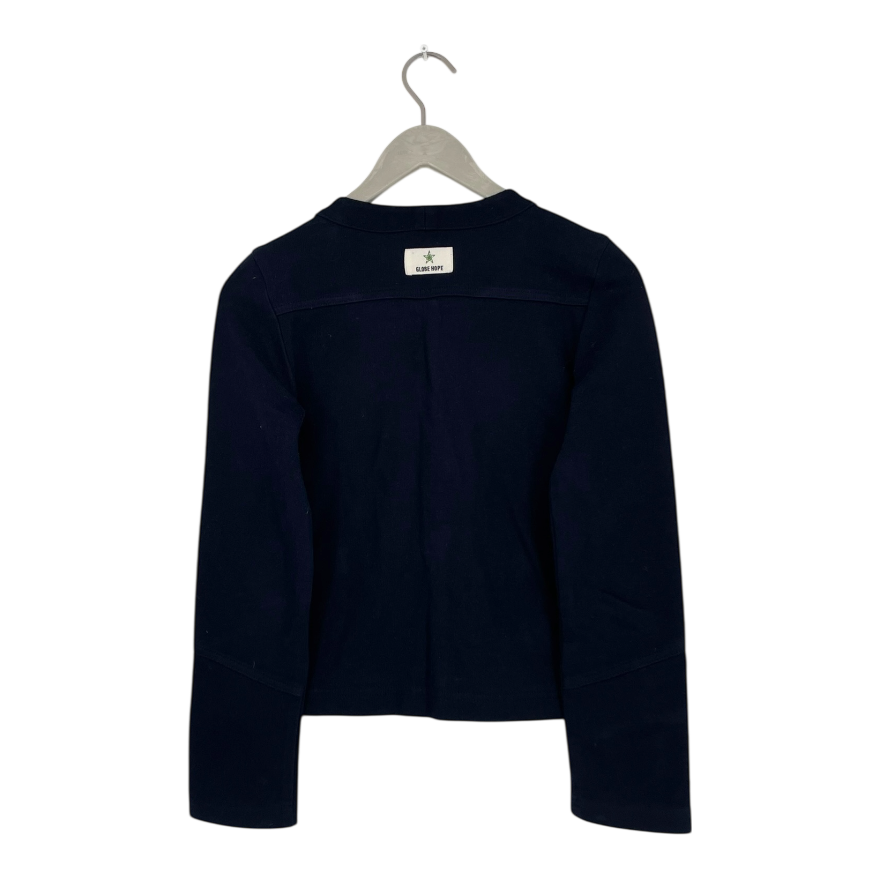 Globe Hope cropped knitted cardigan with round neckline, metal buttons and two small pockets on the front.