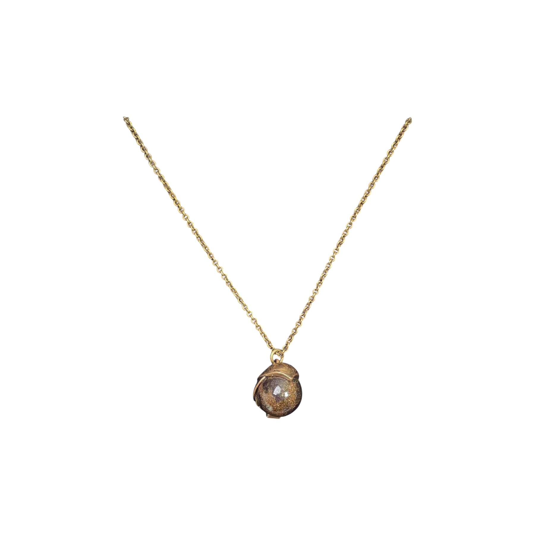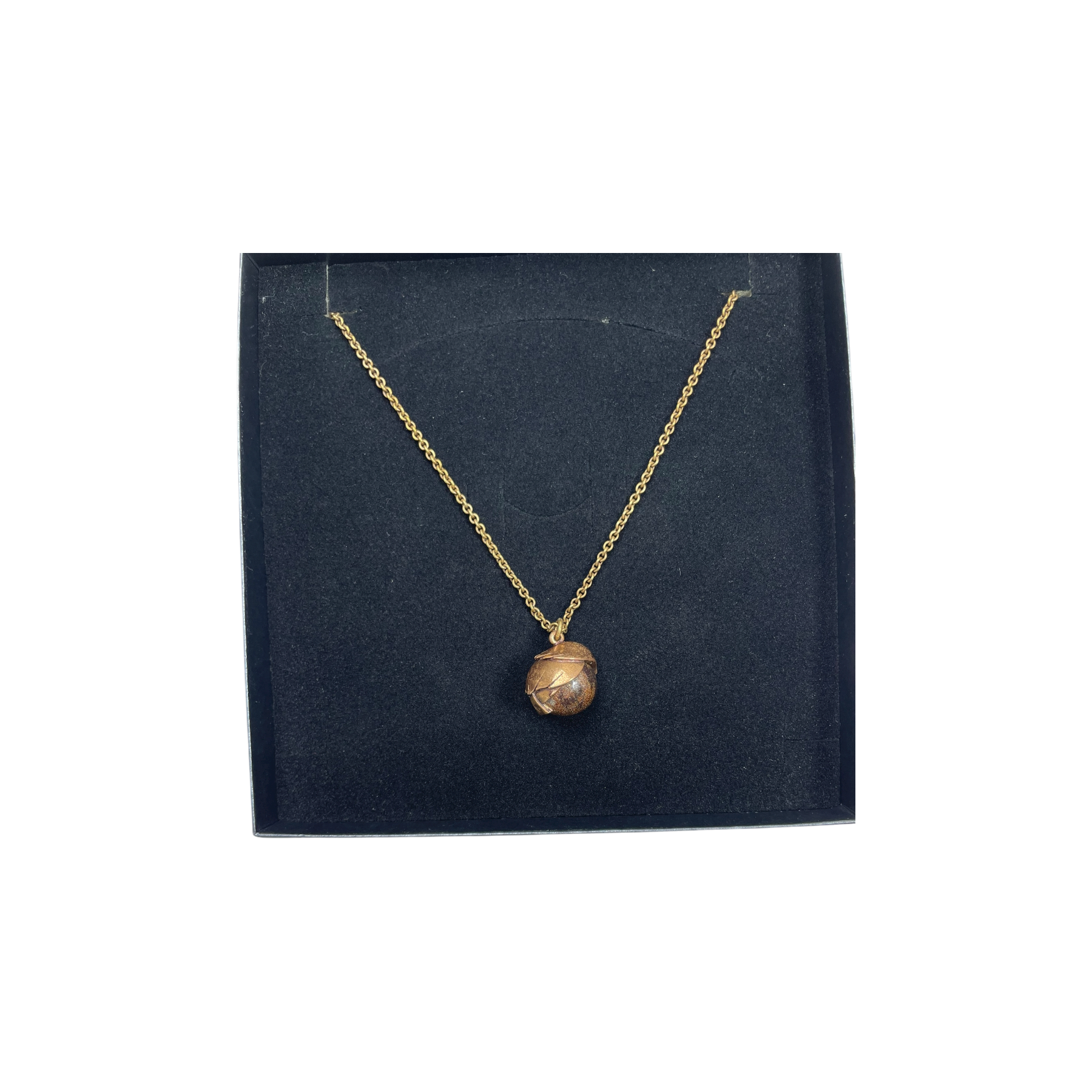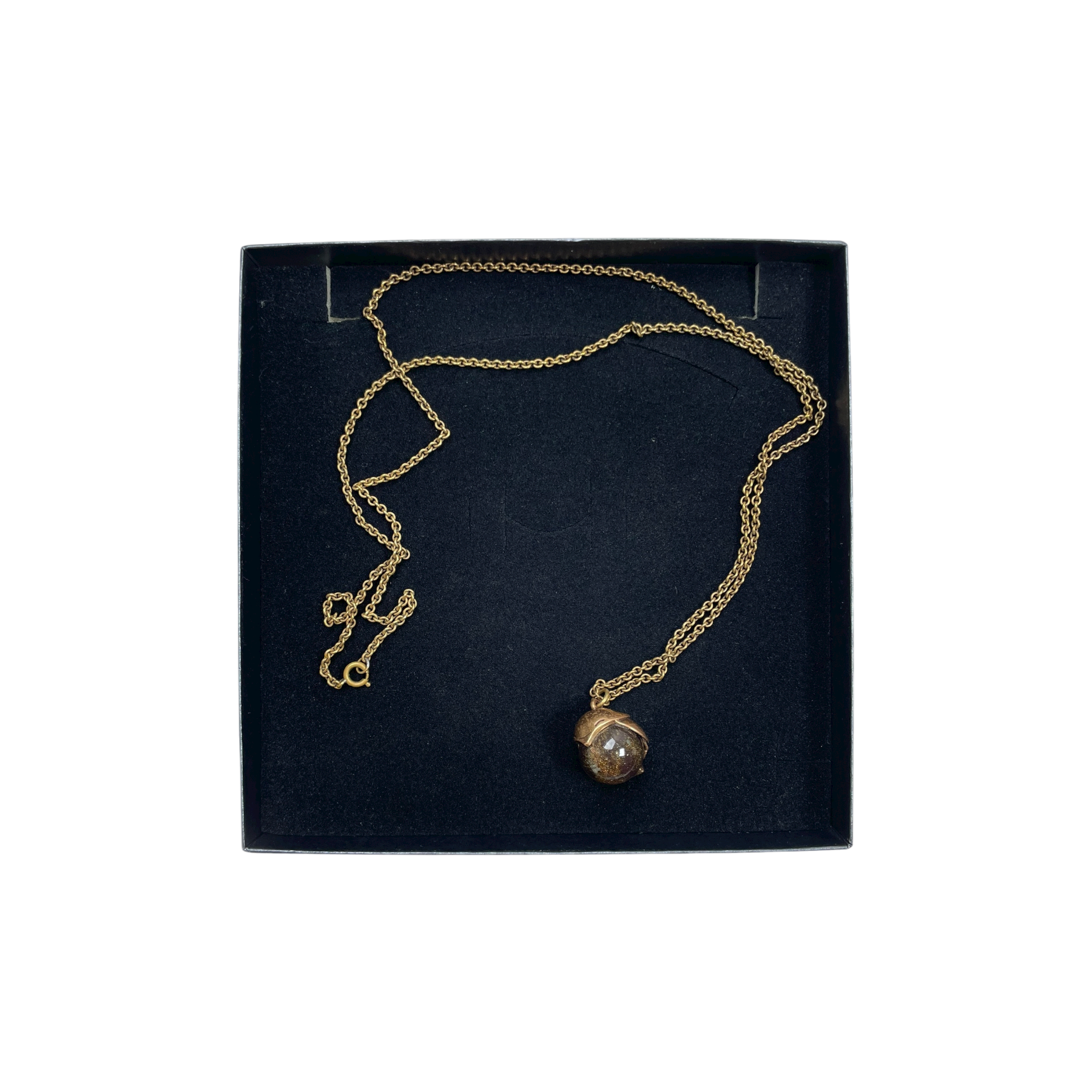 Kalevala Koru bronze Tintti necklace with painted golden ceramic part. The length of the chain is 35 cm, when closed and the size of the pendant part is ca. 2 cm. Original box not included. There is little patina on the bronze.