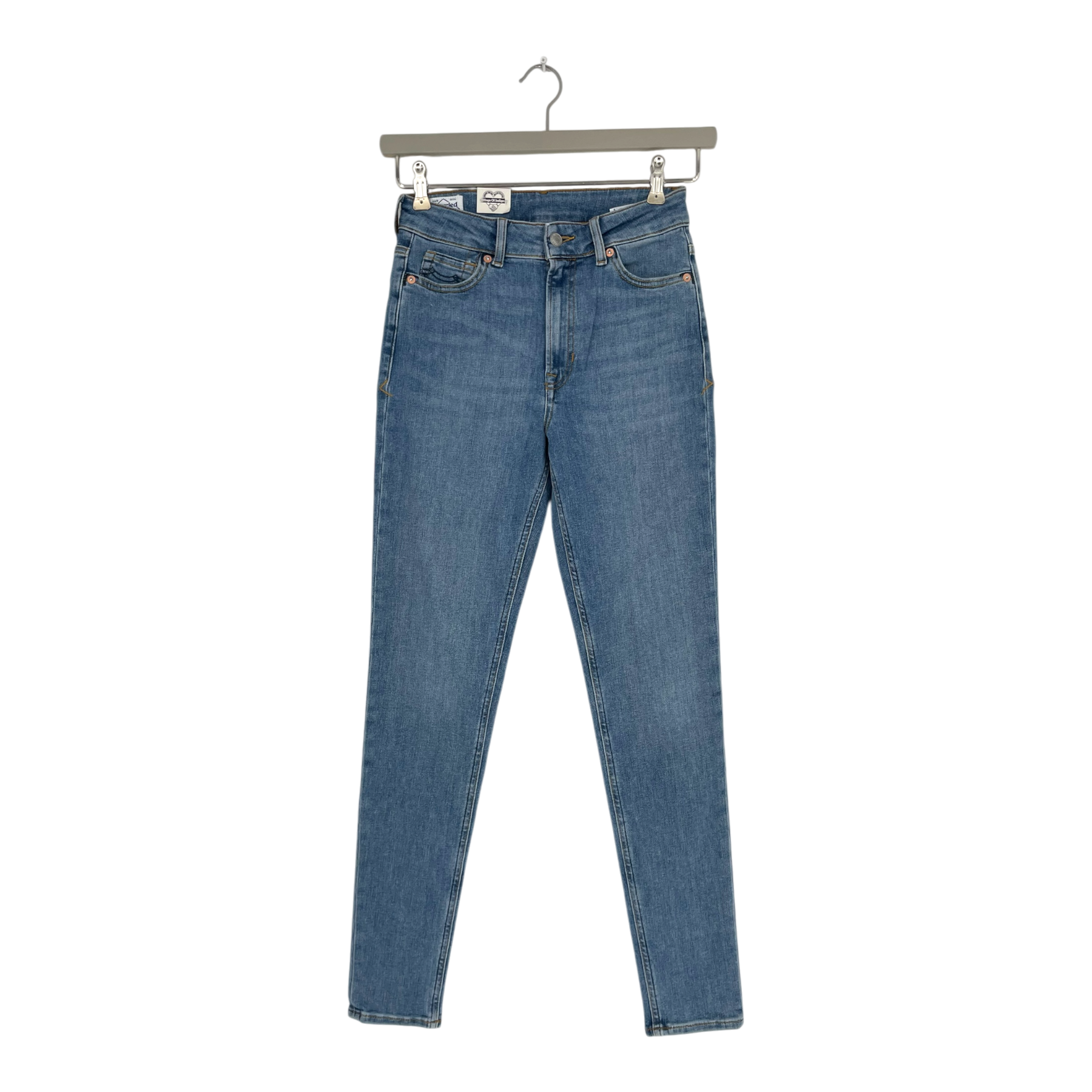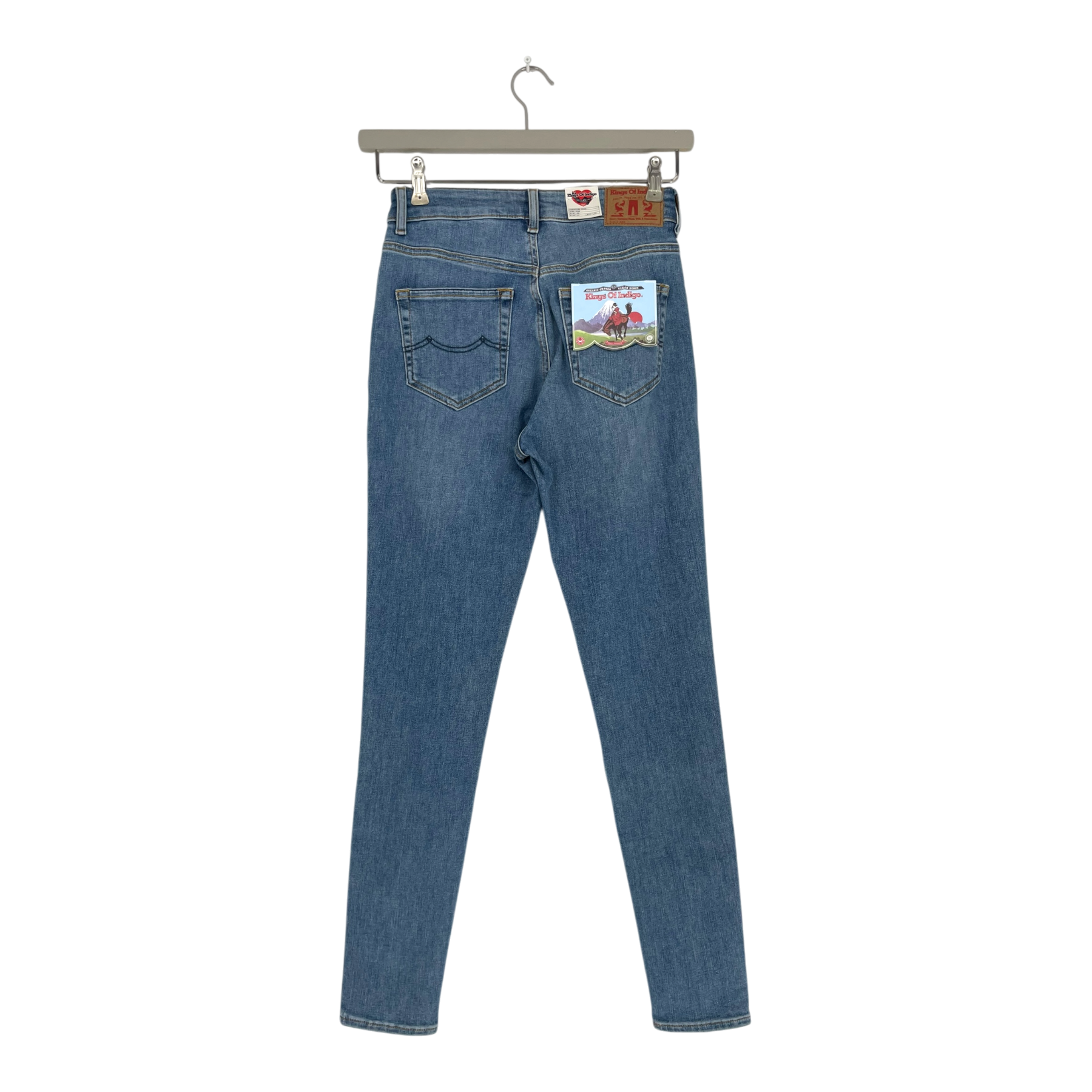 Kings of Indigo christina high-waisted skinny jeans in light blue wash. Features classic five-pocket styling with button fly closure. High-rise waistline with slim fit through leg.