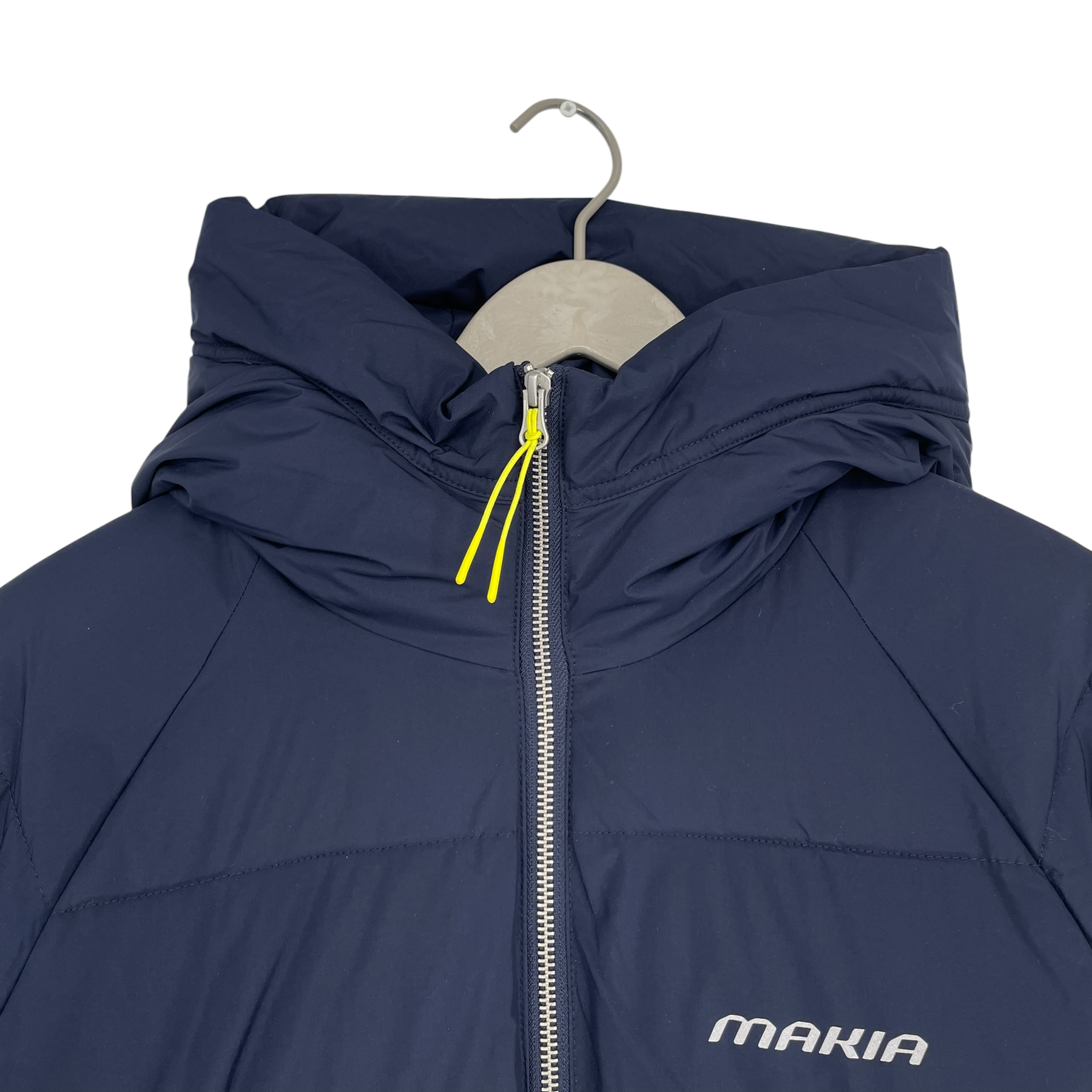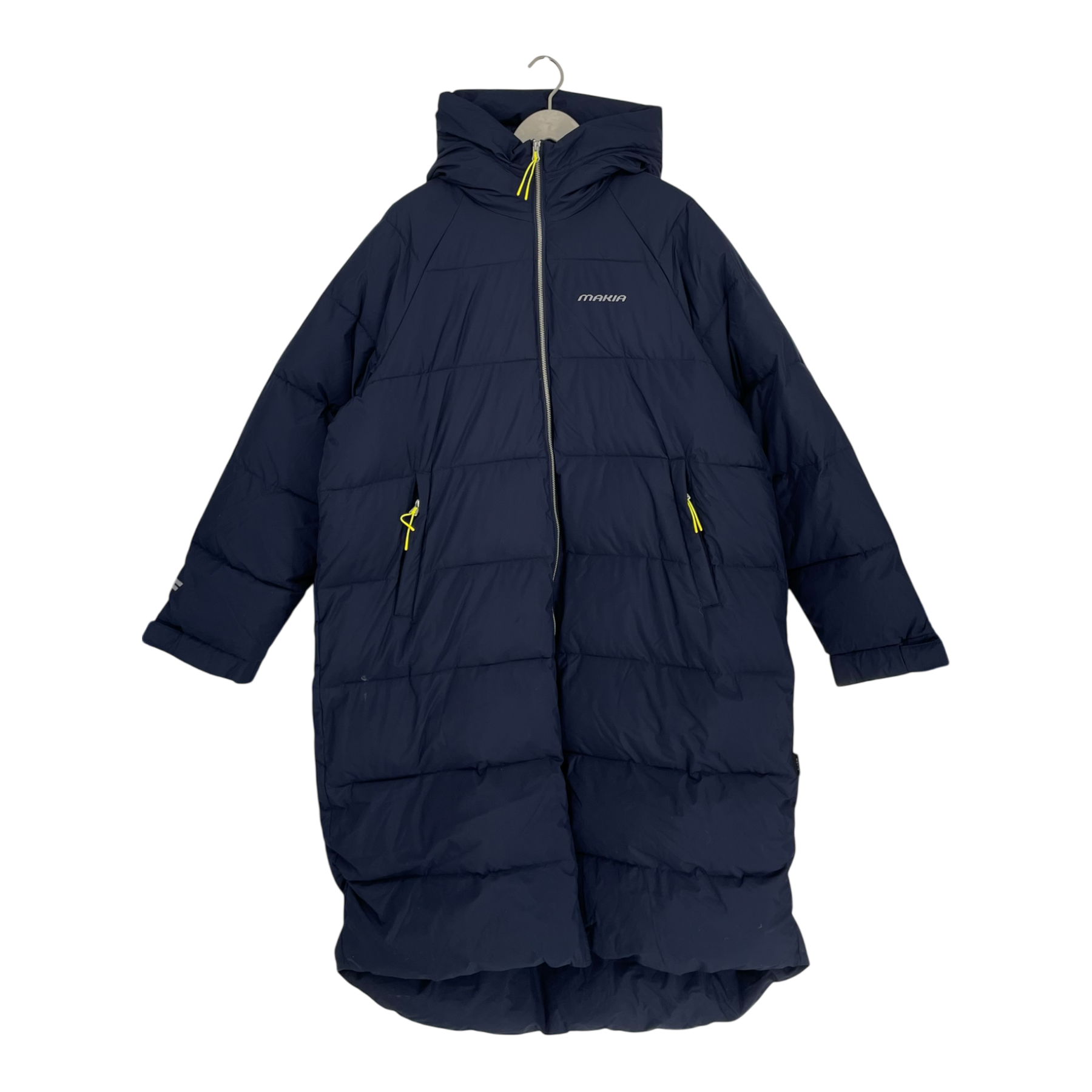 Makia X Finnair Jacket is a long, quilted winter coat designed for travel and everyday wear. It features a breathable snorkel hood and reflective details for enhanced visibility. Designed with travellers in mind, it can also be used as a cosy travel layer – the hood can be used as a sleep mask when the jacket is worn backwards.