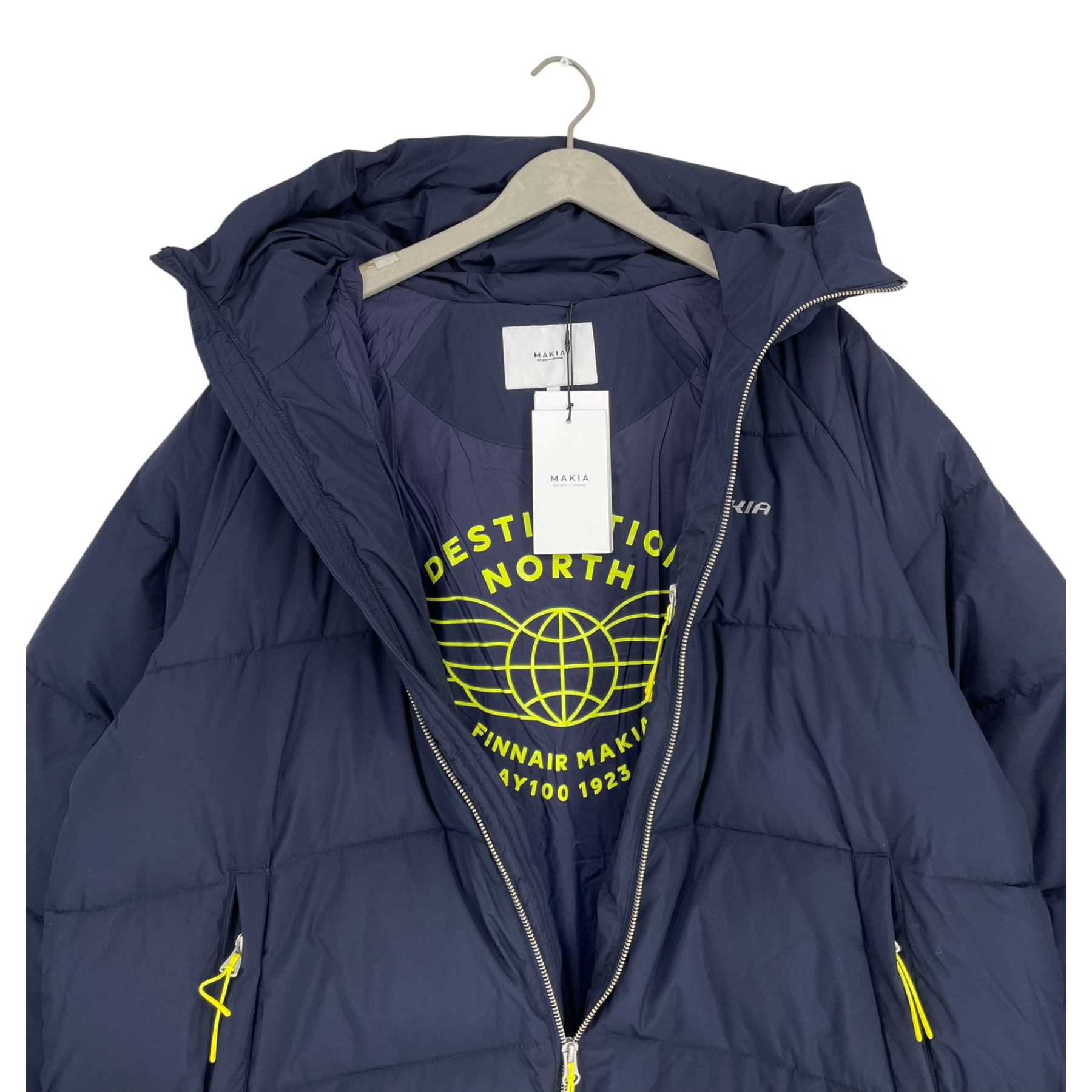 Practical details include a YKK metal zipper, fleece-lined front pockets, and an inside chest pocket. The jacket is finished with Finnair Destination North graphics and high-visibility accents.