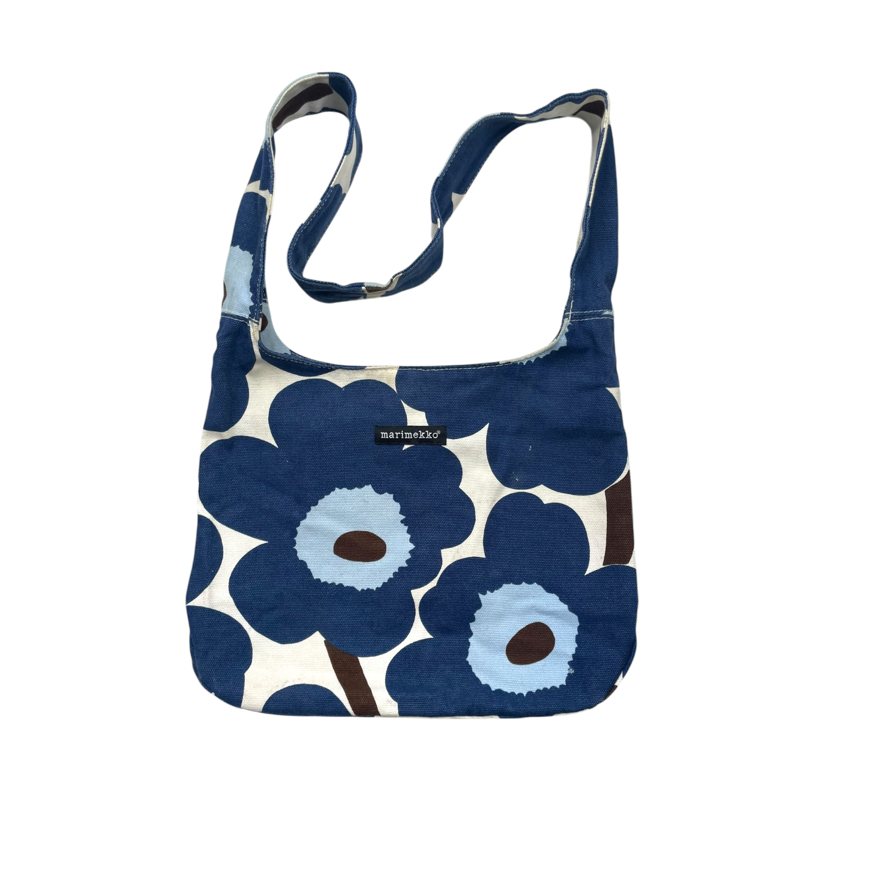Marimekko shoulder bag with one smaller pocket inside. There is a stain on the inside and a few small holes in the fabric on the front of the bag.