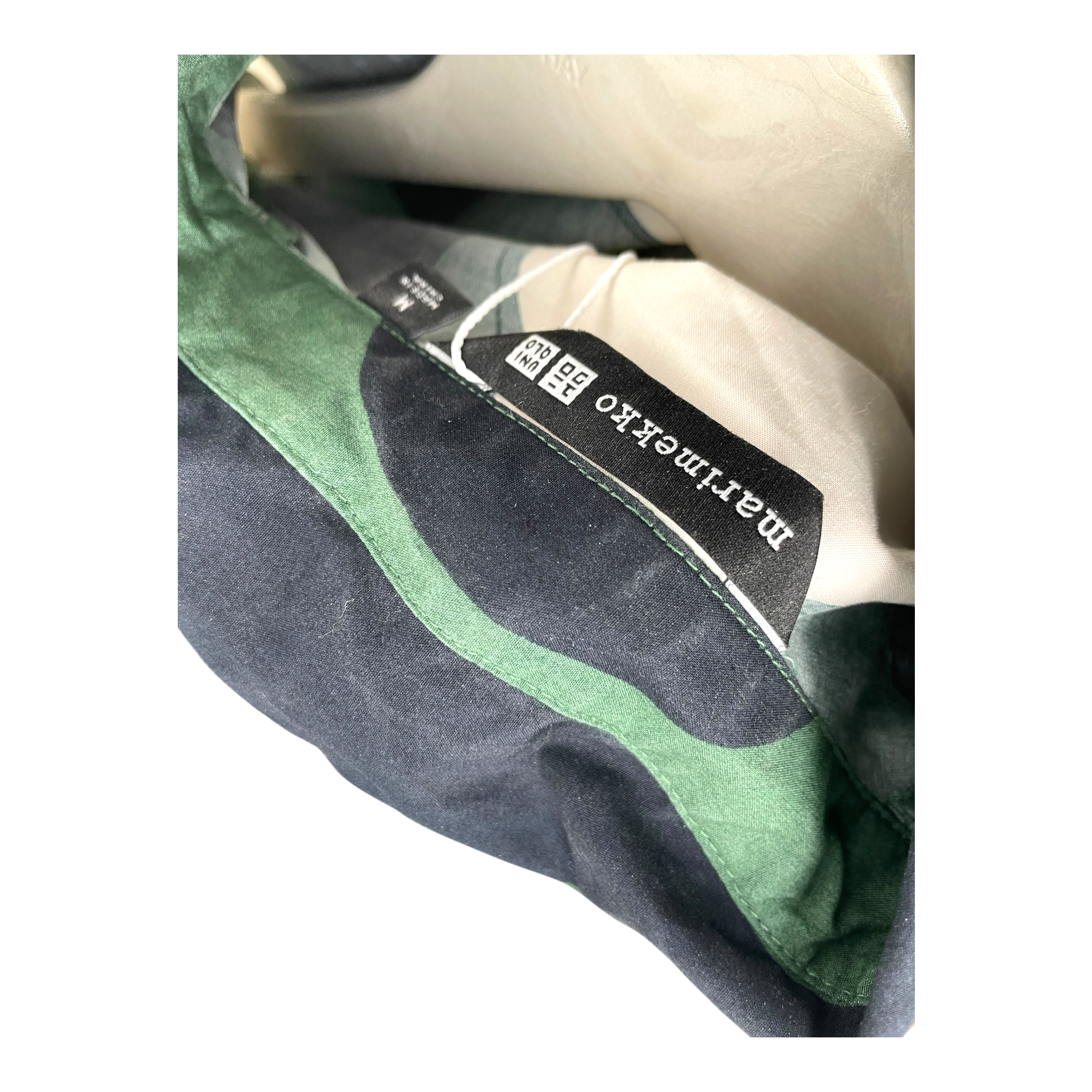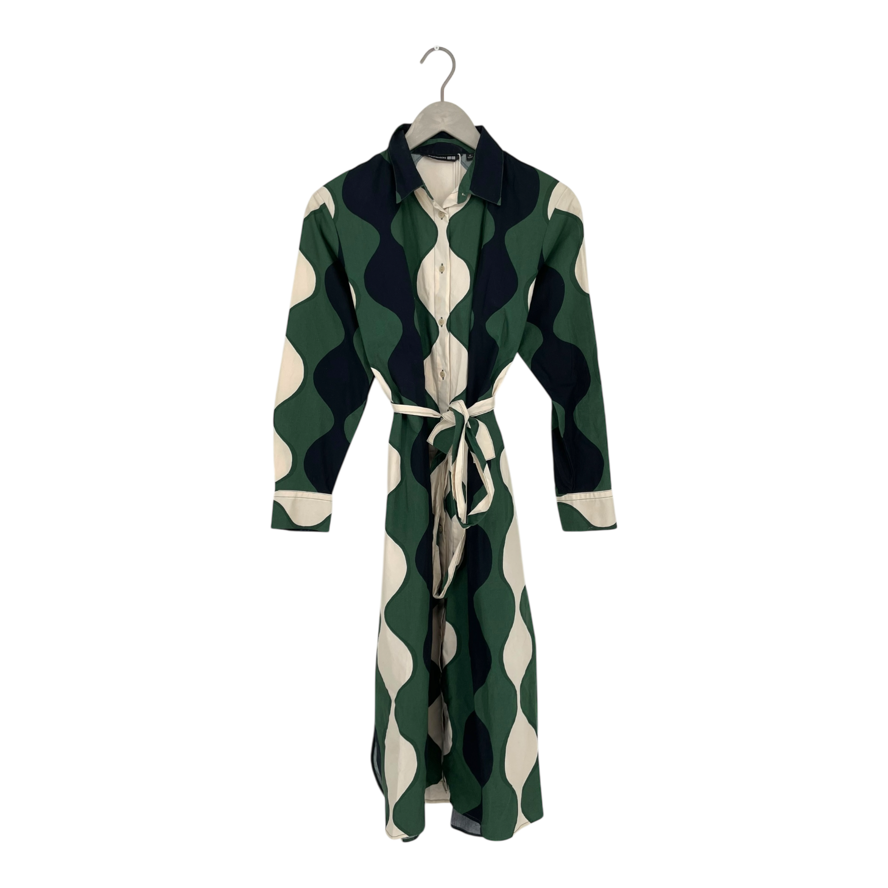 Marimekko x Uniqlo fully buttoned poplin dress with long sleeves and removable fabric belt. The fabric is somewhat stiff, either by design or from the wash.