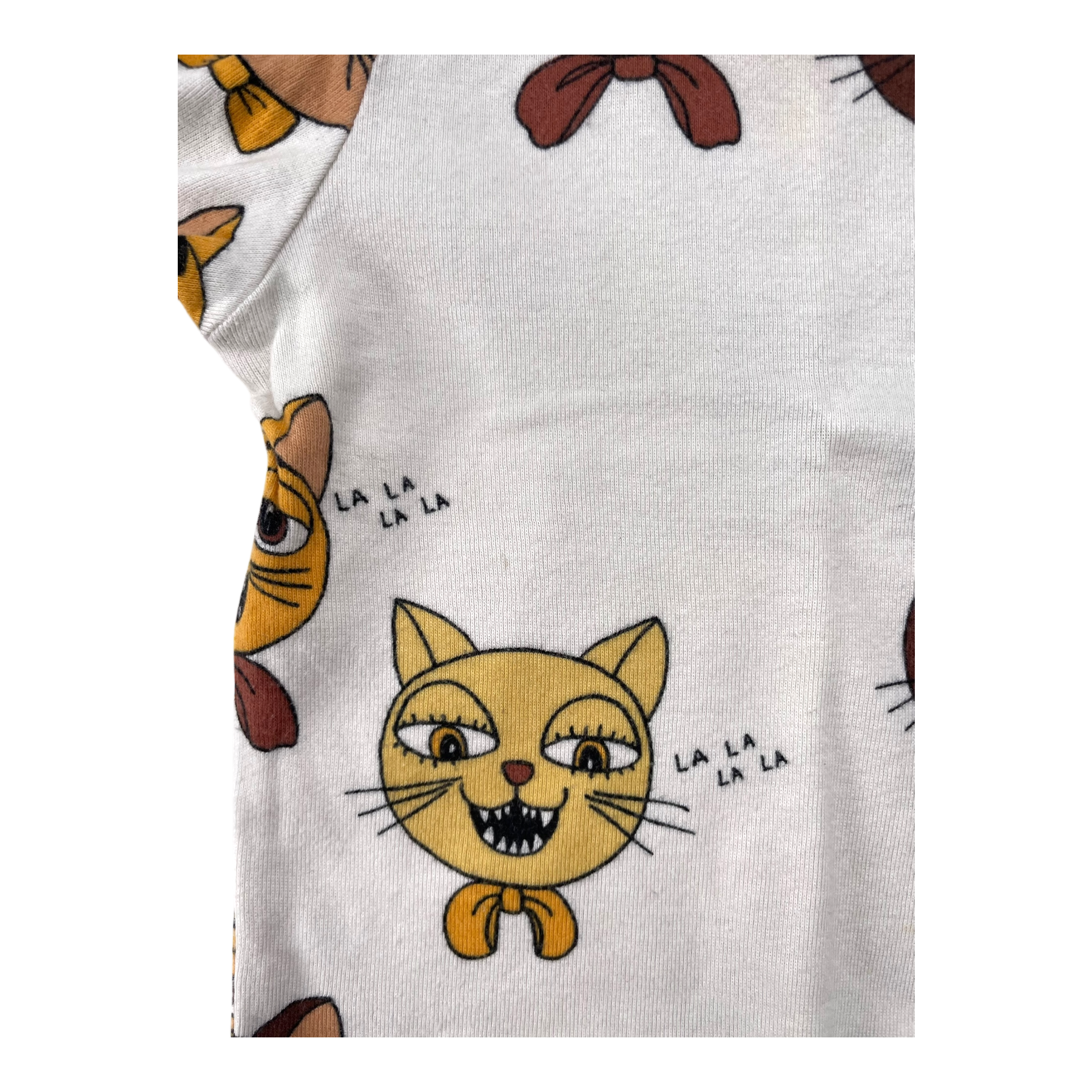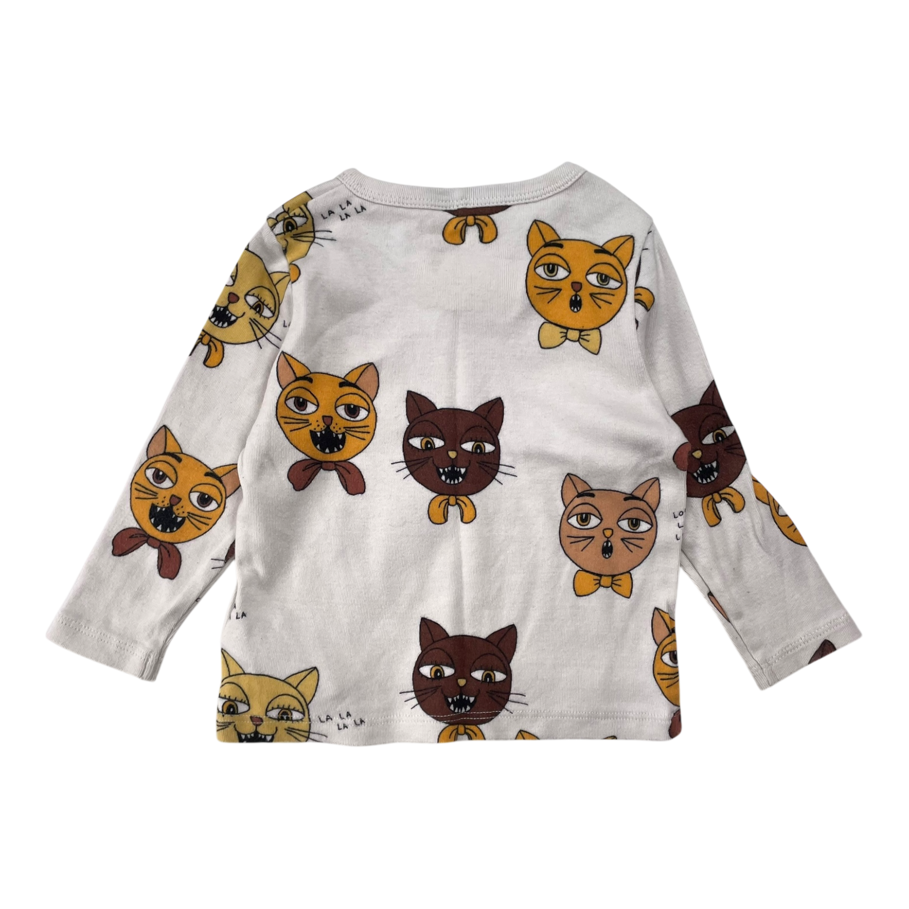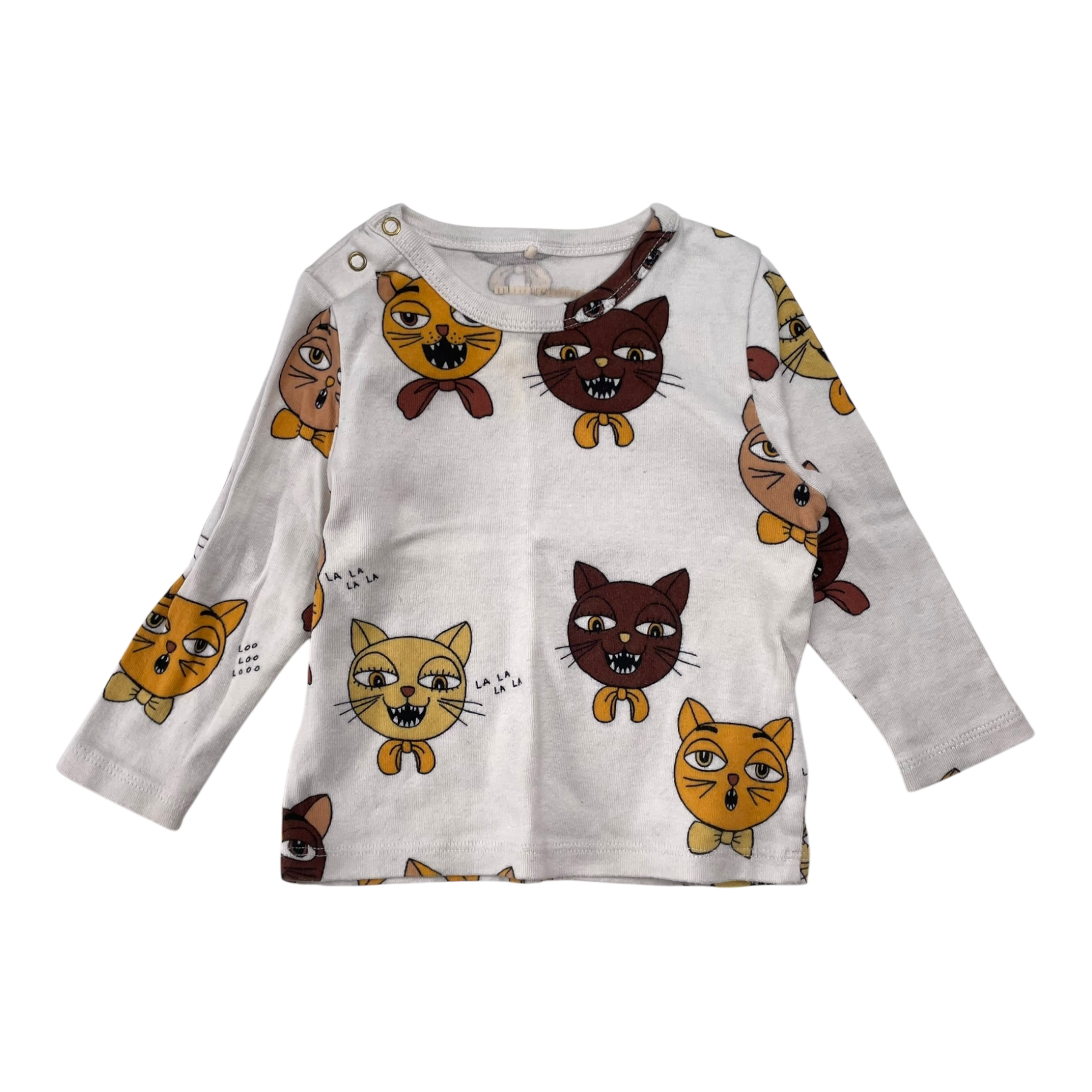 Mini Rodini long sleeve shirt in a cat print. Snap buttons on the shoulder.