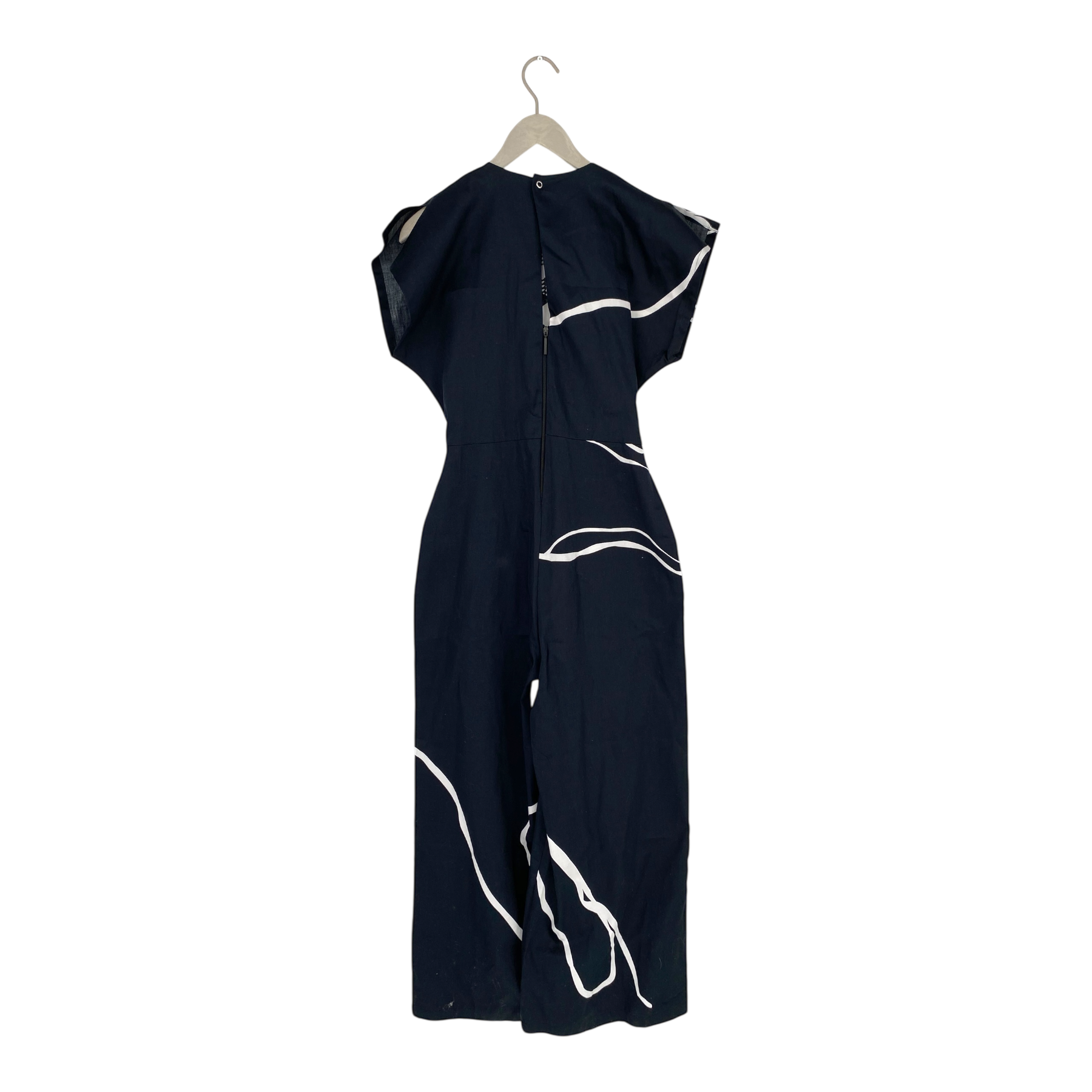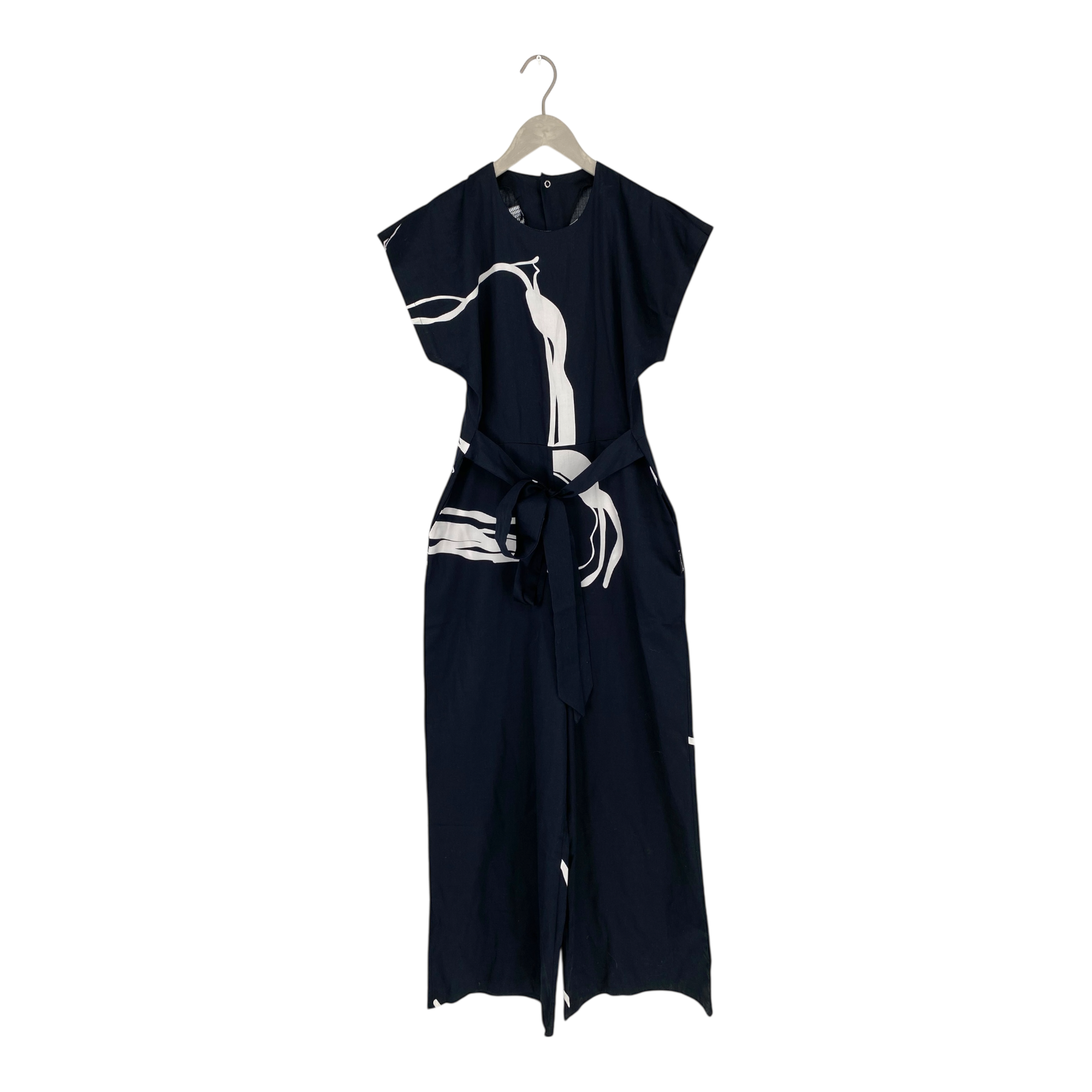 Ommellinen Pohjolan hirvi jumpsuit with belt that can be tied on front or back and side pockets. Jumpsuit has short sleeves with slits on top, snap button and zipper on the back.