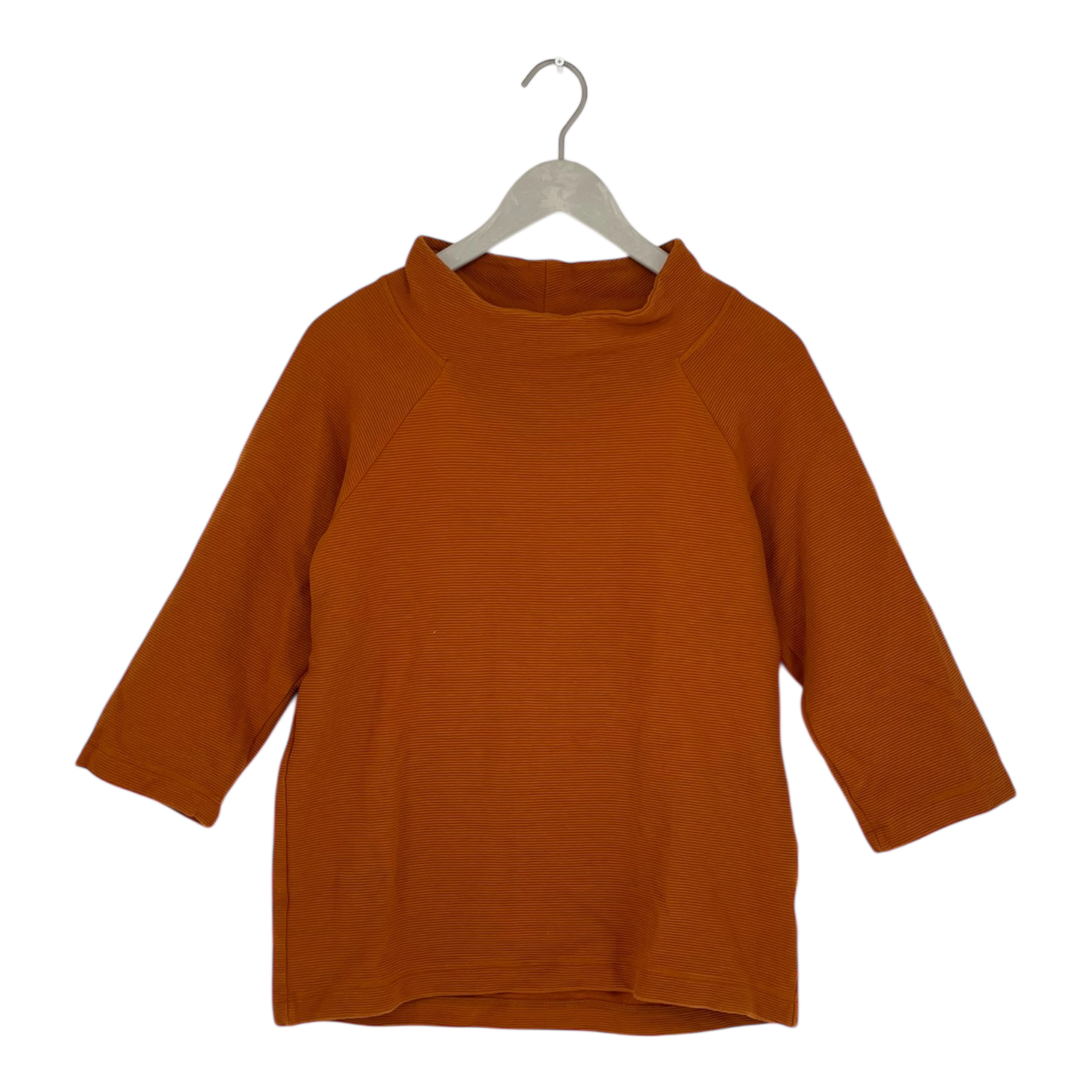 Ommellinen shirt with raised boat neck collar and 3/4 sleeves. The material of the shirt is striped.