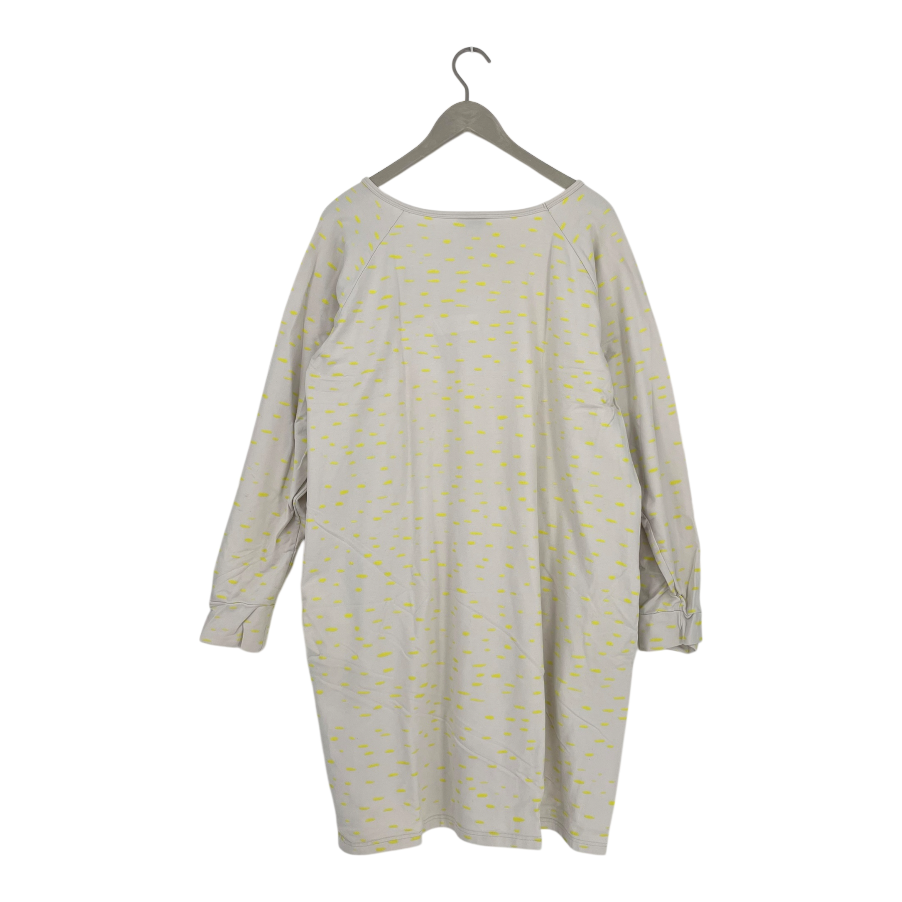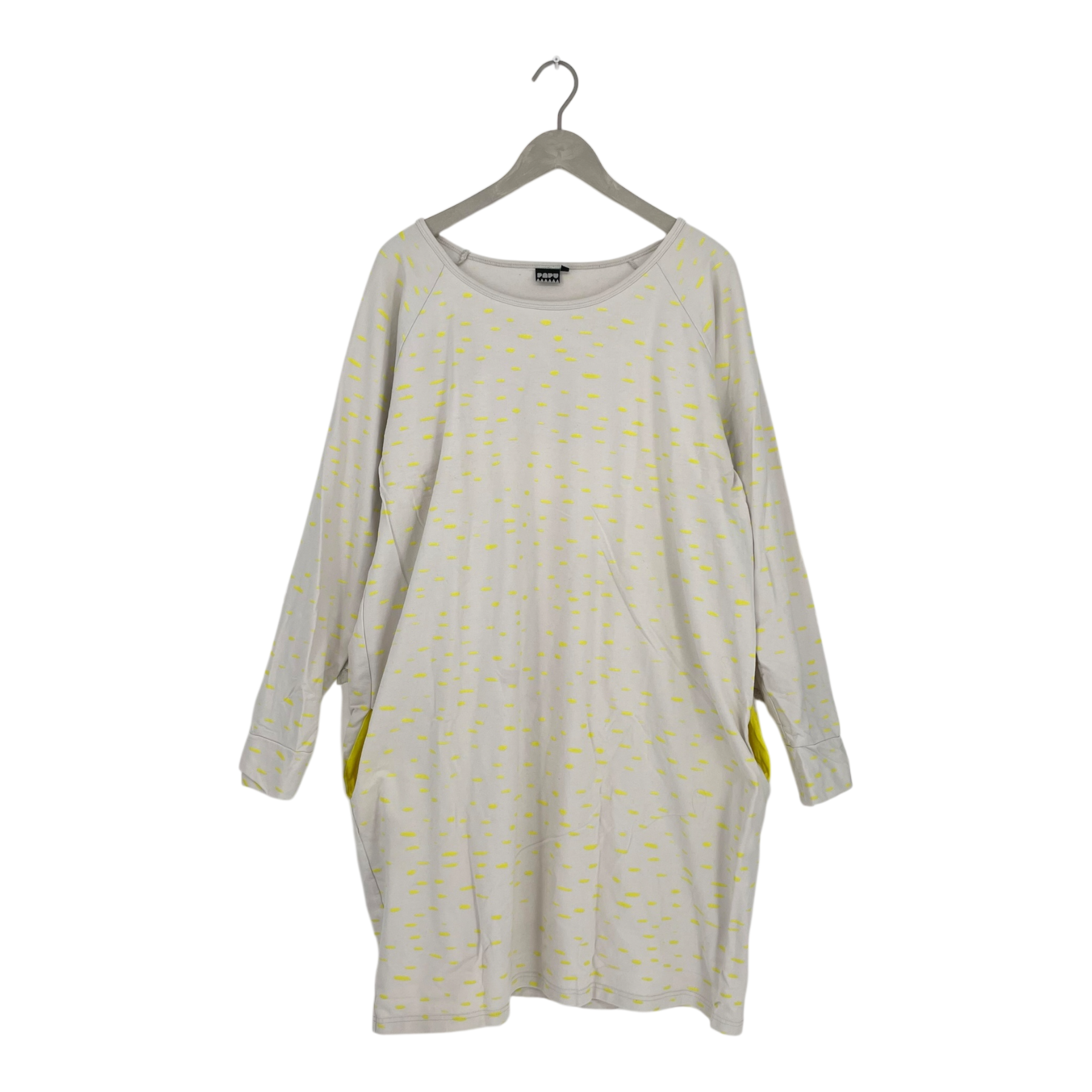Papu women's tunic dress with an oval neckline, pockets on the sides. There is a very light red mark from a sticker and some very light stains as shown.
