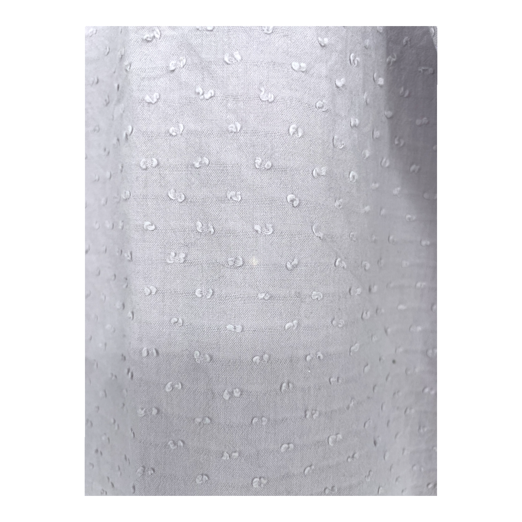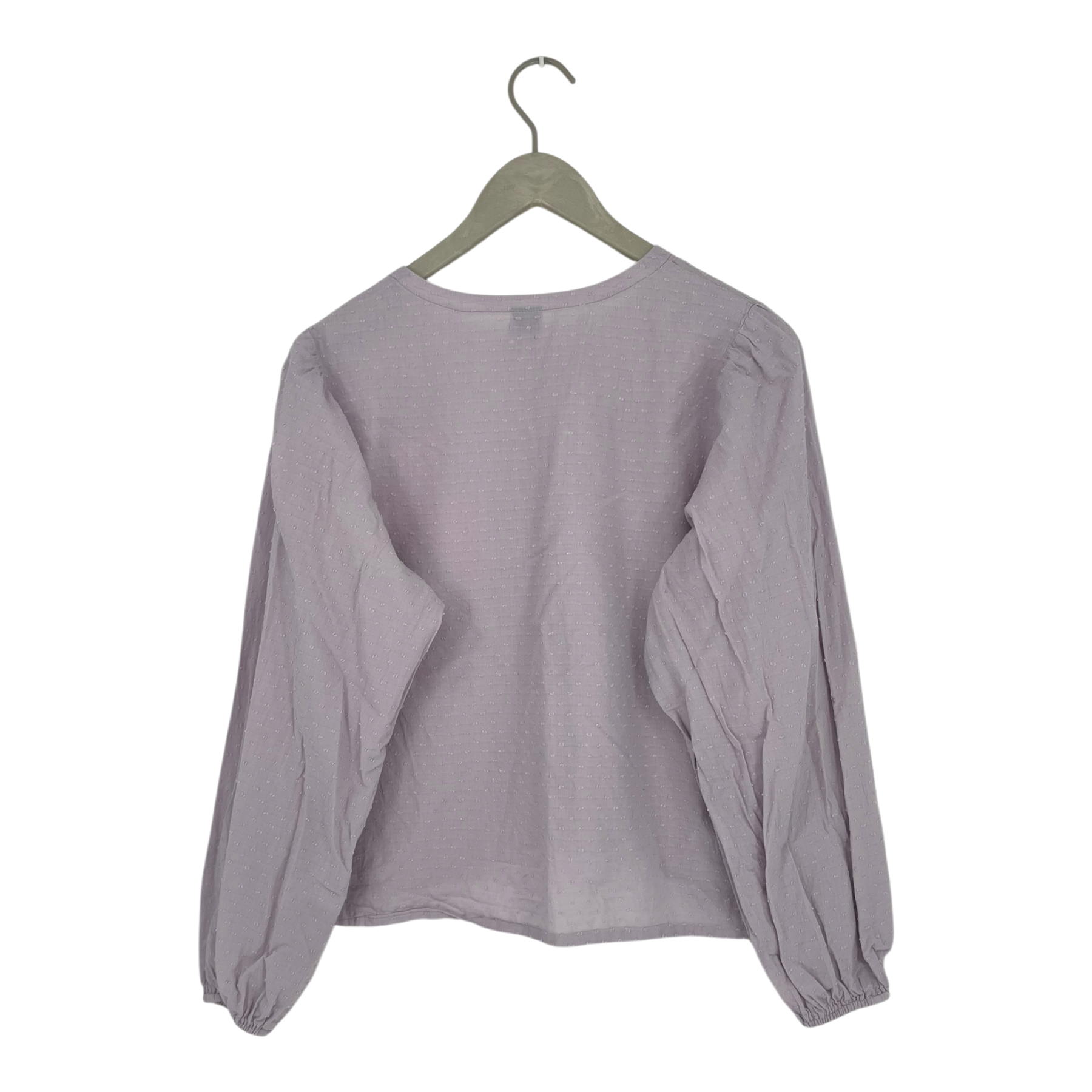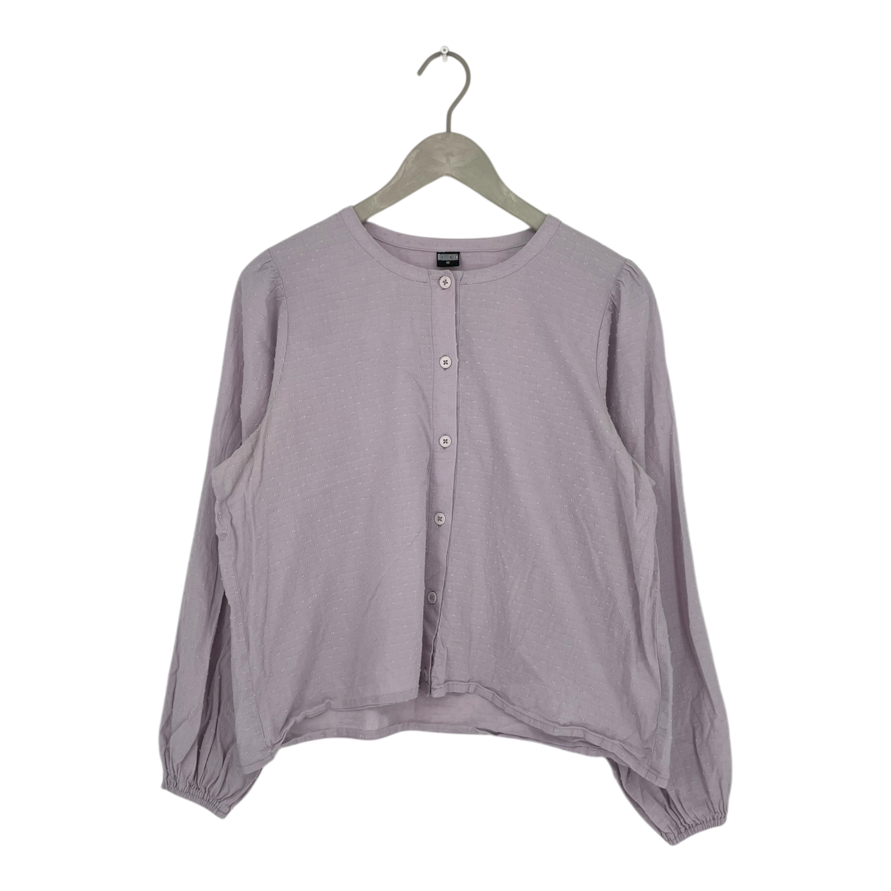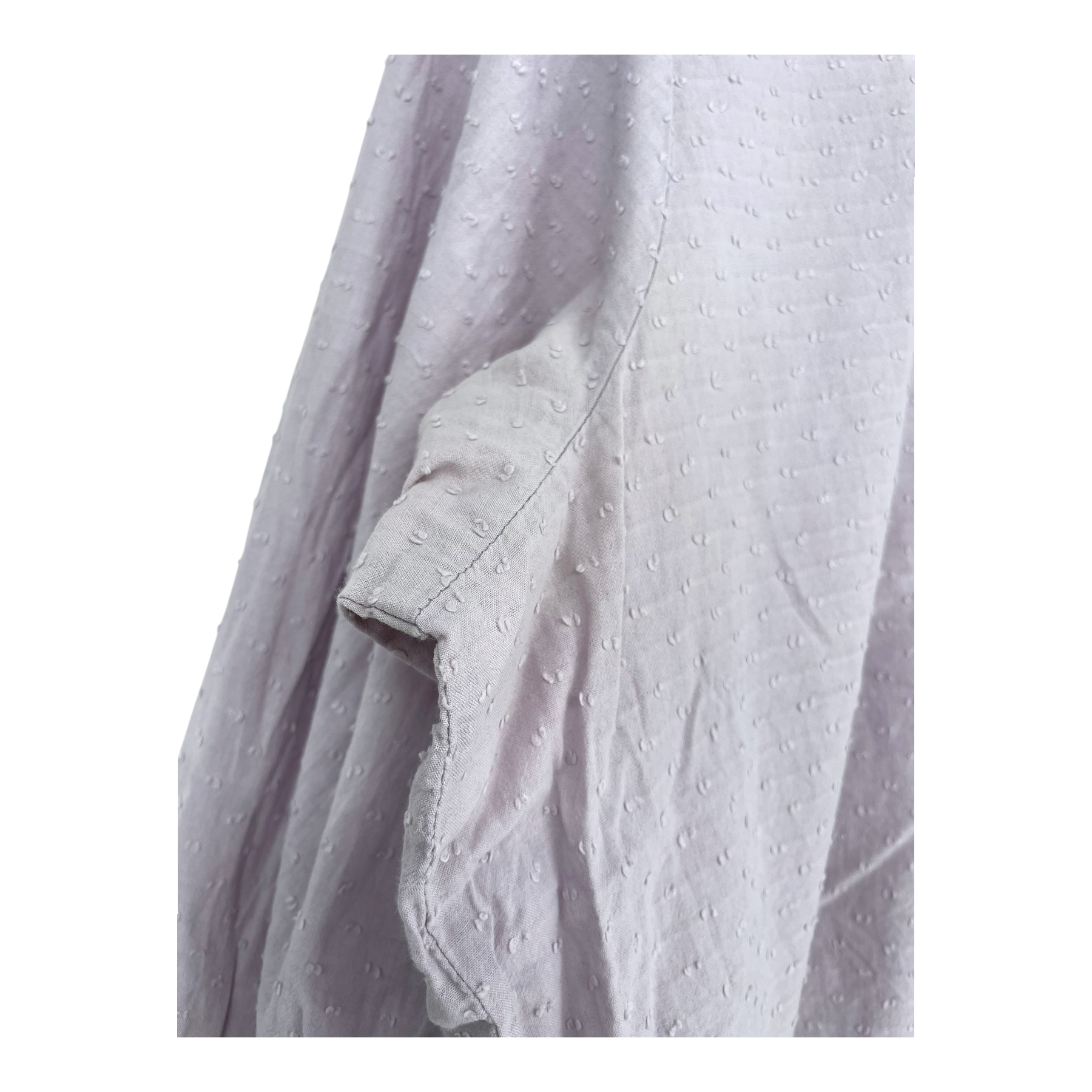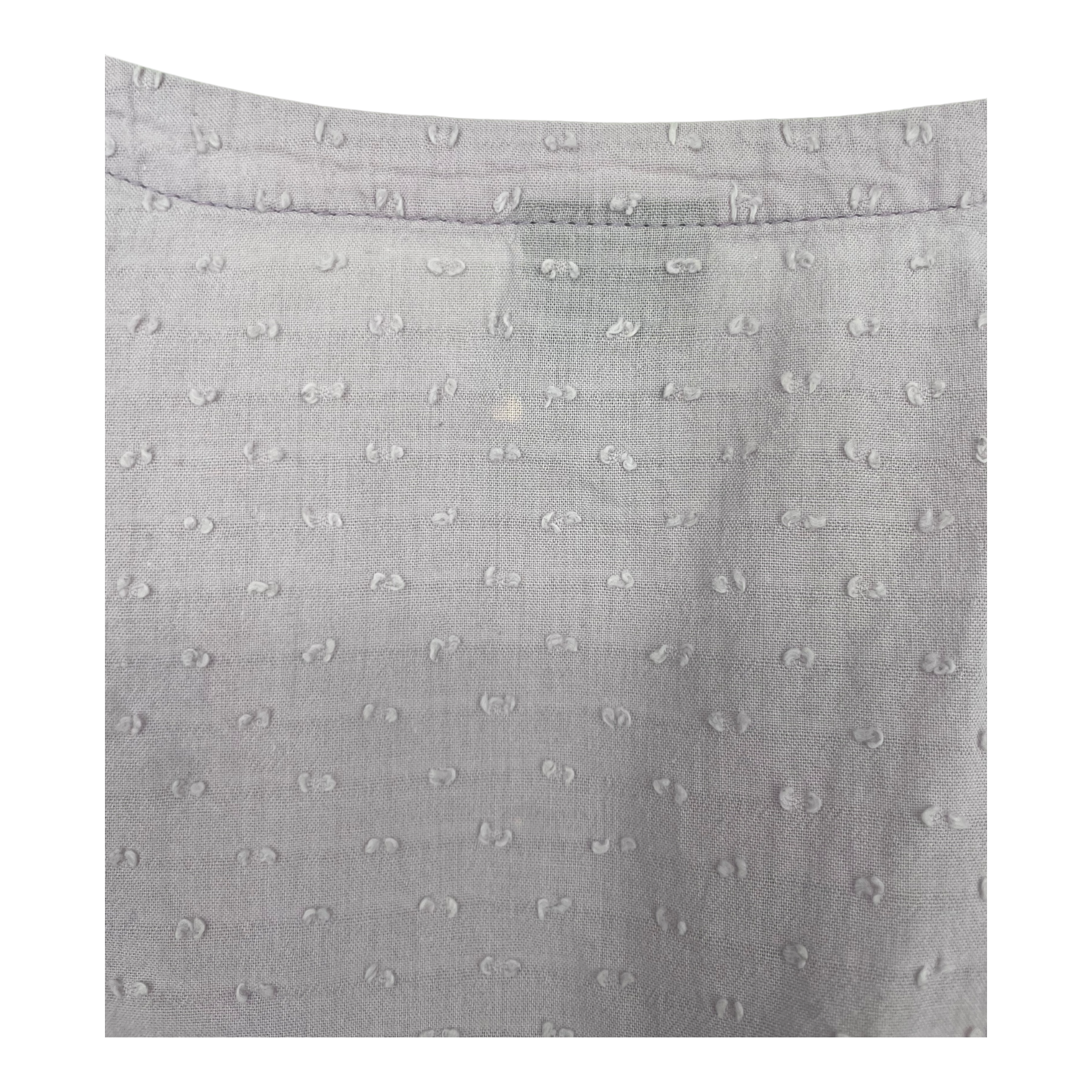 R-collection long sleeved buttoned blouse in a textured cotton fabric. The item has some stains from bleach as well as discoloration on the armpits.