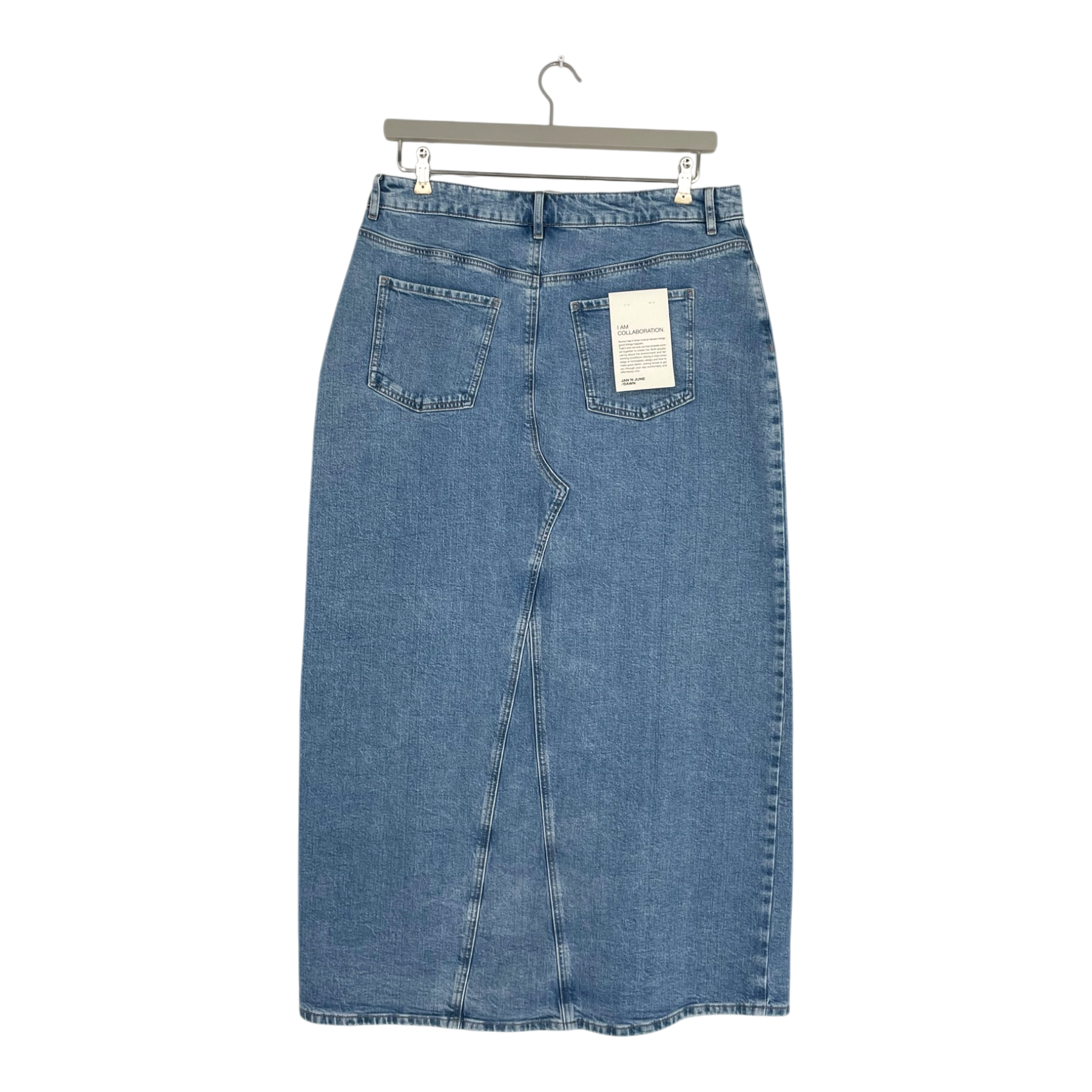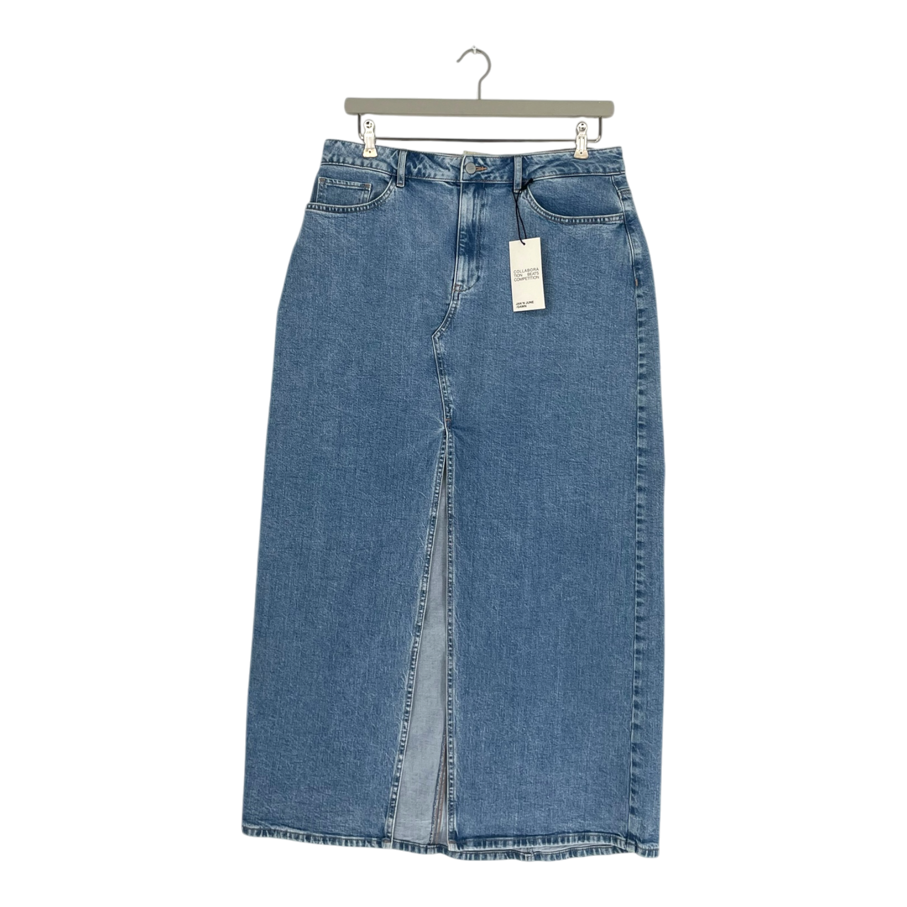 Jan 'n June luce midi denim skirt in classic mid-blue wash. Features high waist with belt loops, front and back pockets, and front slit detail. Button and zip closure. Regular fit with straight silhouette.